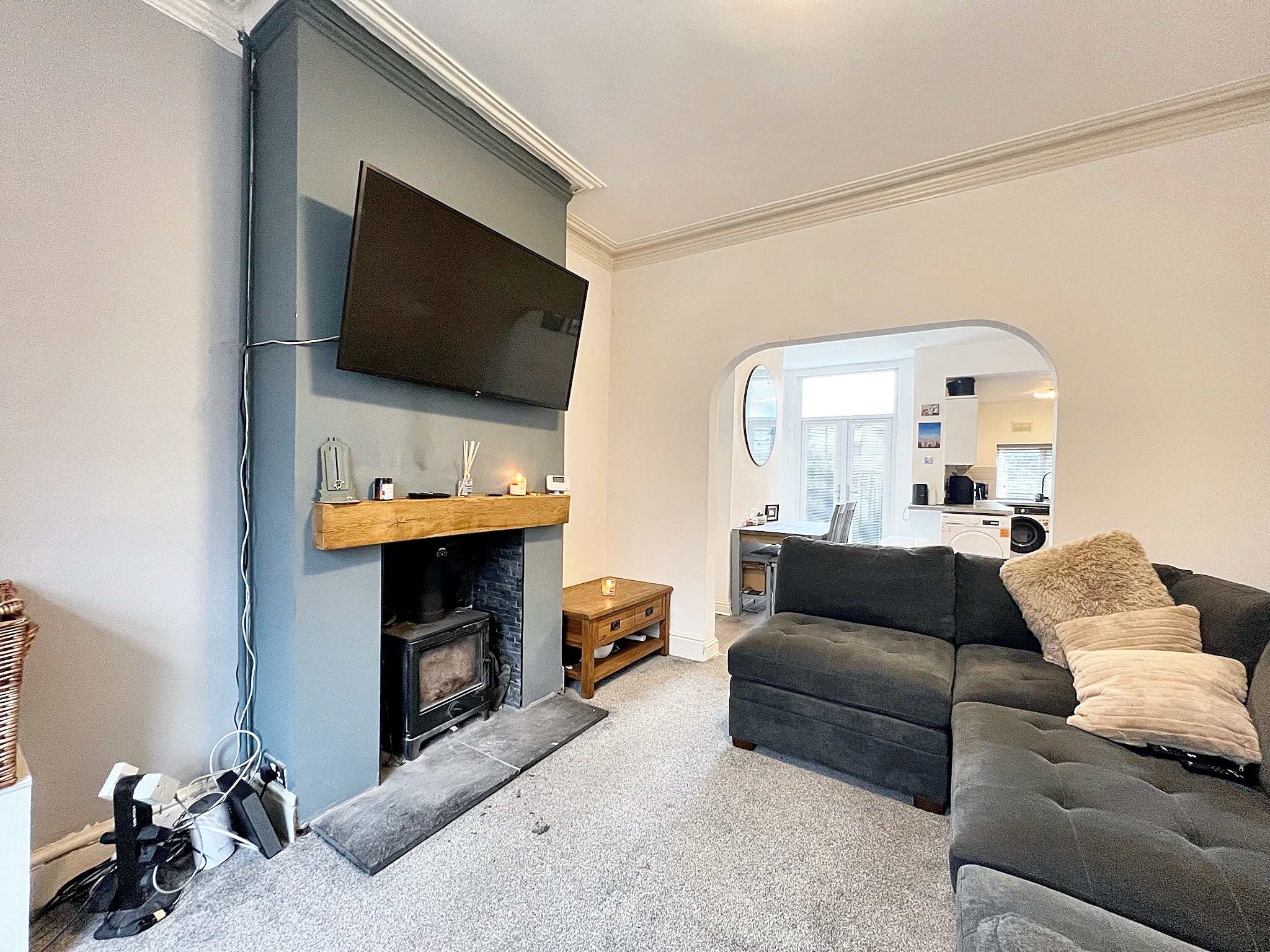 Entering into the tiled hallway which leads through to the open plan modern kitchen and dining room creating an excellent space to host. Divided by internal doors is the cosy bay fronted lounge complete with a log burner making a beautiful centre piece.