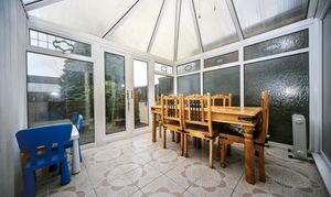 The property is approached via a private driveway with an integral garage, which has been three-quarter converted to provide a useful office and utility area while still retaining storage space. Internally, the home opens into a welcoming entrance hall leading to a good-sized kitchen. The lower ground floor has a comfortable lounge featuring an electric fireplace, and a modern four-piece family bathroom. A conservatory to the rear provides additional living space and enjoys views over the garden, comprising a patio area and a lawn, perfect for relaxing or entertaining.