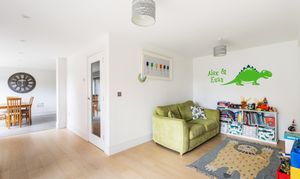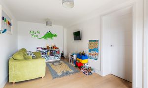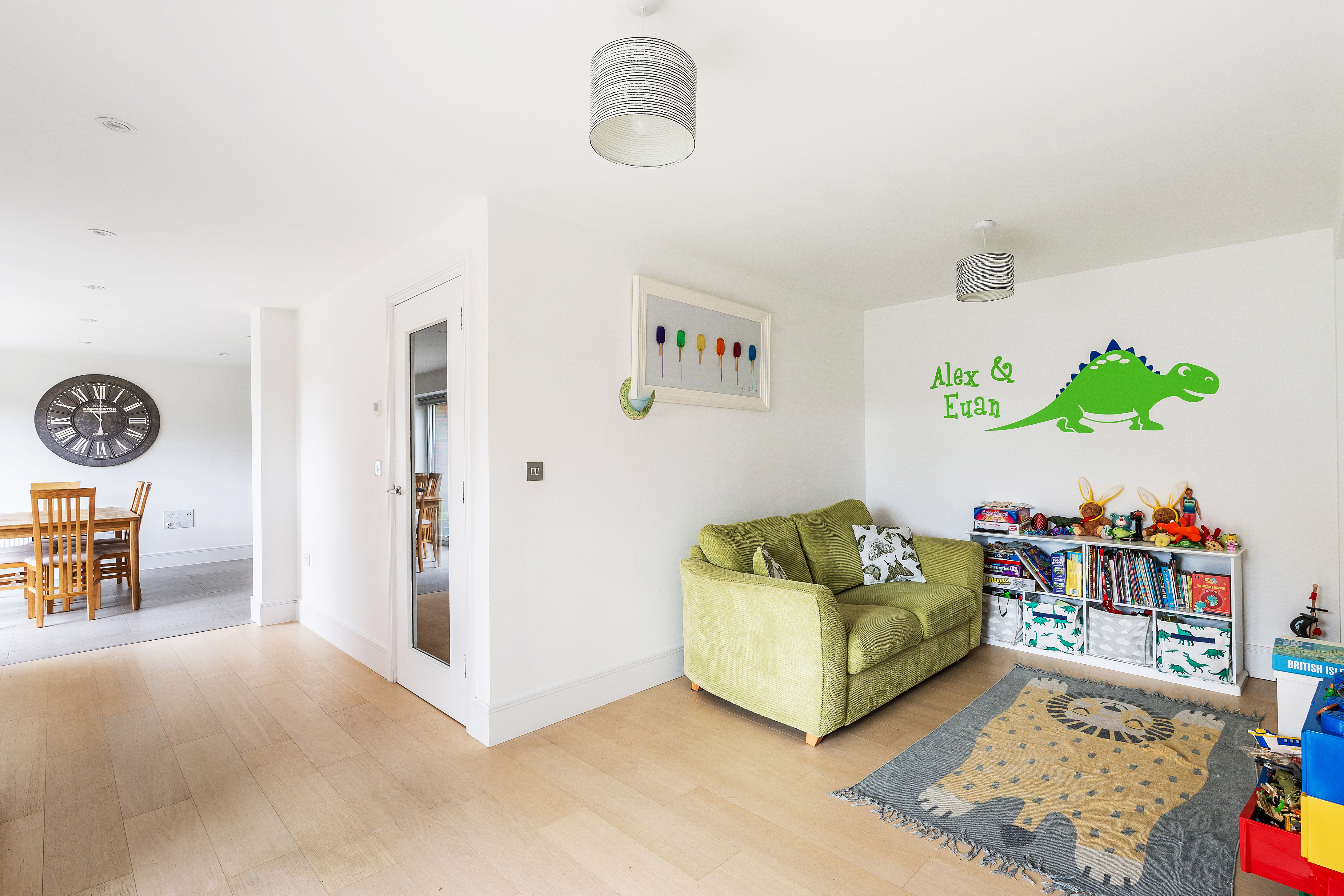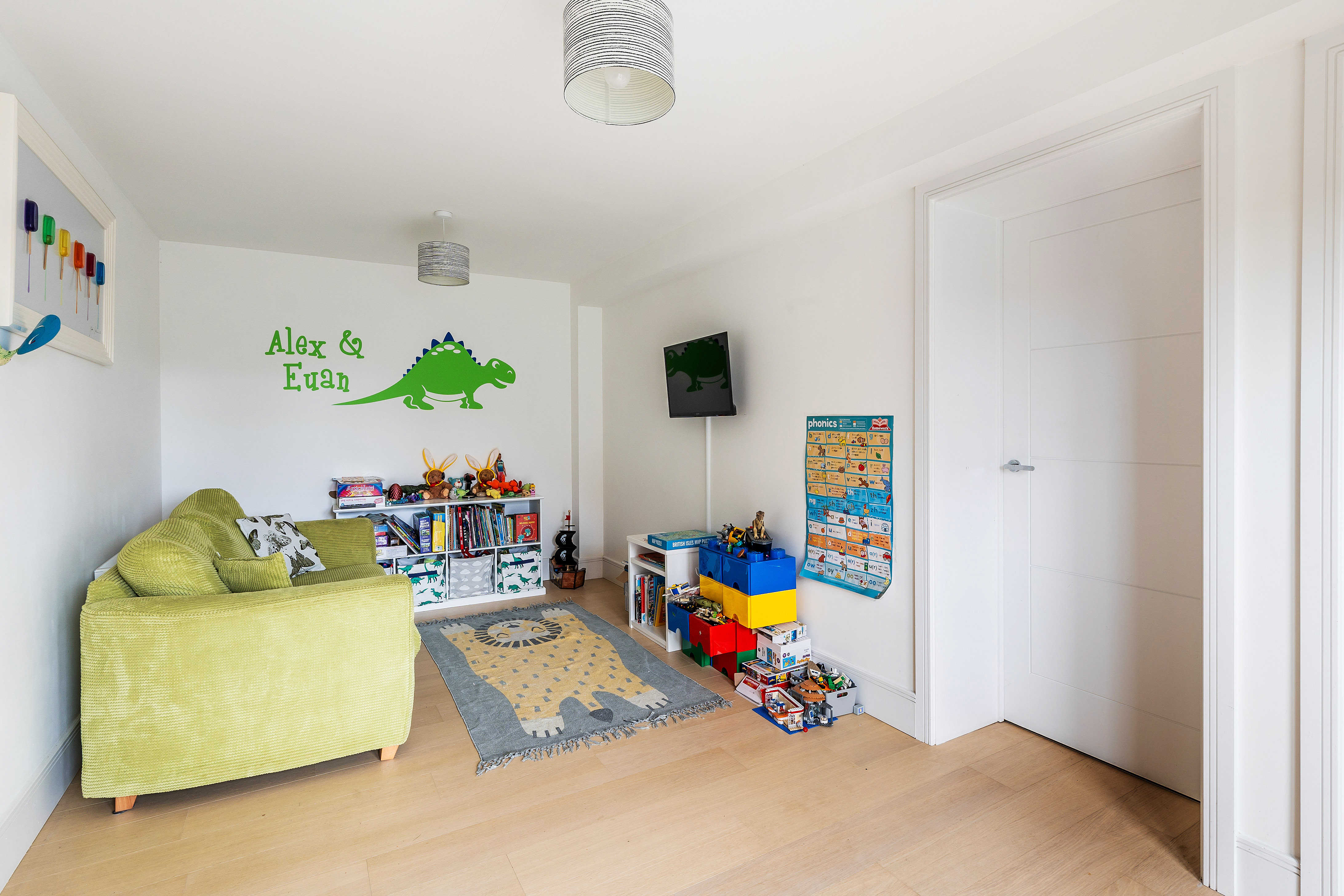 The lower ground floor is arranged around a spacious hallway and has been thoughtfully designed with everyday family living and entertaining in mind. The play room opens directly onto the rear garden through double doors and flows seamlessly into the kitchen dining area. The kitchen is fitted with a range of stylish shaker style units complemented by stone work surfaces and a breakfast bar. Integrated Siemens appliances include a double oven, fridge freezer and dishwasher, together with a five ring ceramic hob and extractor. Bi folding doors open onto the south facing garden, creating a natural connection between indoor and outdoor space. A utility room, additional cloakroom and a generous office, which could also serve as a fifth bedroom if required, provide excellent versatility for modern living.