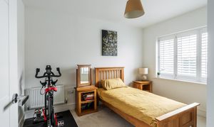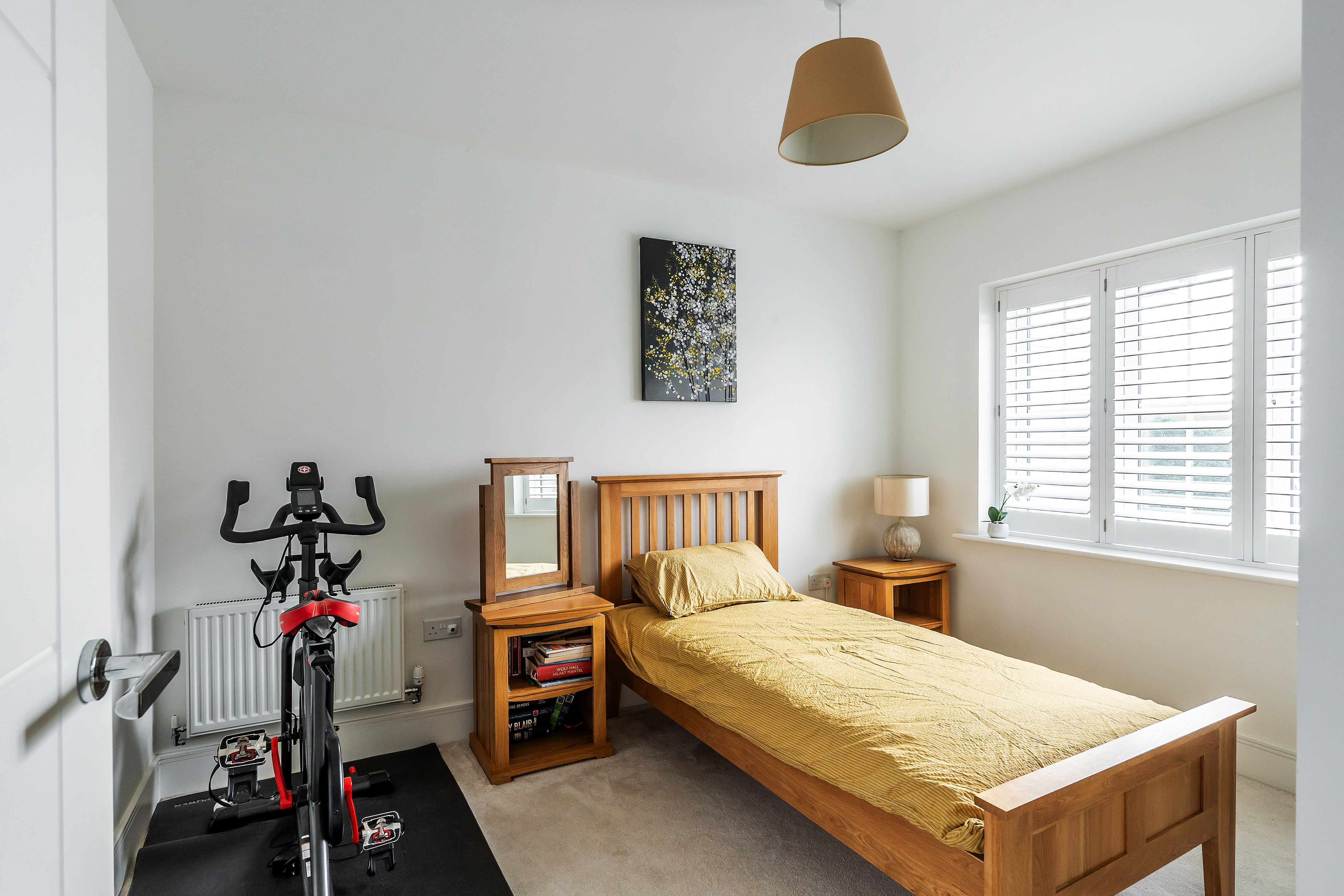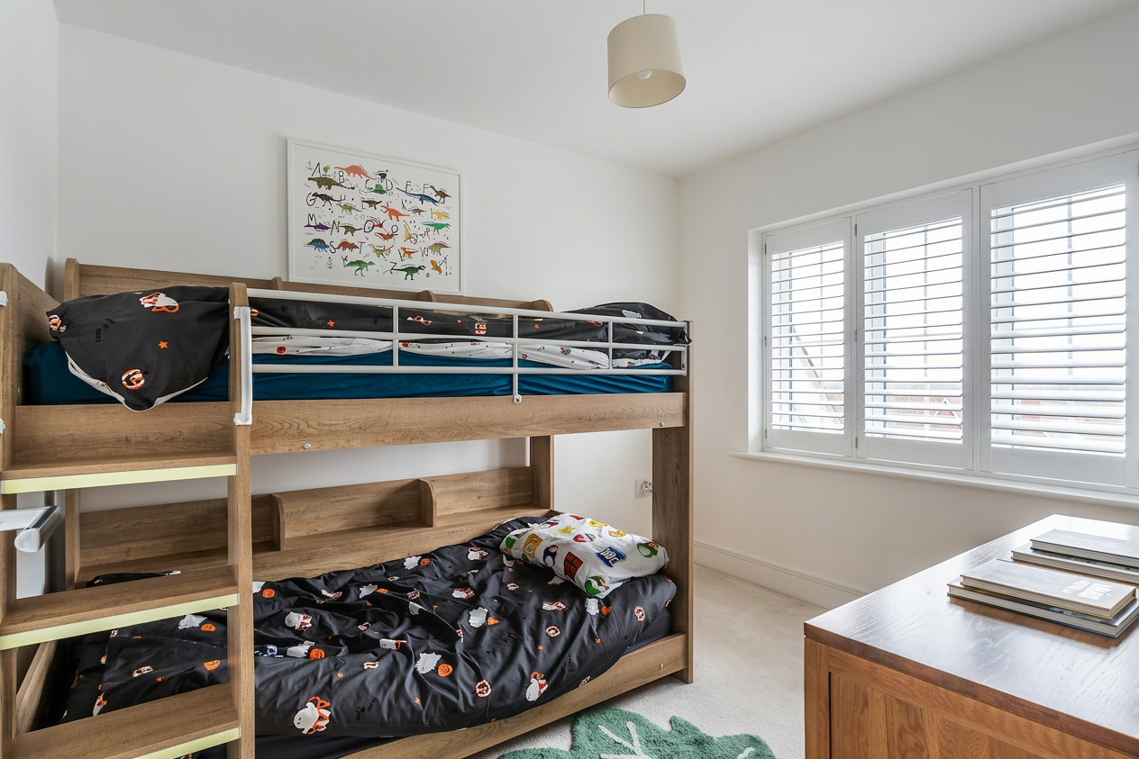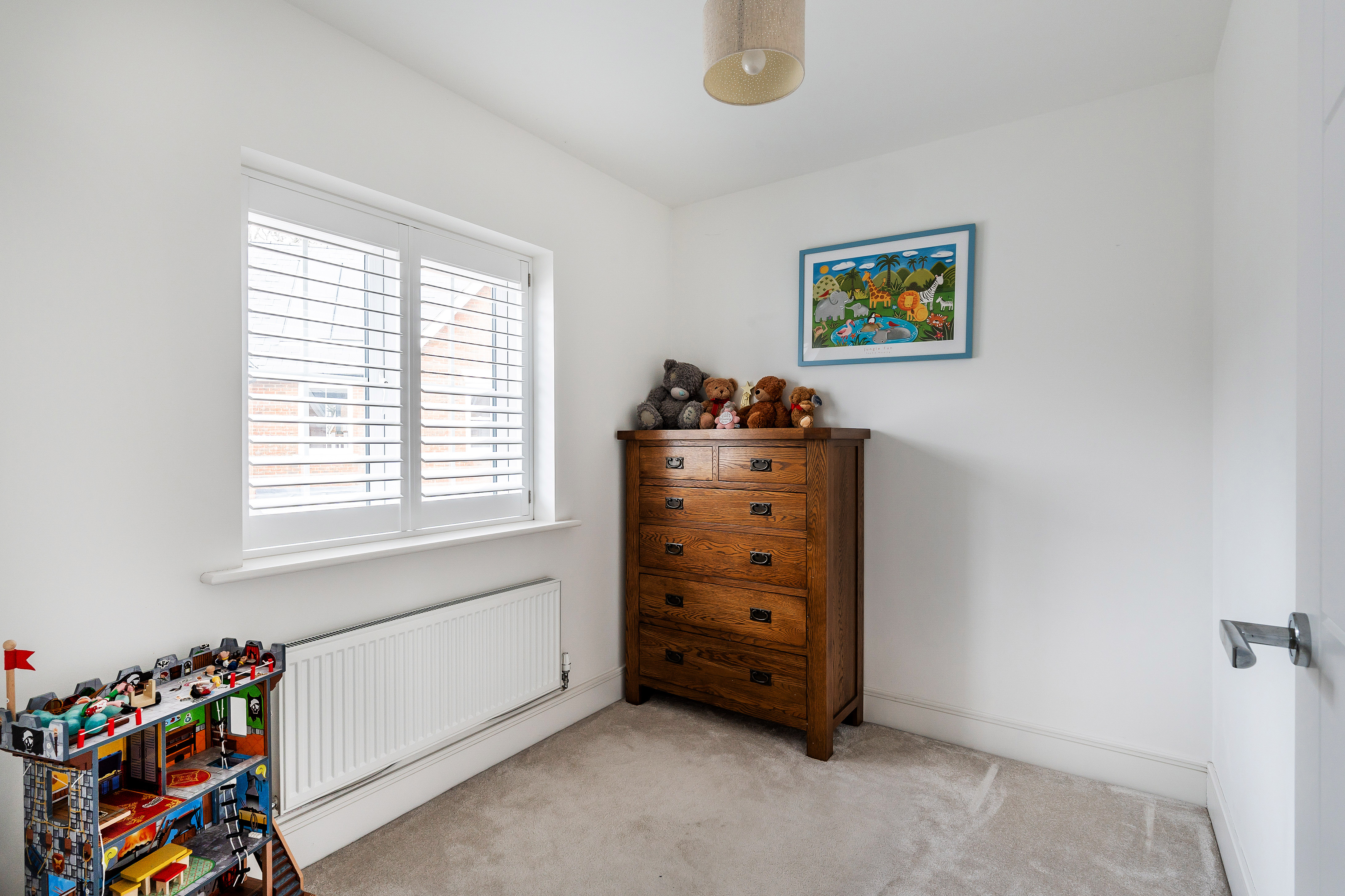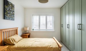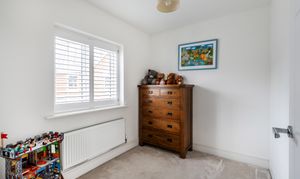 The entrance hall creates an immediate sense of space and leads through to the principal reception room. The sitting room enjoys a double aspect with windows to the front and rear fitted with plantation shutters, while a fireplace with wood burning stove provides a warm focal point. Also on this level is bedroom four, a generous room with fitted wardrobes and its own en-suite shower room, making it ideal for guests, older children or multi-generational living. A separate cloakroom completes the floor.
