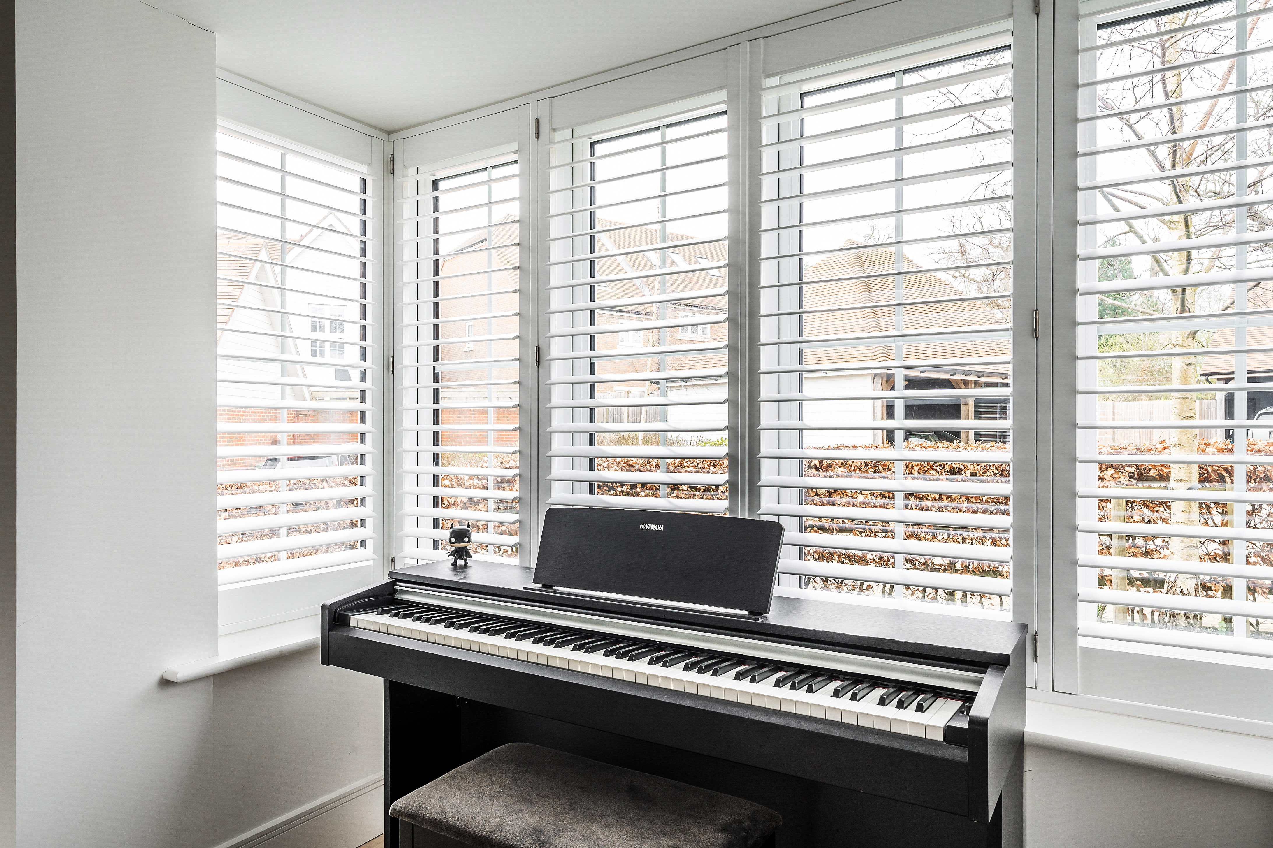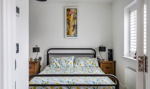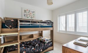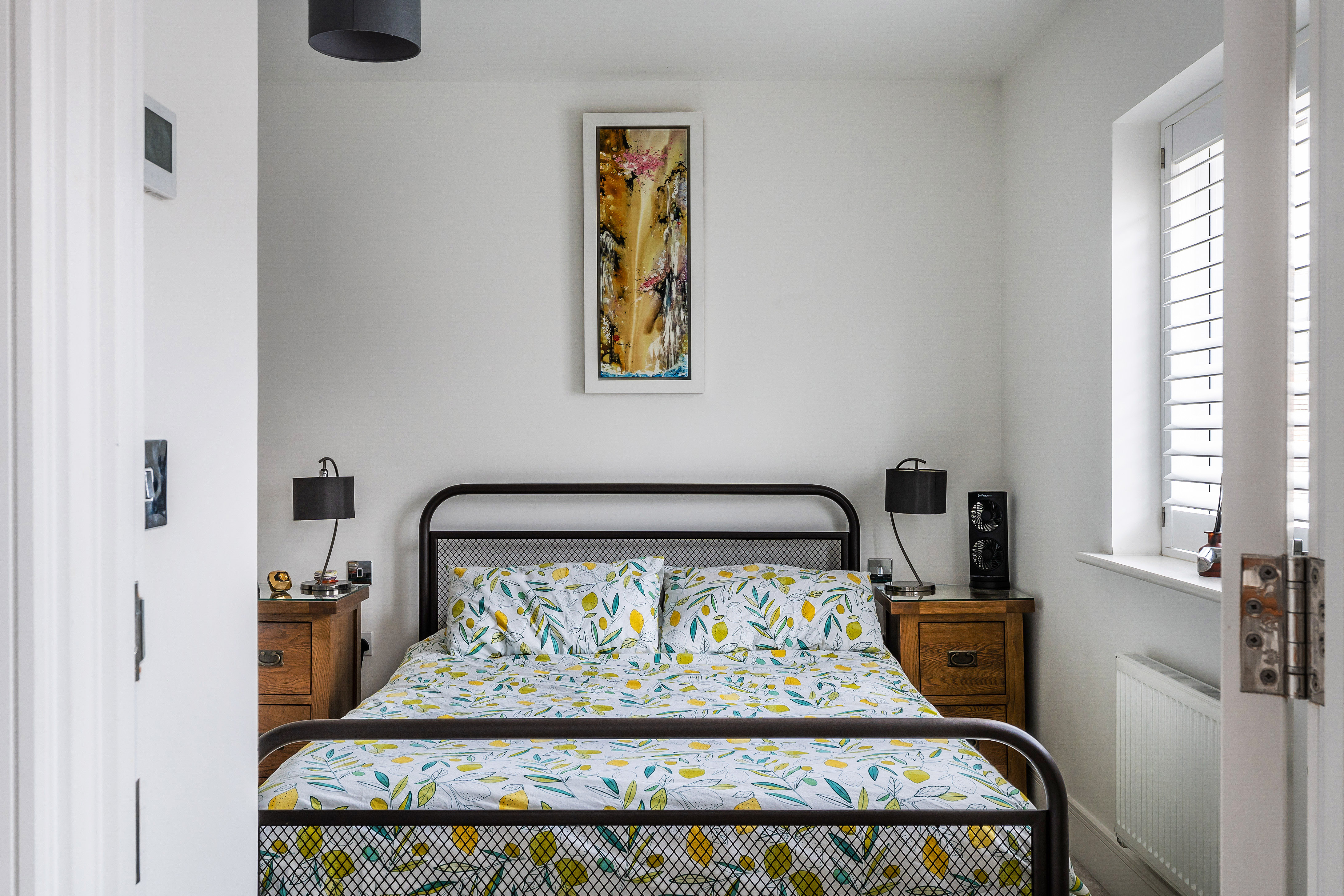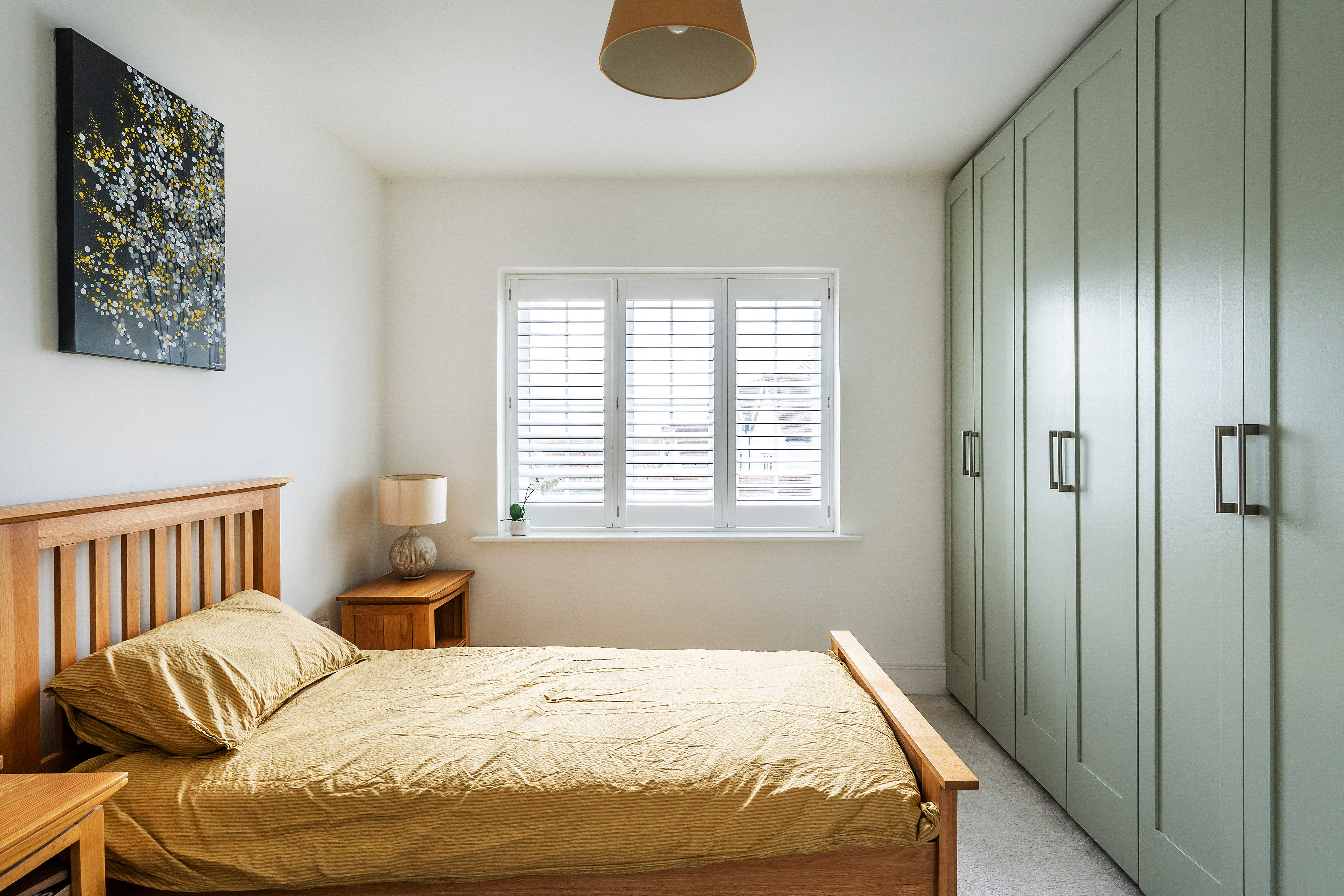 The entrance hall creates an immediate sense of space and leads through to the principal reception room. The sitting room enjoys a double aspect with windows to the front and rear fitted with plantation shutters, while a fireplace with wood burning stove provides a warm focal point. Also on this level is bedroom four, a generous room with fitted wardrobes and its own en-suite shower room, making it ideal for guests, older children or multi-generational living. A separate cloakroom completes the floor.