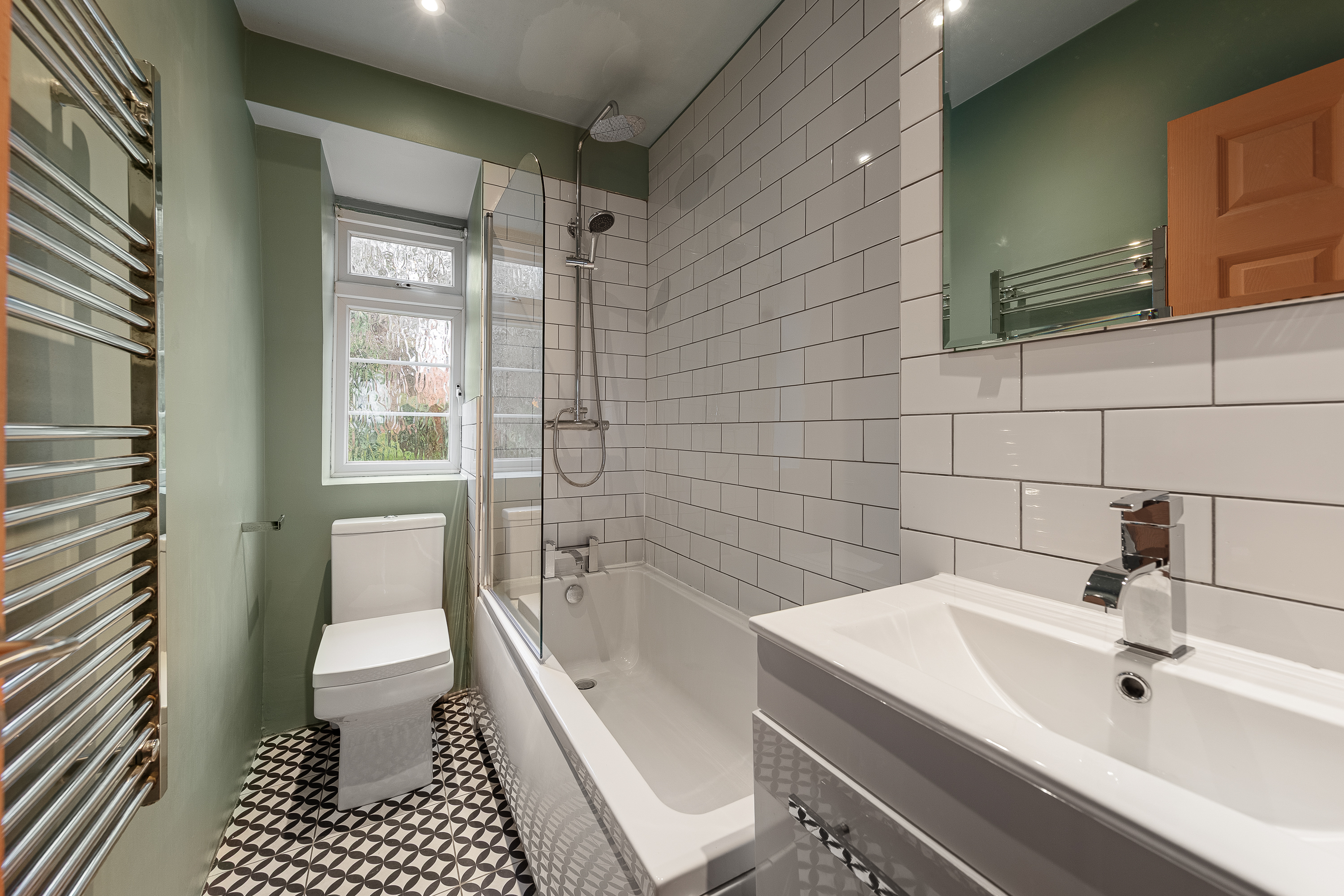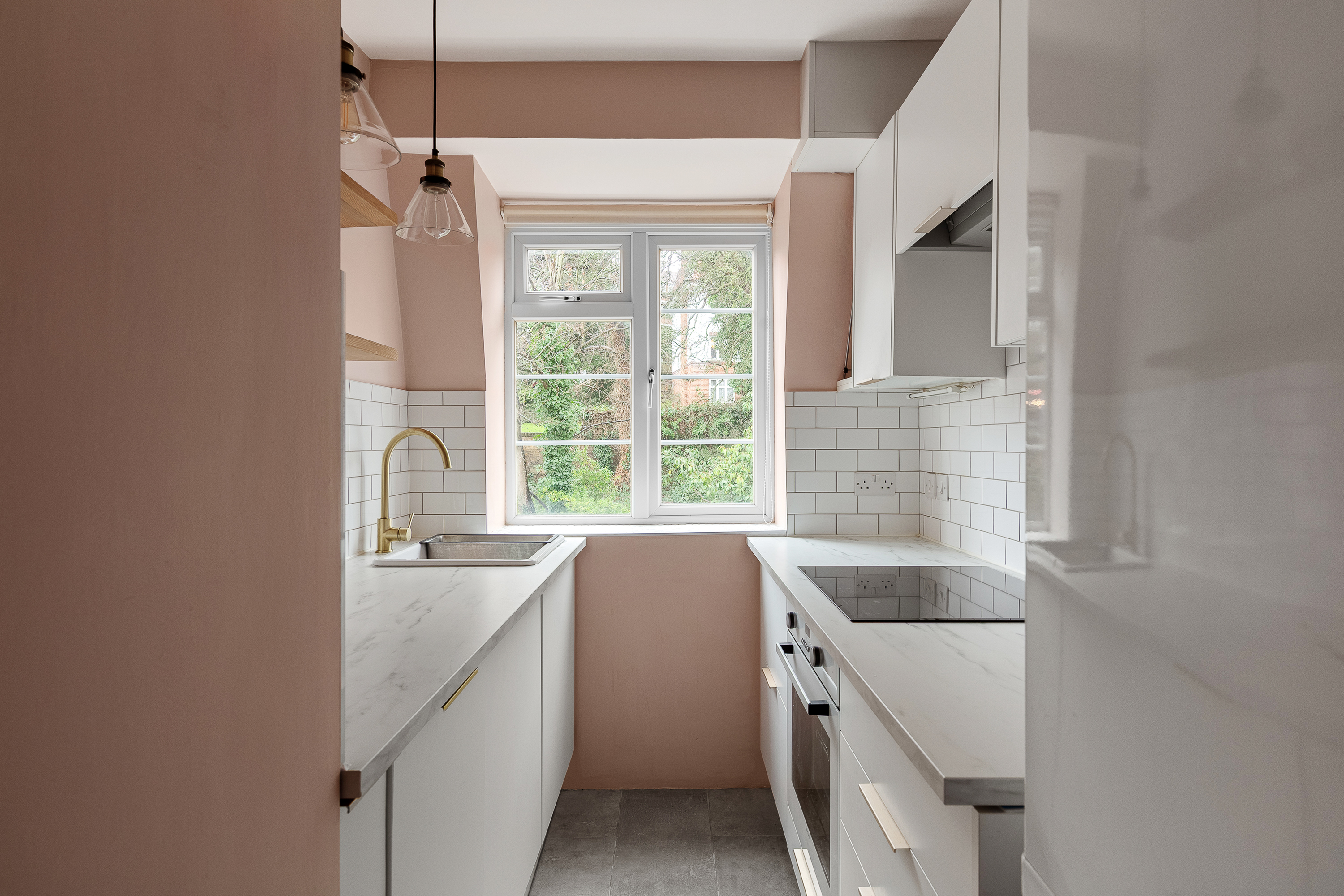 The kitchen is modern and contemporary, with a southeastern aspect, making it lovely and bright at the start of the day. Arranged in a galley configuration, the kitchen has a generous amount of worktop space and great storage, as well as an integrated dishwasher. The aesthetic here is very pretty, the brass tap contrasting nicely against the worktops and crisp white metro tiles.