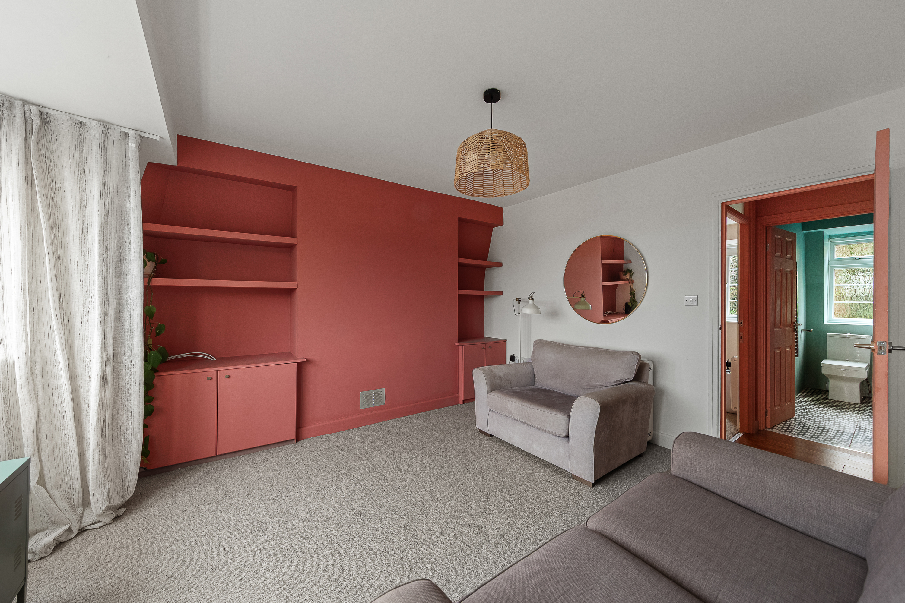 Accommodation-wise, the living room is a charming room with a shallow bay window, allowing for a dining table, and the window frames that view incredibly well (on a clear day, the view is incredible, but currently the weather hasn’t allowed us to fully capture that view in the photos). There’s room for a couple of two or three-seater sofas, or a larger L shape if wanted.