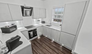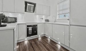 Boasting two spacious bedrooms and two modern bathrooms, this apartment offers the perfect blend of comfort and functionality. The interiors are tastefully decorated, featuring a neutral colour palette throughout, creating a light and airy ambience. The carpeted living and dining area are thoughtfully designed to maximise space and comfort, ideal for both relaxing and entertaining guests. With a Juliet balcony, enjoy views over the development. The kitchen has been fully renovated with grey gloss wall and base units, granite worktops with built-in appliances including oven and hob with extractor fan, and integrated appliances such as fridge/freezer, dishwasher and washing machine. Tastefully concealed lighting highlights the attention to detail in this kitchen.