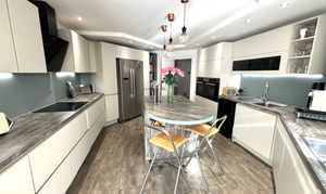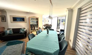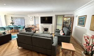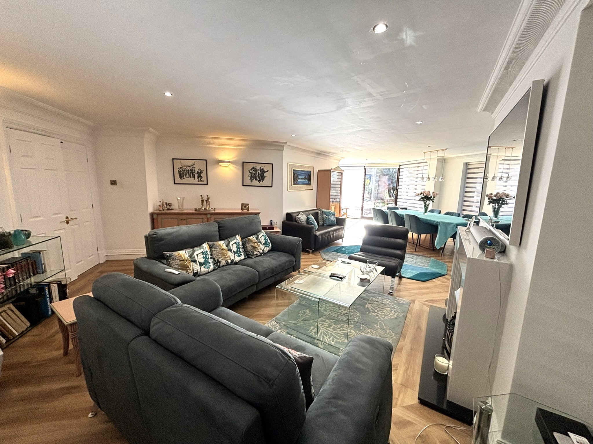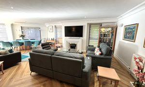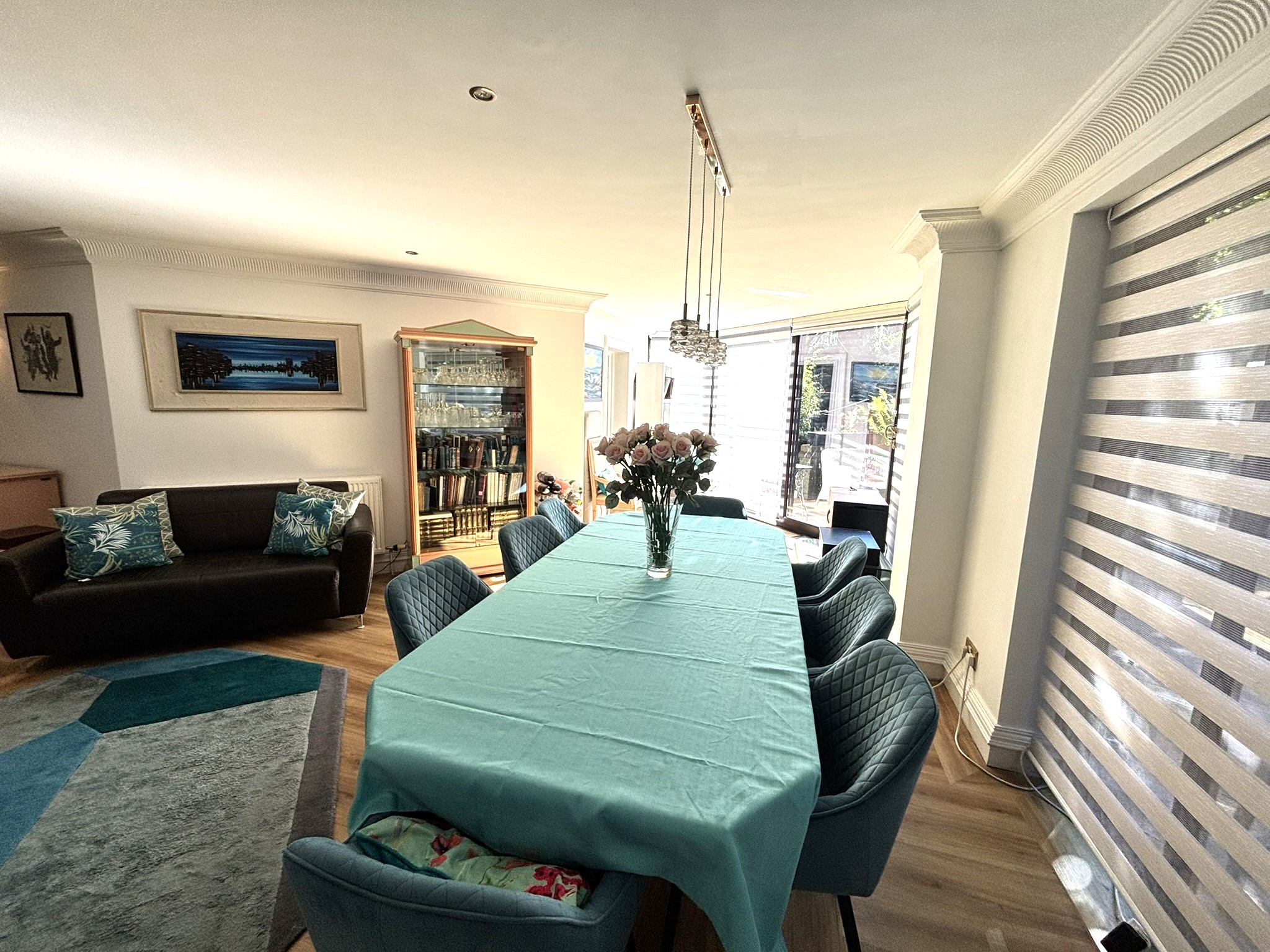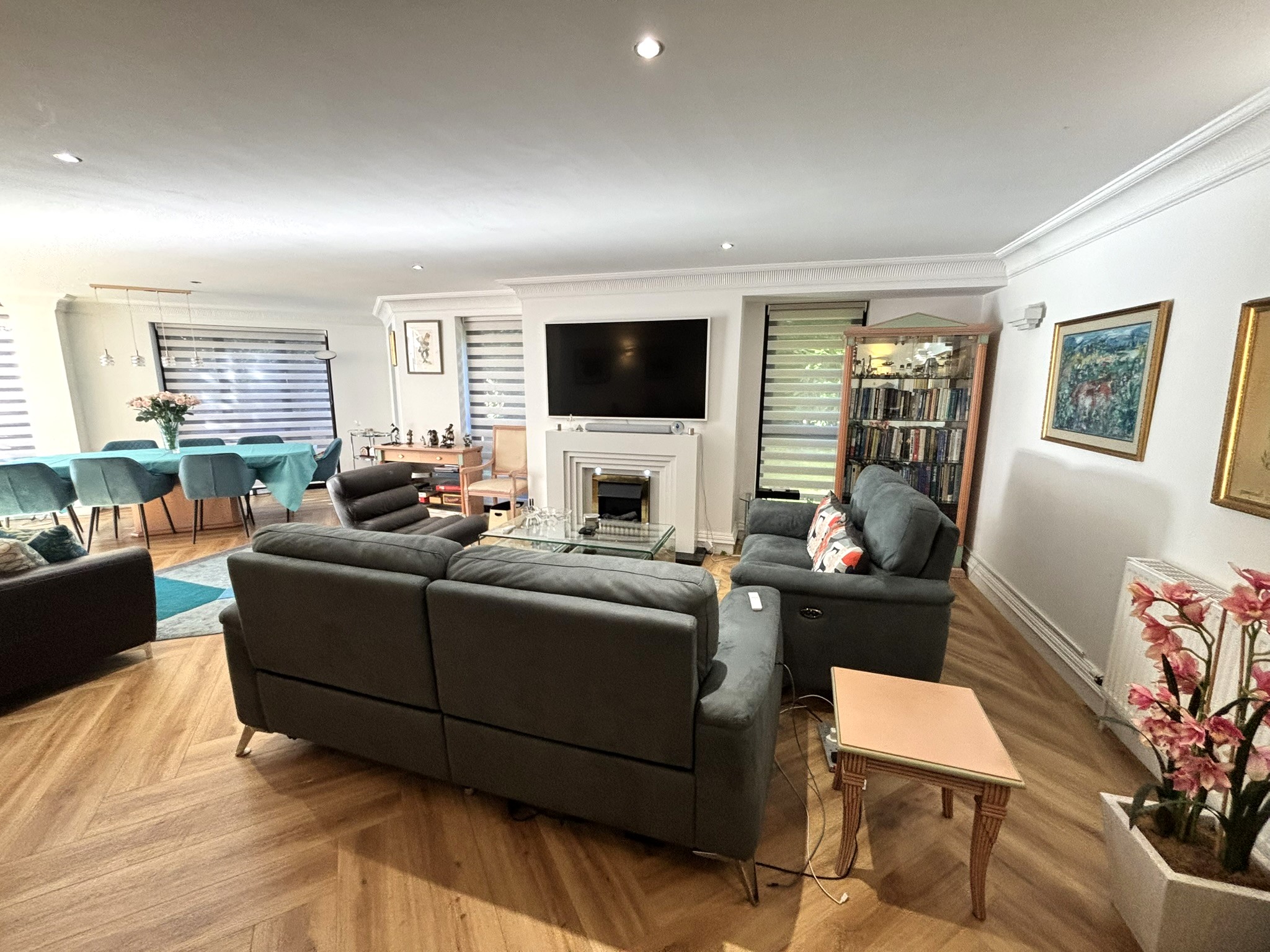 A very large lounge with seperate dining space. Wooden herringbone flooring, floor to ceiling windows with electric blinds. Space for large furniture and with feature fireplace with TV above. Access to the garden via sliding glass door.