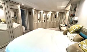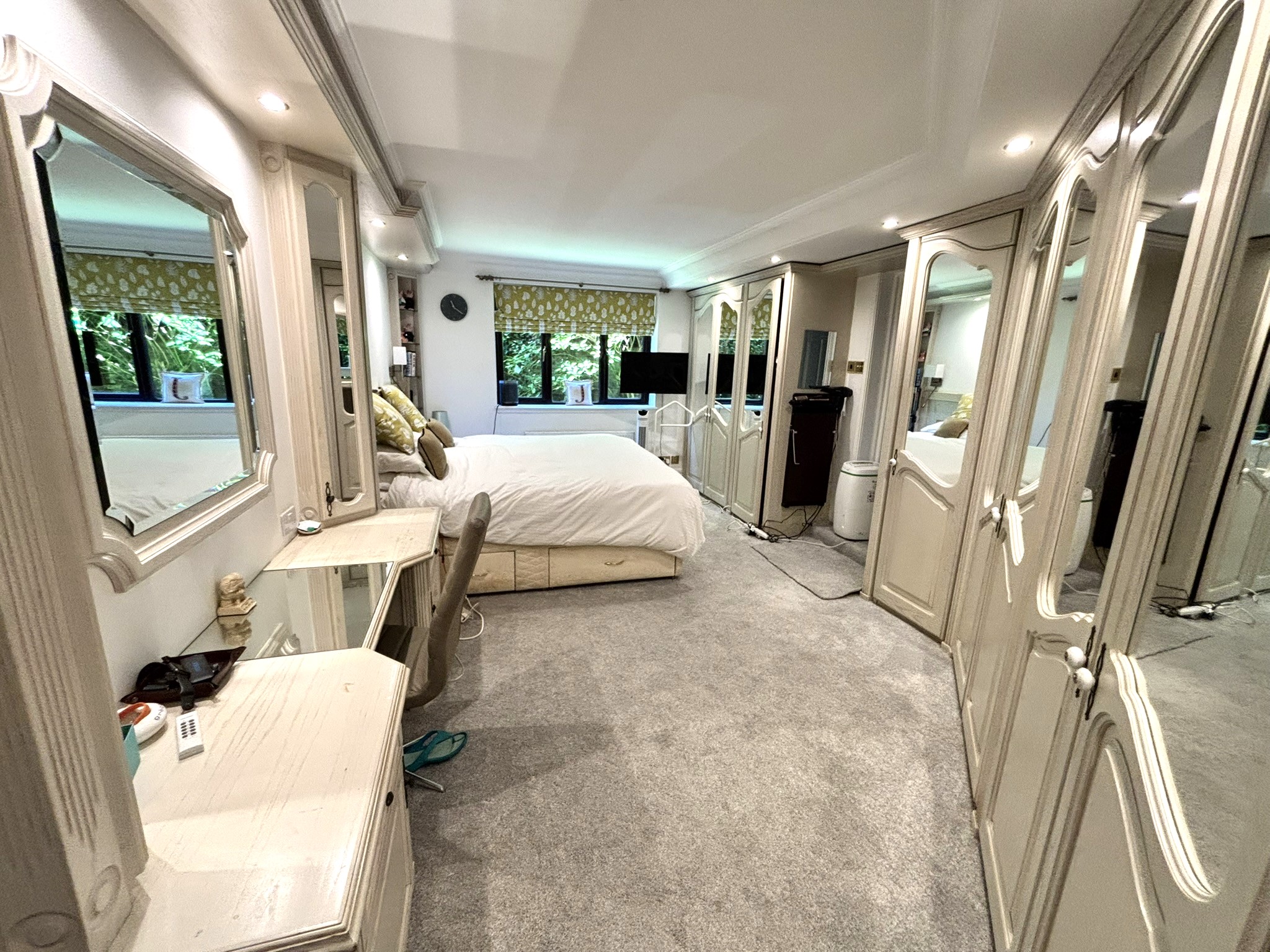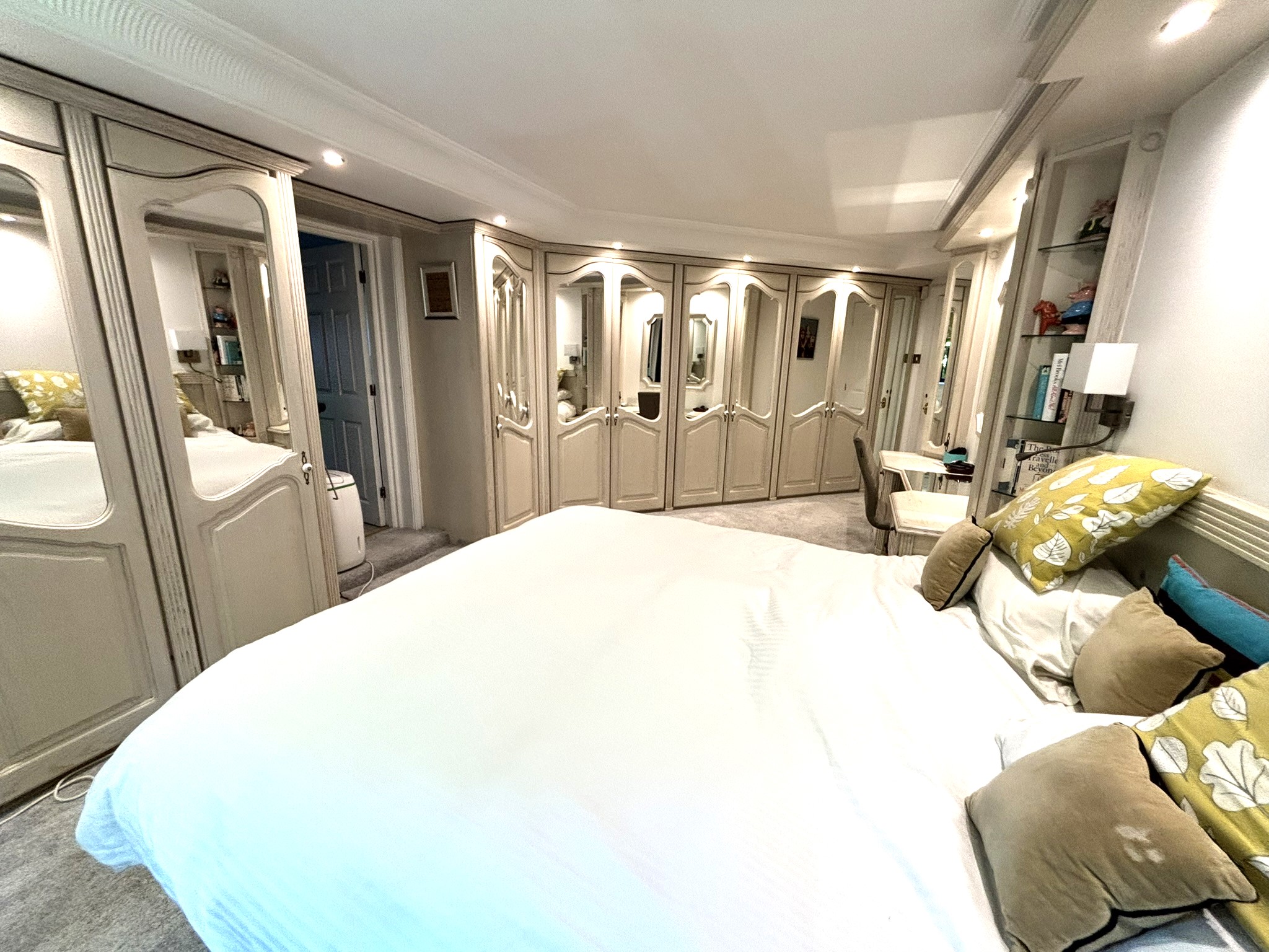 A spacious bedroom with king size bed, substantial fitted wardrobes and dressing table area.