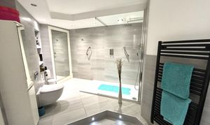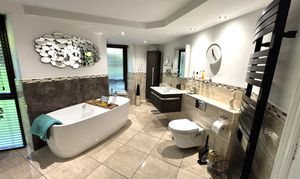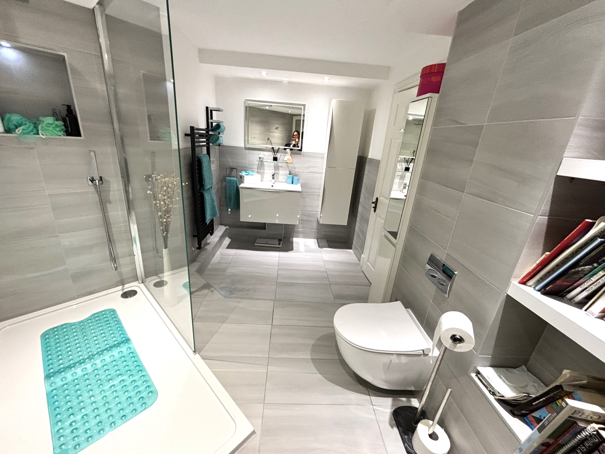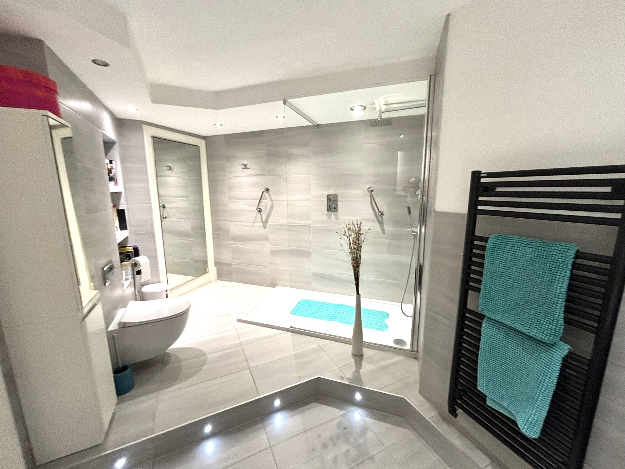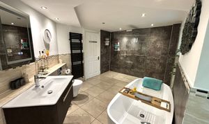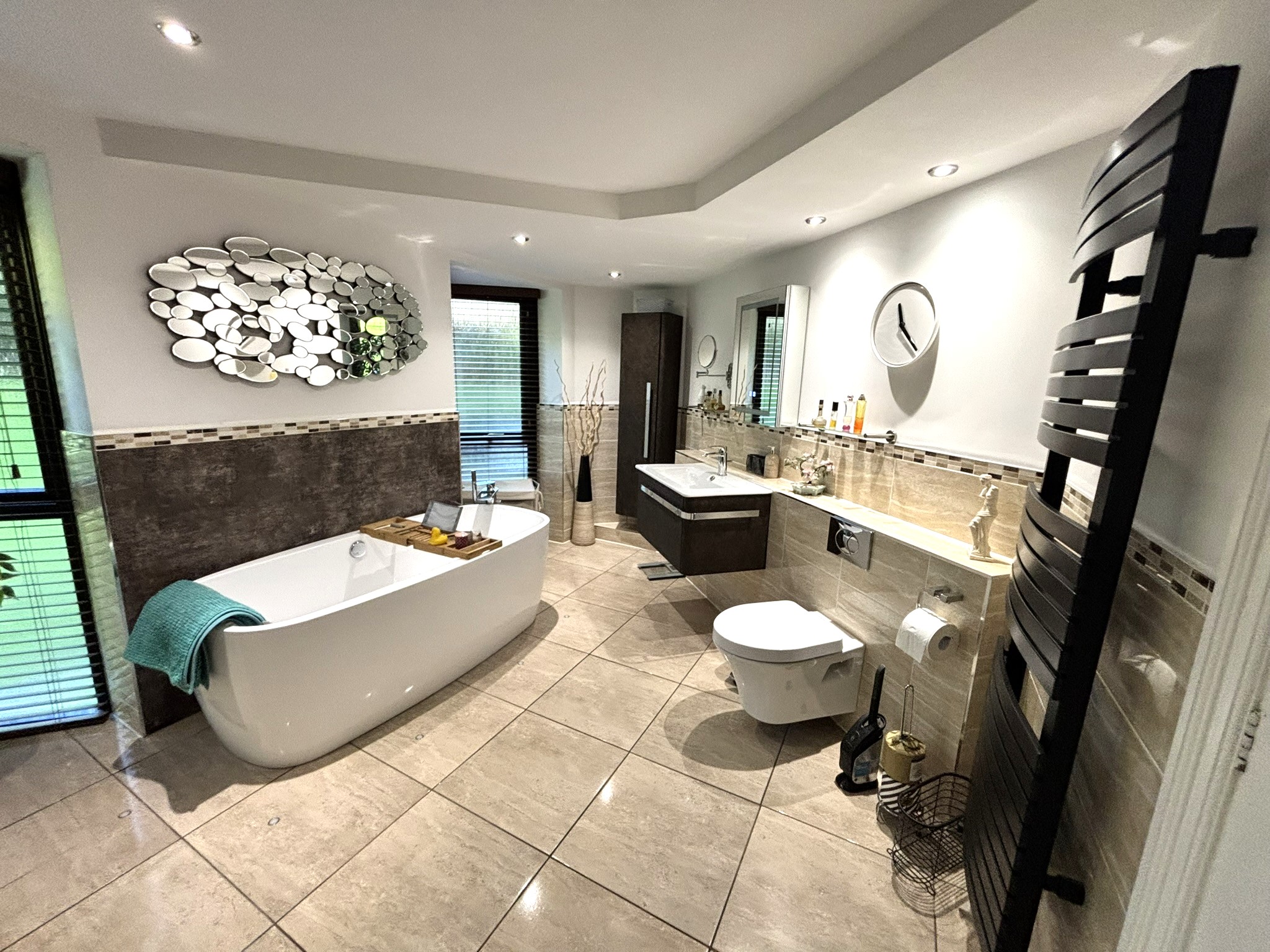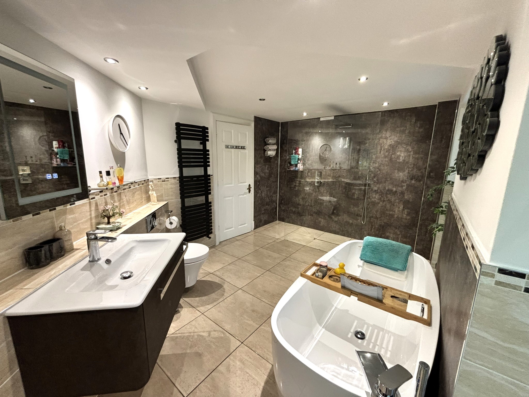 A beautiful en-suite master bathroom with walk in glass shower, freestanding bath, sink with vanity unit and WC. With extra storage and heated towel rail.