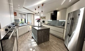 The spacious kitchen, automated cupboards, dual sinks, American style fridge/freezer, double ovens. Central island eating area.