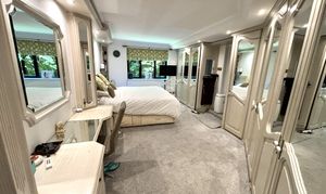 The master bedroom suite, has fitted mirrored wardrobes and space for a king size bed. With lots of storage options and dressing table area. An exquisite, en suite master bathroom, with a large walk-in glass panel shower, freestanding bath, and sink with storage and vanity mirror.