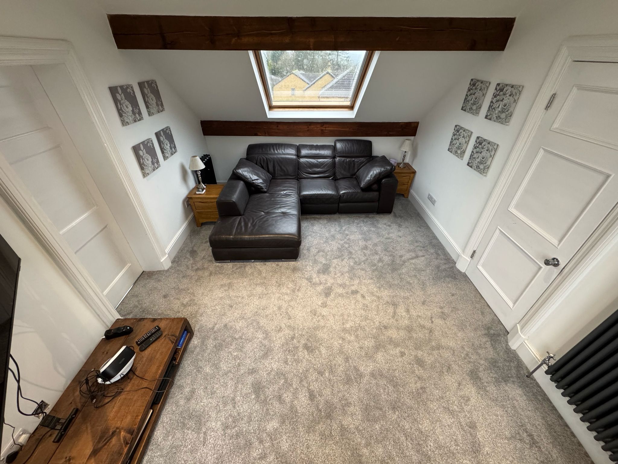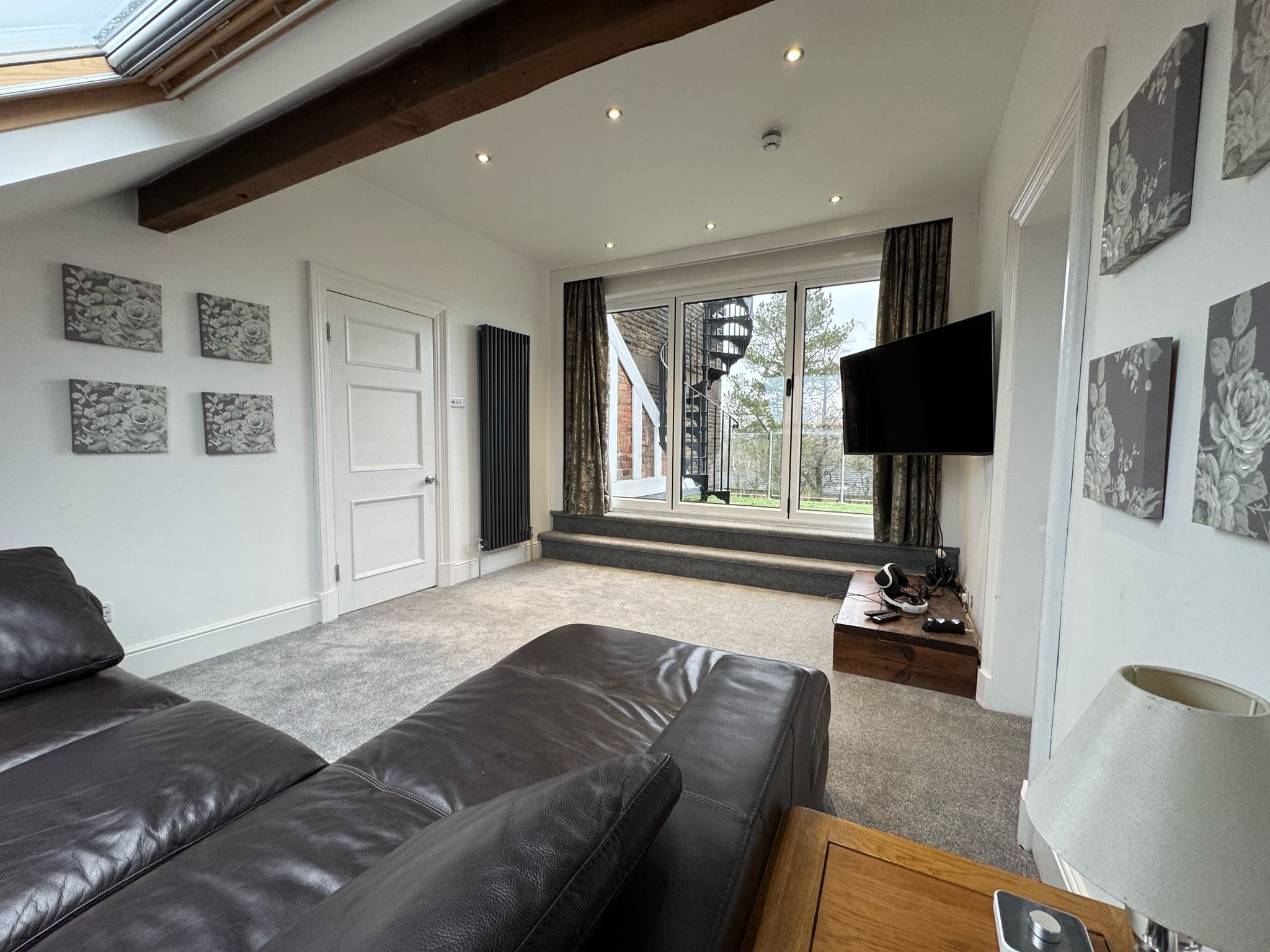 This inviting room serves as a cosy retreat, featuring plush carpet flooring. A large sliding stack door opens onto a private balcony, which provides access to a spiral staircase leading to a viewing deck at the top of the turret. The rear aspect of the room showcases a stunning vaulted ceiling and large Velux windows with integrated blinds, allowing natural light to flood the space.