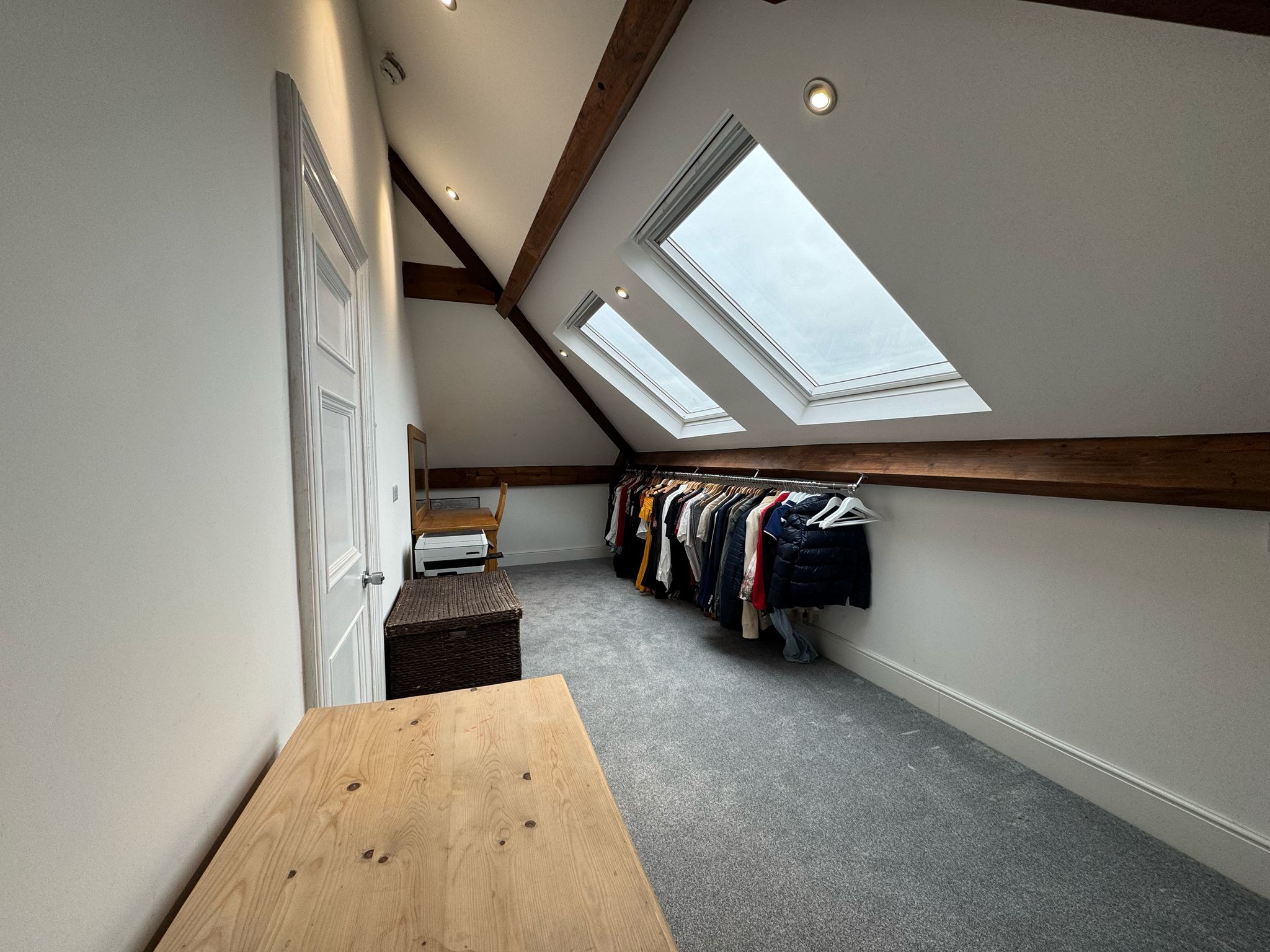 A separate dressing area offers the exciting potential for conversion into a kitchen. Dressing room with carpet flooring, a vaulted ceiling with exposed beams, and large Velux ceiling windows offering hillside views. The room also includes a separate boiler system and can be converted to accommodate a kitchen.