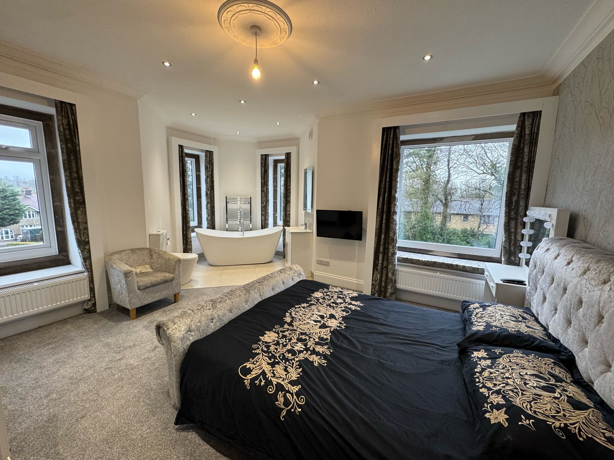 This plush bedroom suite offers a luxurious retreat with carpeted flooring and dual-aspect UPVC windows. A striking box window, framed by original stone mullions, showcases a freestanding bath perfectly positioned to enjoy breathtaking hillside and garden views. The suite is further enhanced by a carpeted dressing room with an open doorway leading to a separate bathroom.