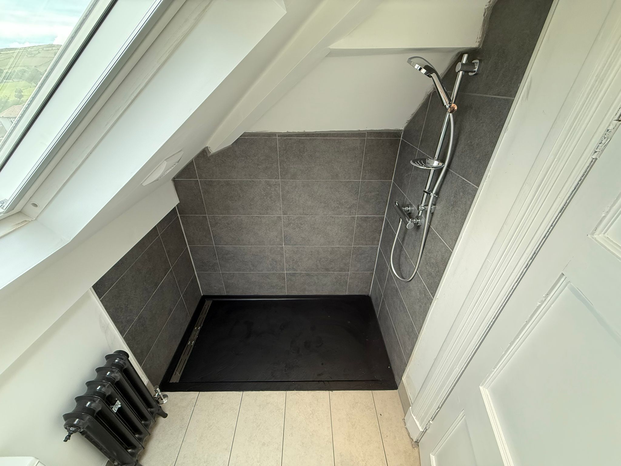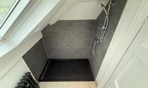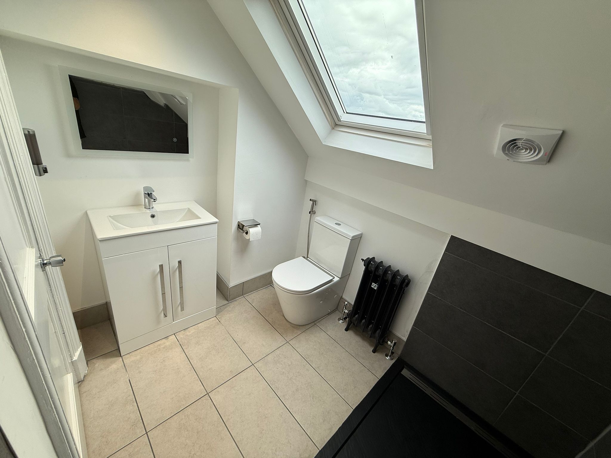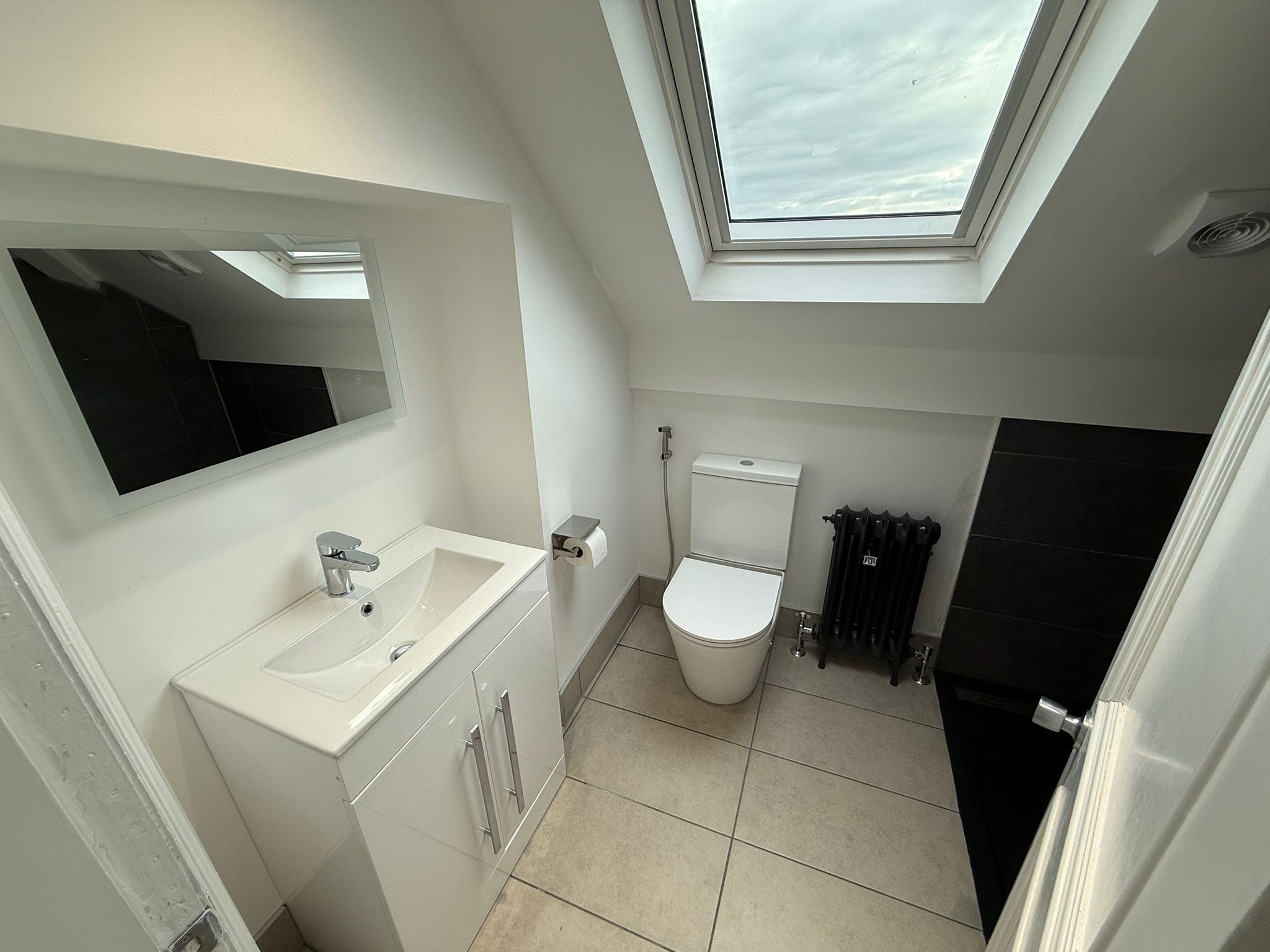 This bathroom features a shower, vanity, and basin, and boasts a Velux ceiling window.