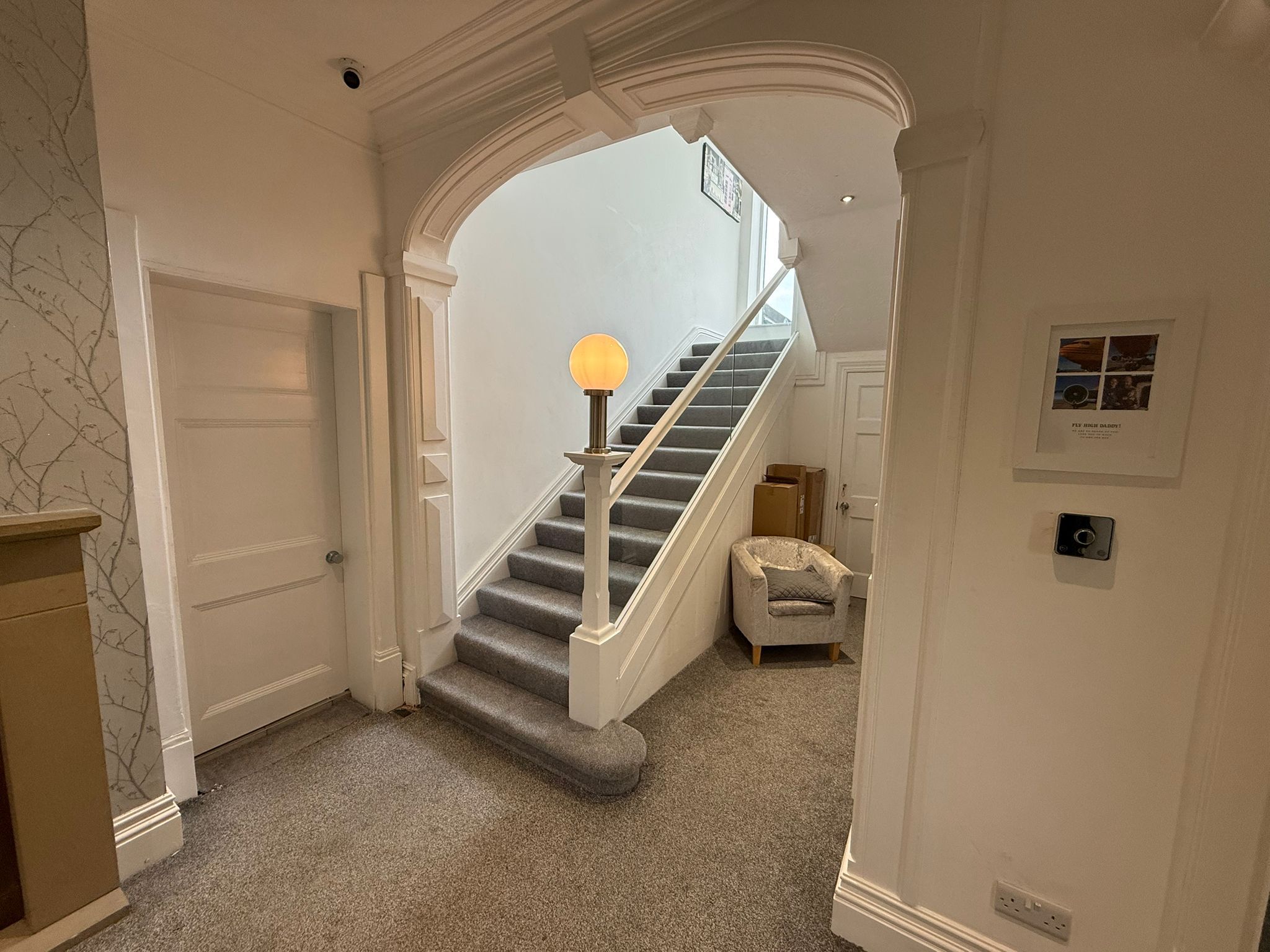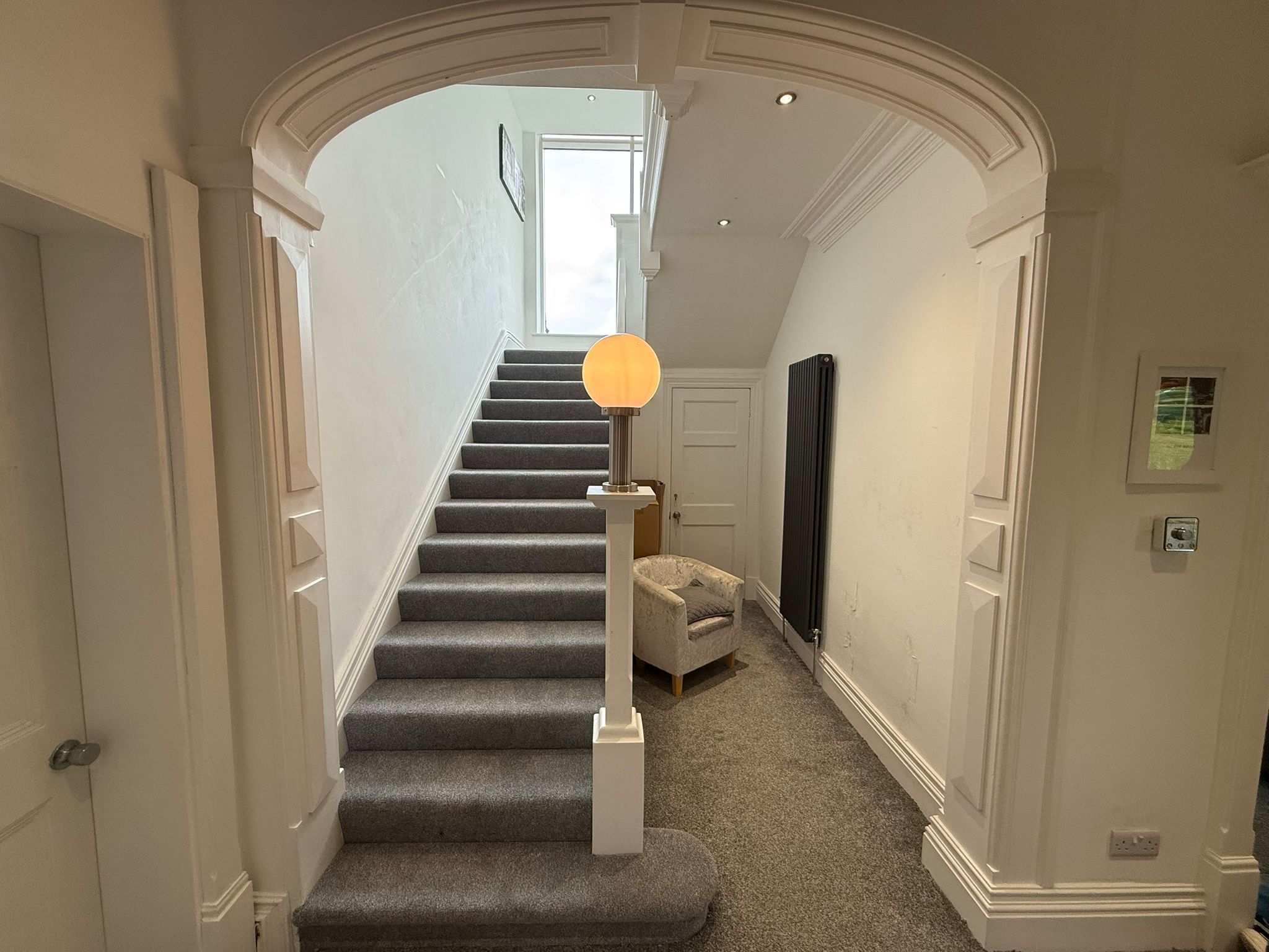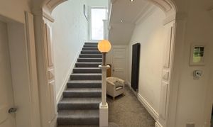 The grand entrance hall welcomes you with carpet flooring and a striking stone mullion window, showcasing original frames and decorative glass motifs. A composite door within a timber arch frame adds a touch of elegance. The room's focal point is a decorative copper-plated fireplace, resting on a stone hearth and surround, beautifully complemented by wallpaper. A decorative archway frames the carpeted staircase and provides access to the cellar door. Decorative architraves and a newel post light add the the grandeur of the room.