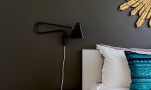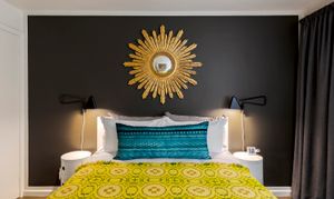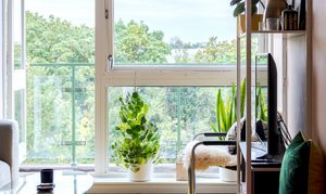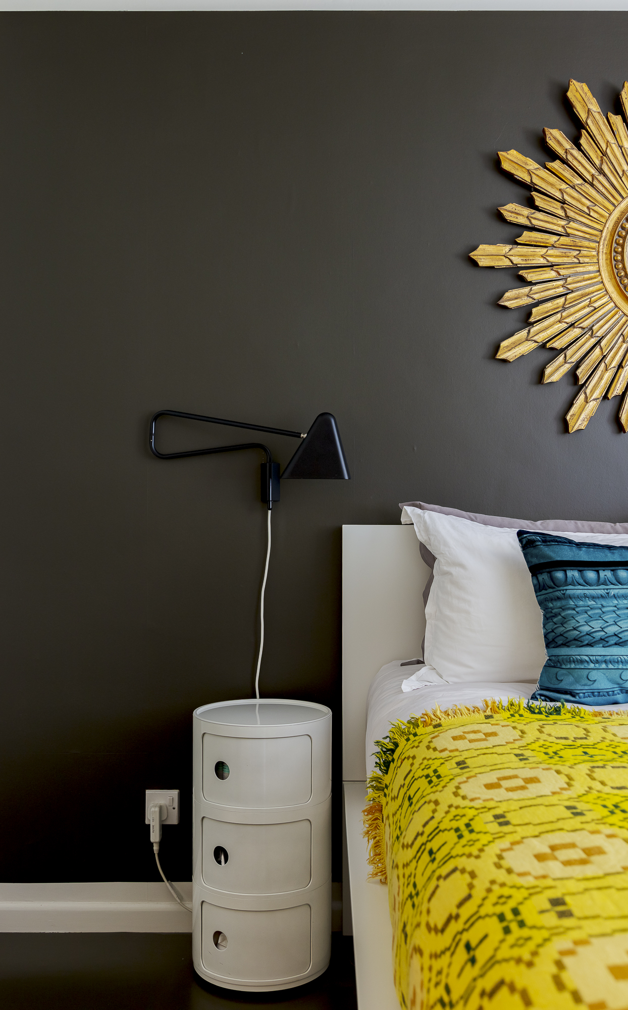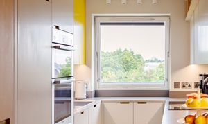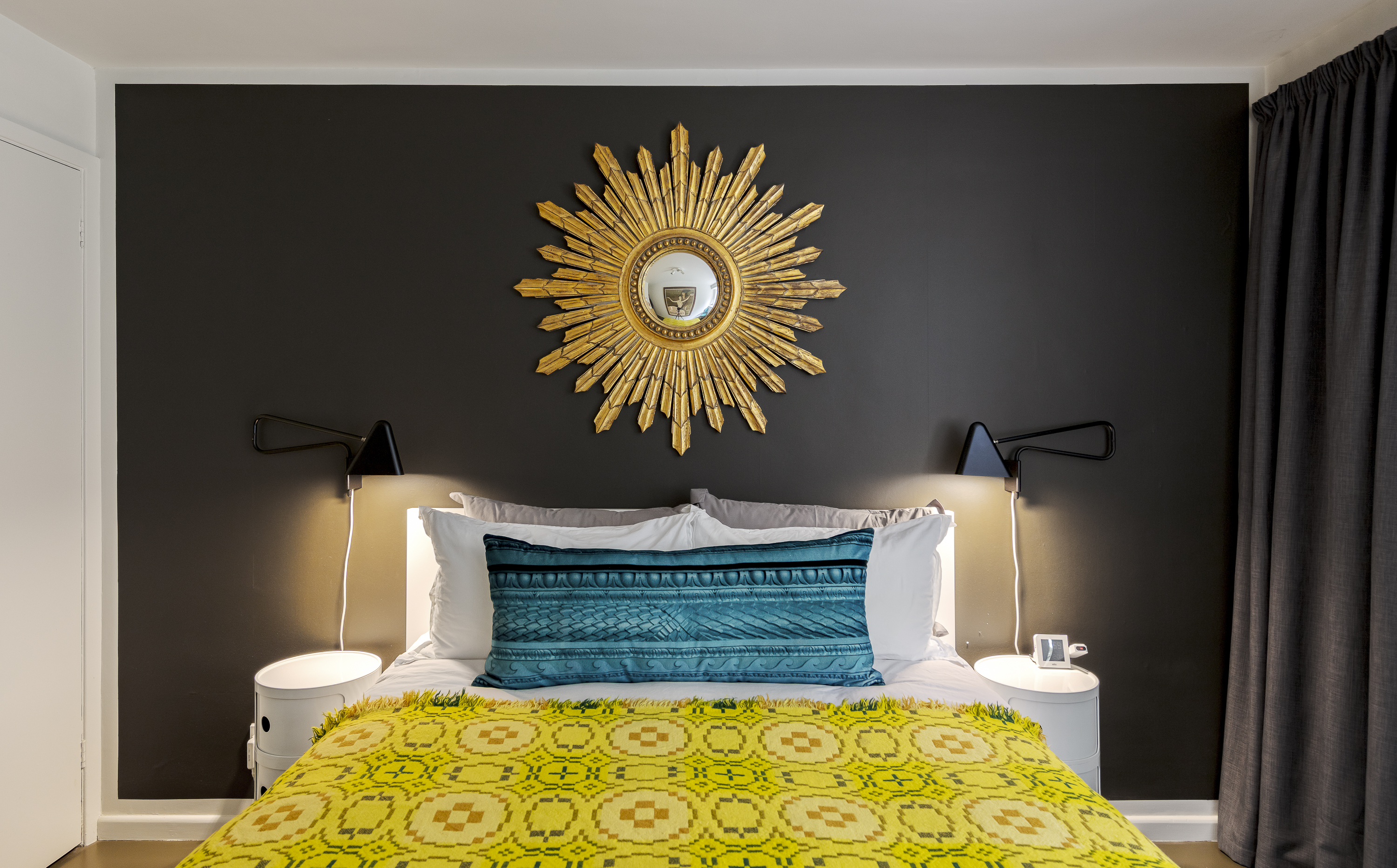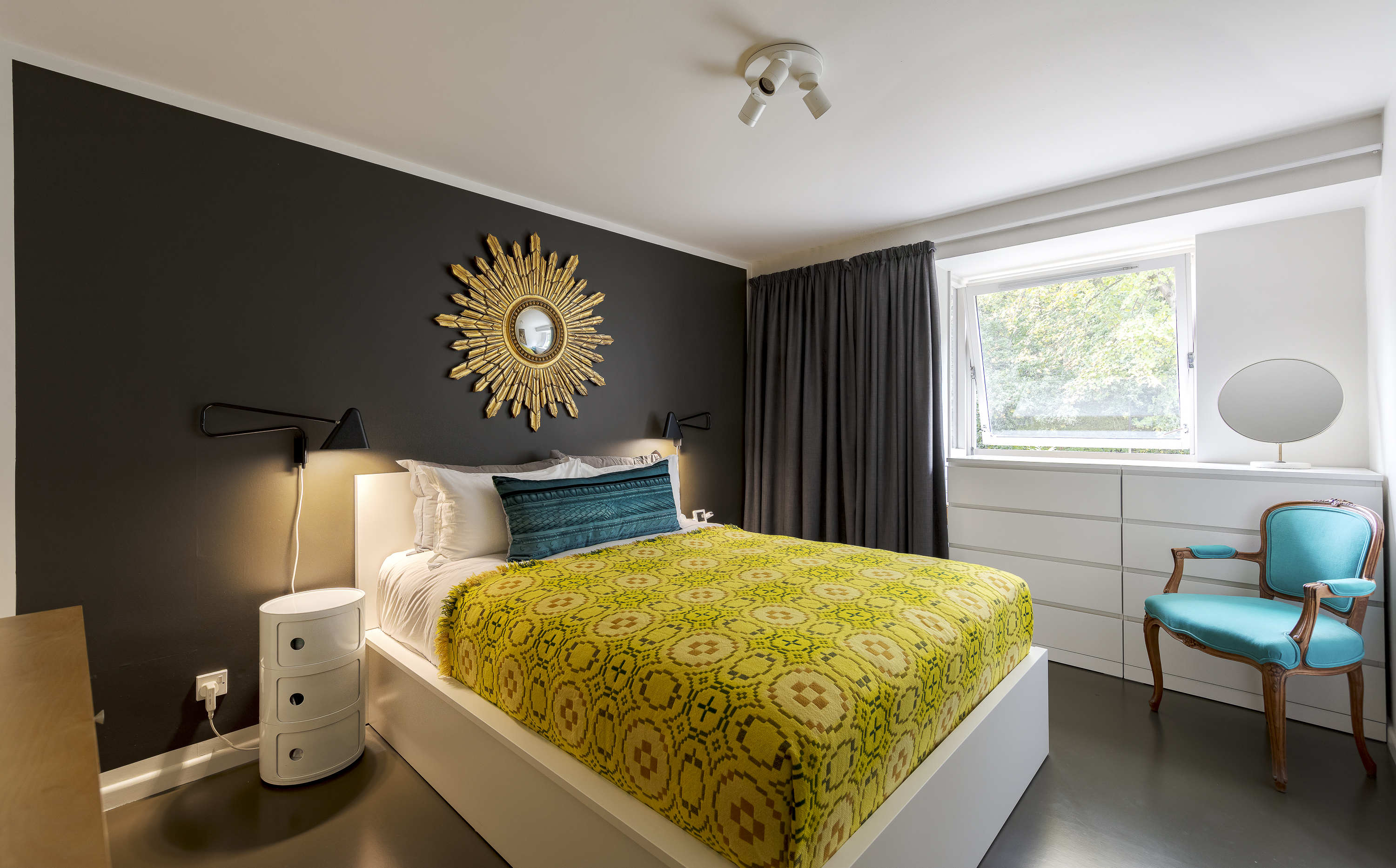 Both bedrooms are beautifully finished and thoughtfully arranged. The main bedroom has a relaxed, hotel-like feel, with a soft contrast of dark and light tones and leafy views through a large picture window.