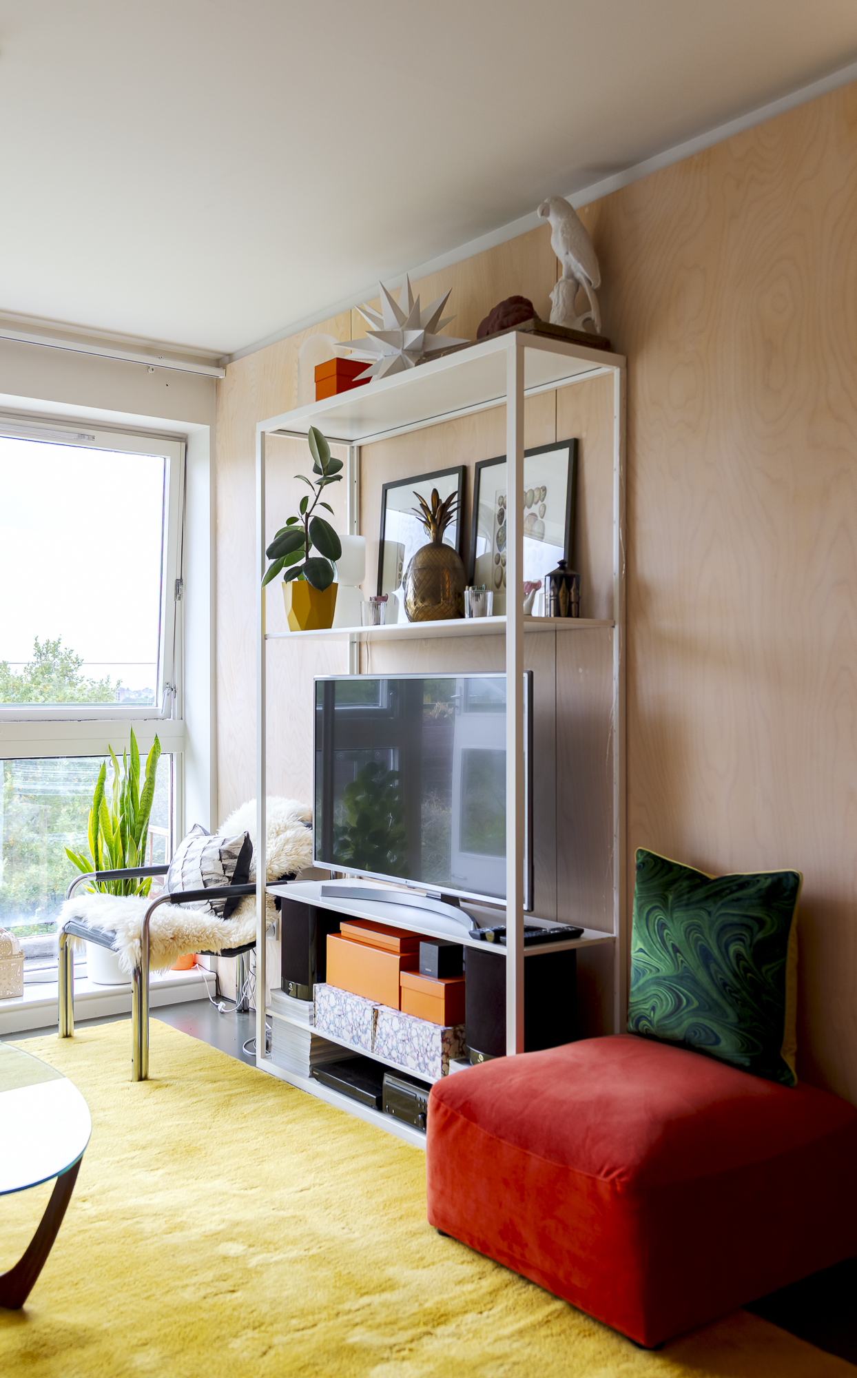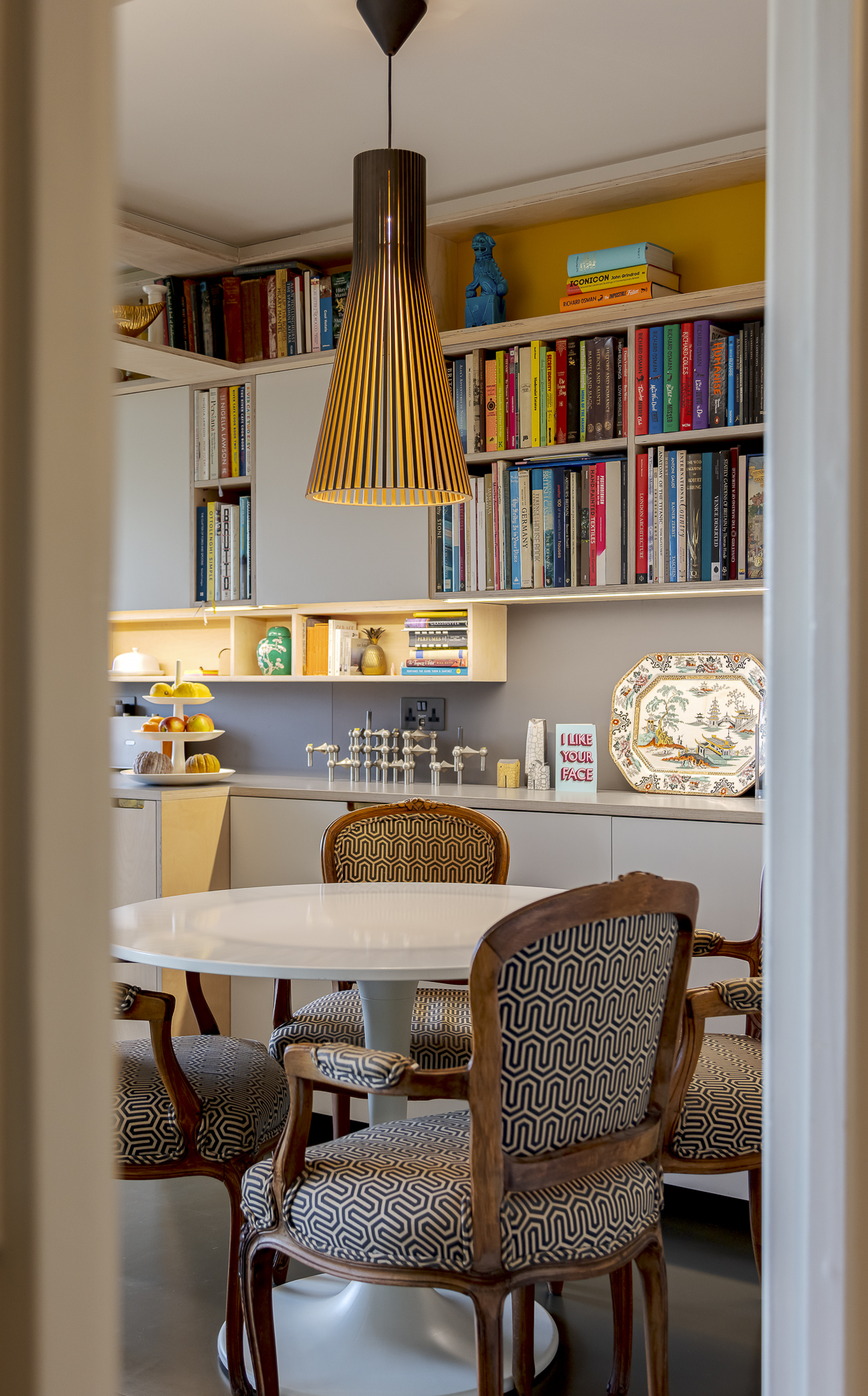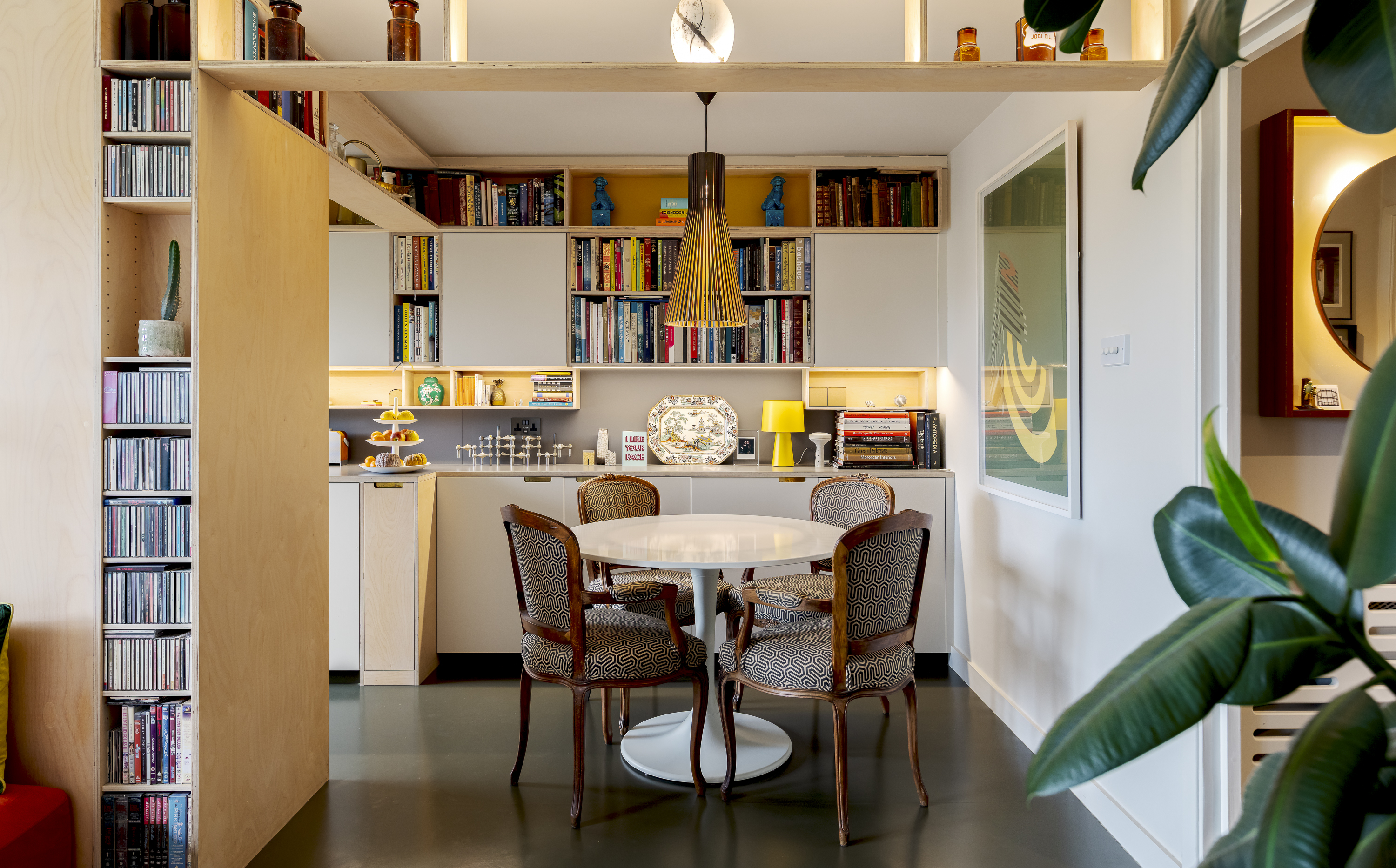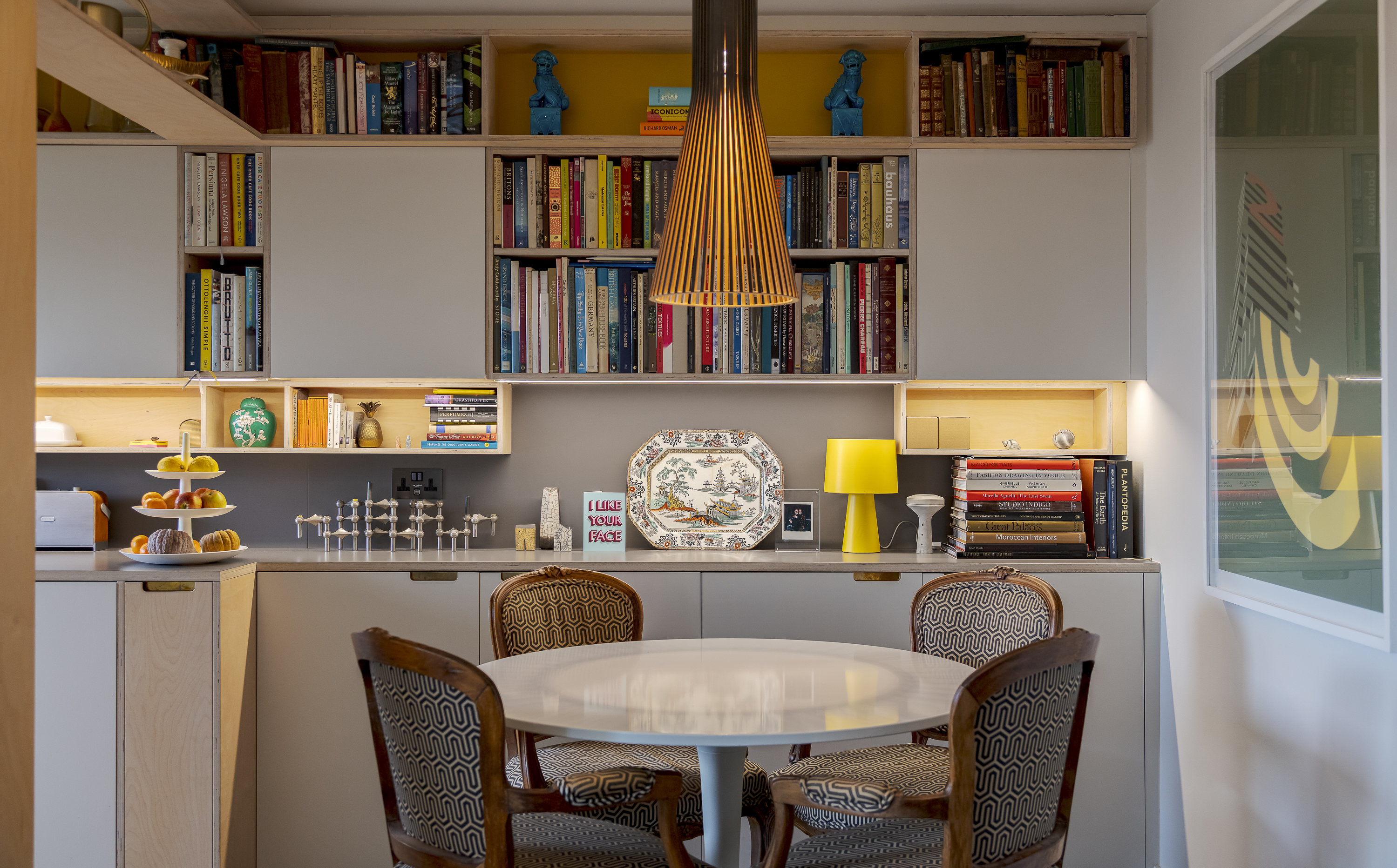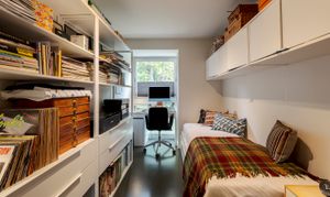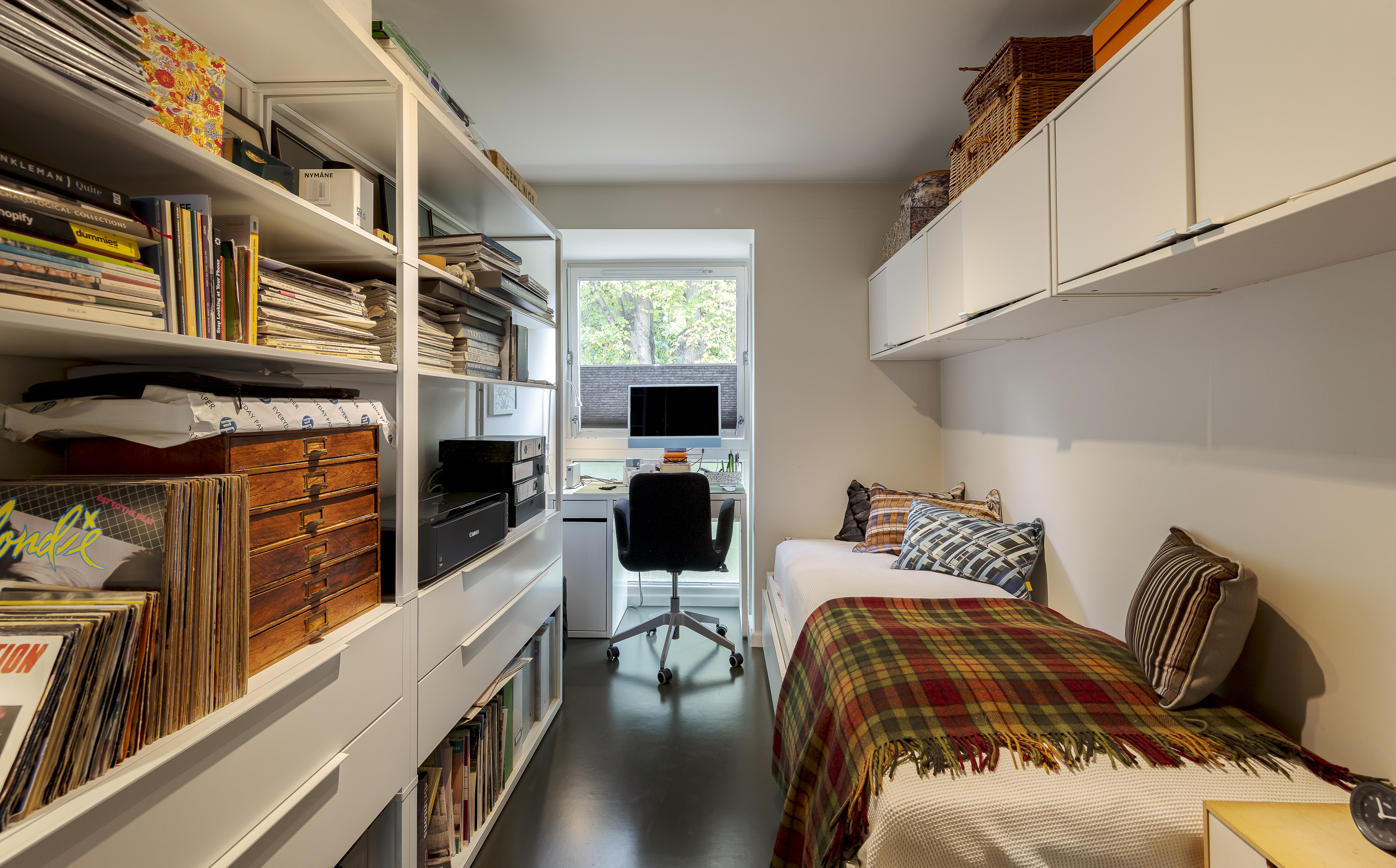 The second bedroom is currently used as a flexible work-from-home and guest space — a reminder of the versatility of this layout. Full-height shelving and fitted cabinetry make it ideal for anyone balancing hybrid work life with the need for a calm and ordered space.