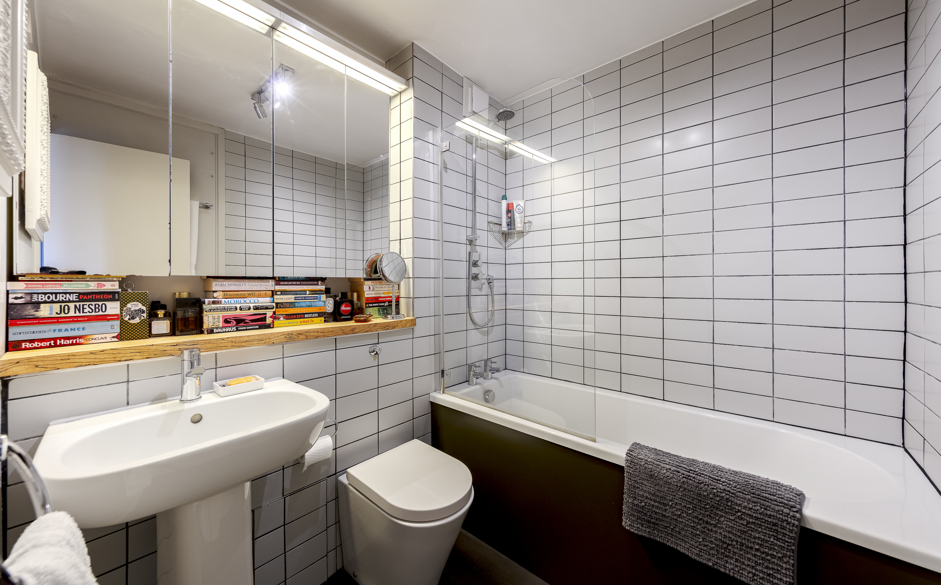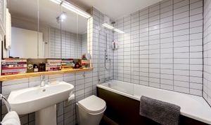 The bathroom continues the home’s modern design language — fully tiled with a grid layout that nods to classic mid-century geometry. A full-size bath with overhead shower, mirrored cabinetry, and a wooden shelf detail brings warmth and practicality to the space.