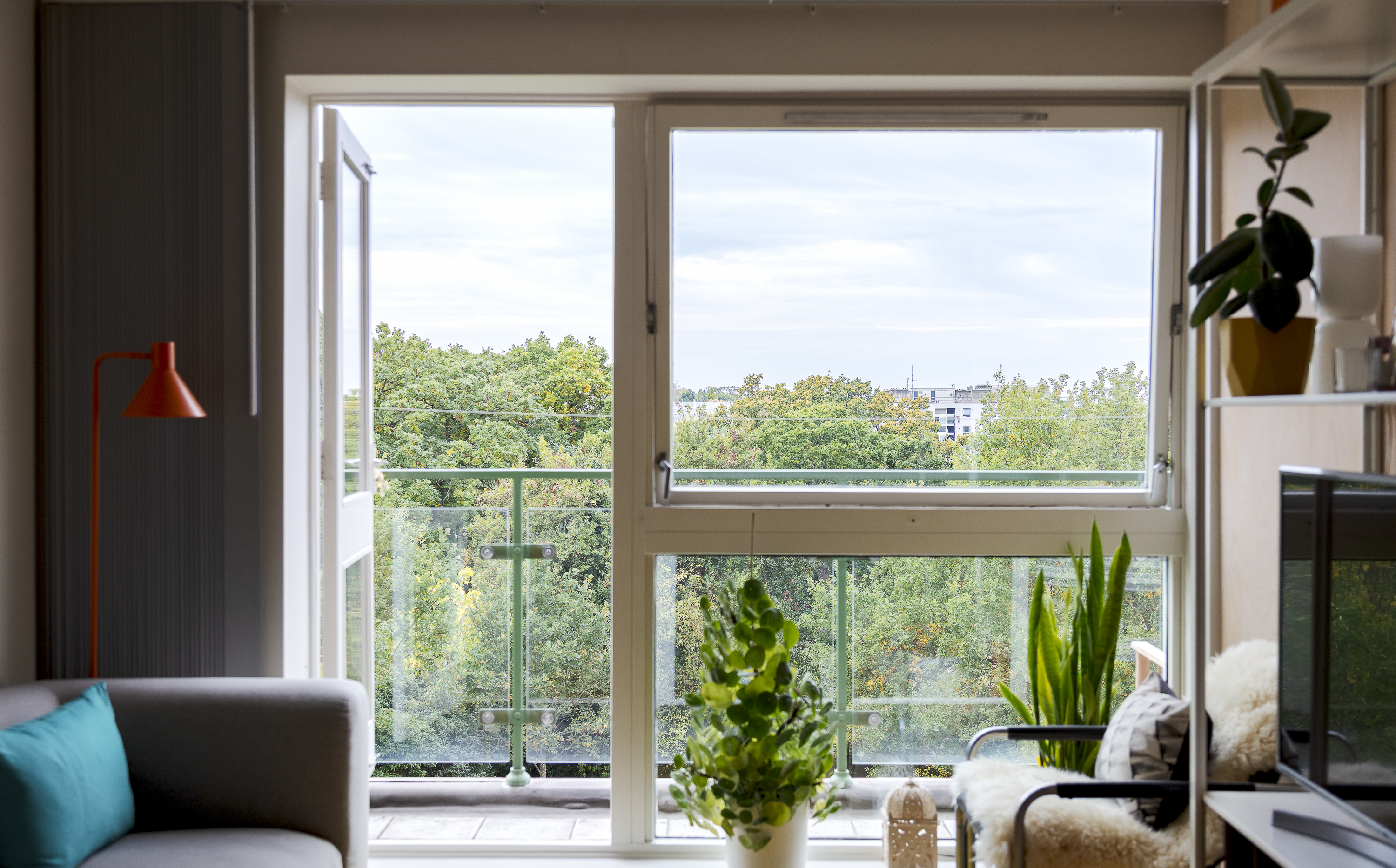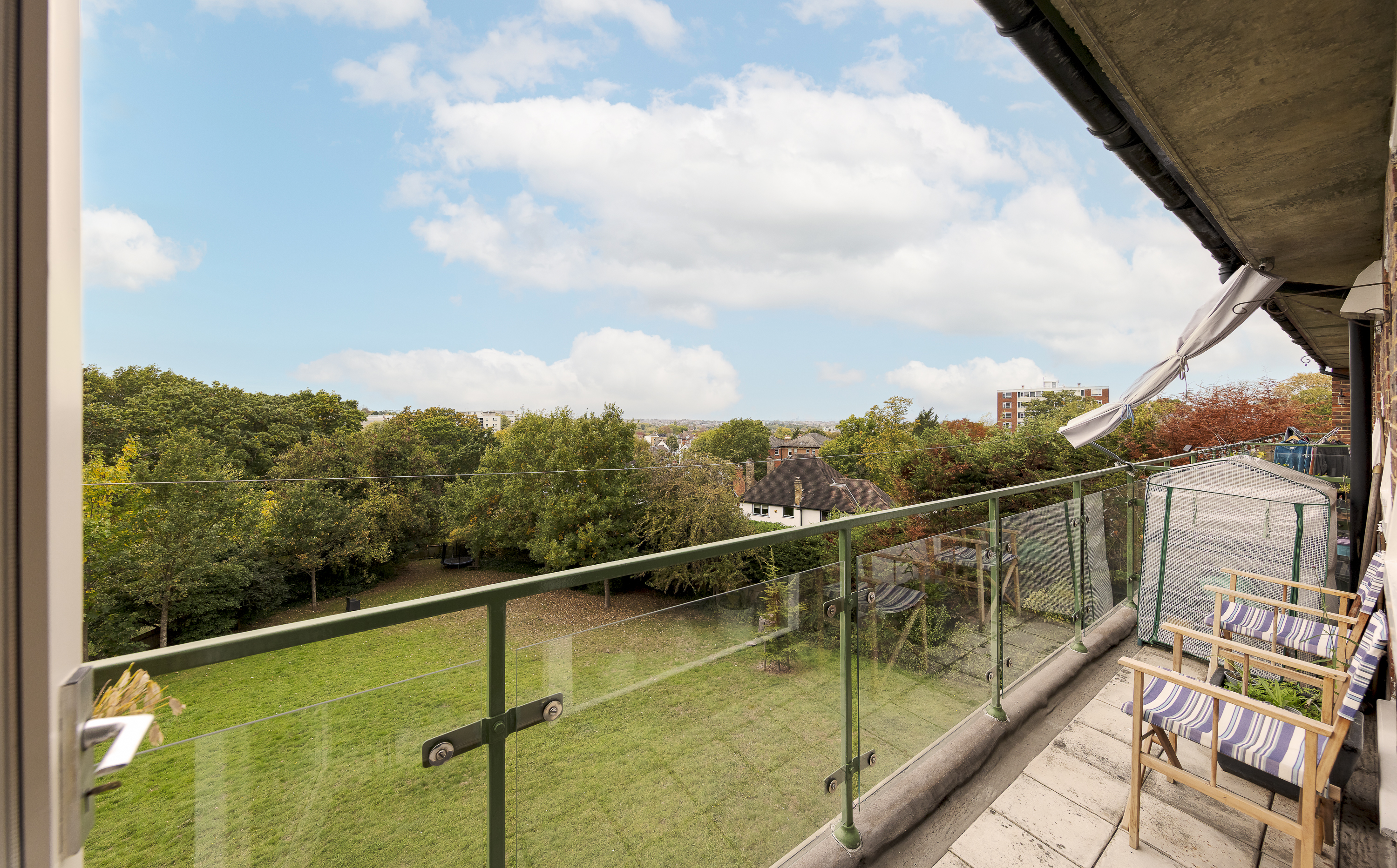 The balcony is a real asset here — facing west, it enjoys golden-hour light and a view across the mature communal gardens below. It’s large enough for a café table and chairs, a few plants, or even a compact herb garden.