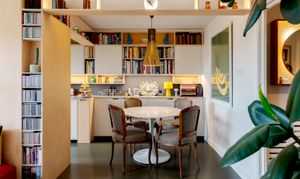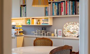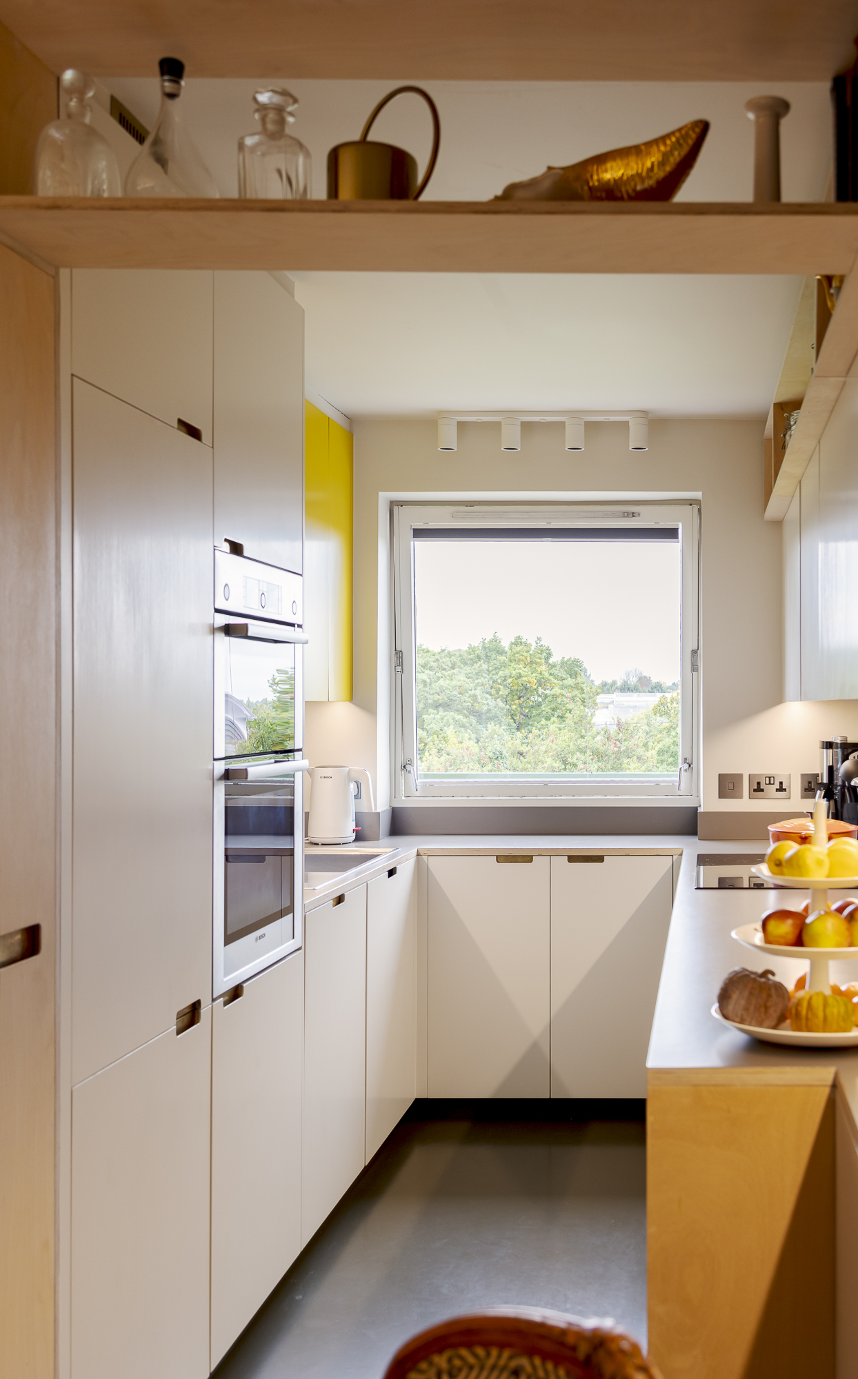 The kitchen is entirely bespoke — designed with clean lines, clever storage, and a warm, tactile material palette. Built-in cabinetry wraps around in a U-shape, maximising workspace while keeping everything within easy reach. Integrated appliances are seamlessly tucked away, and open shelving adds personality and practicality in equal measure.