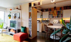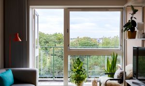 The open-plan living and dining area is the heart of the home. With its attractive rubber flooring and spacious layout, it's a bright, calm and beautifully designed space, with large west-facing windows that frame treetop views and flood the room with warm afternoon light. Off the living space is the private balcony — a peaceful spot for morning coffees, evening drinks or a slow weekend breakfast.