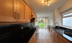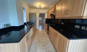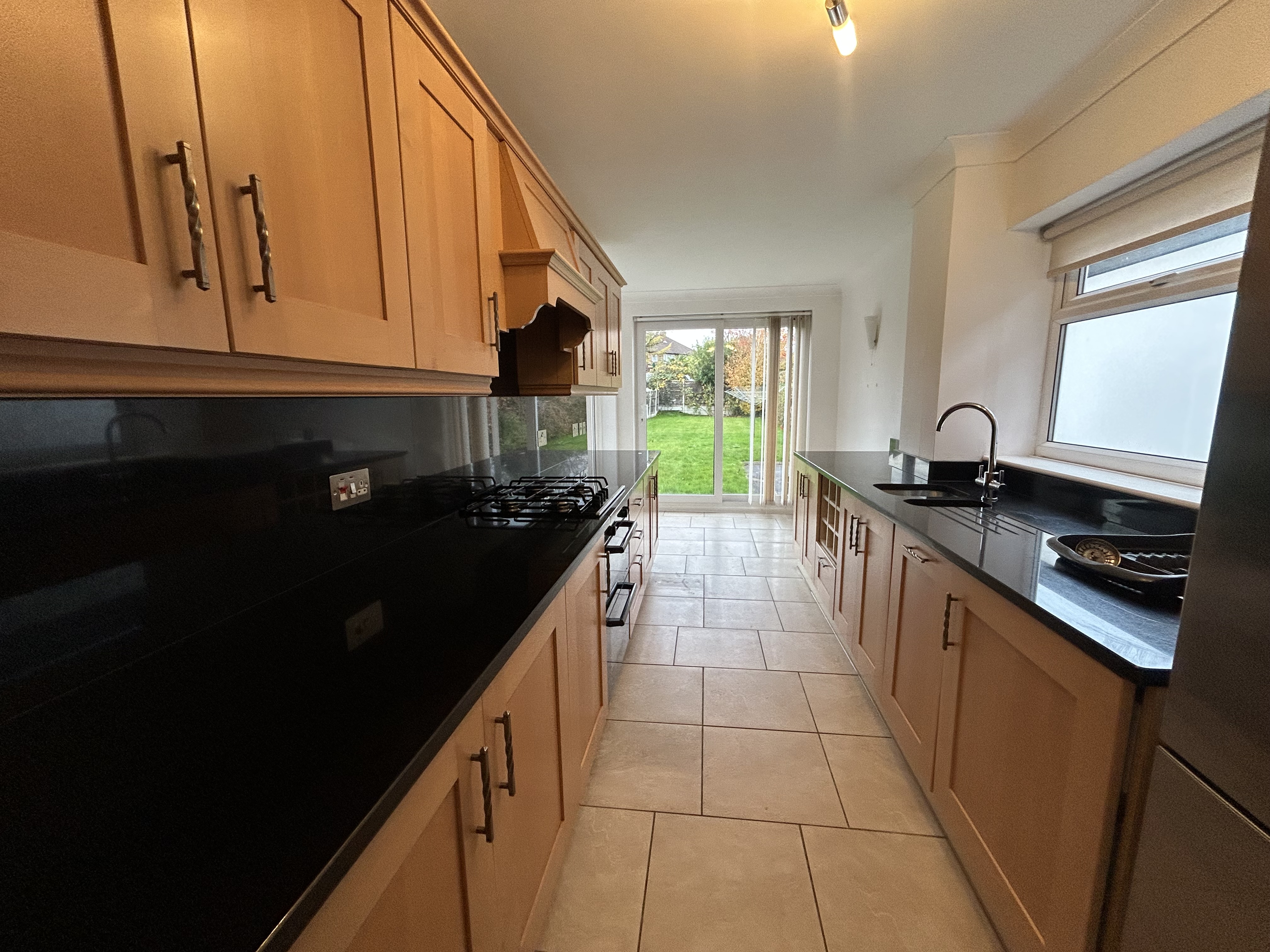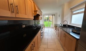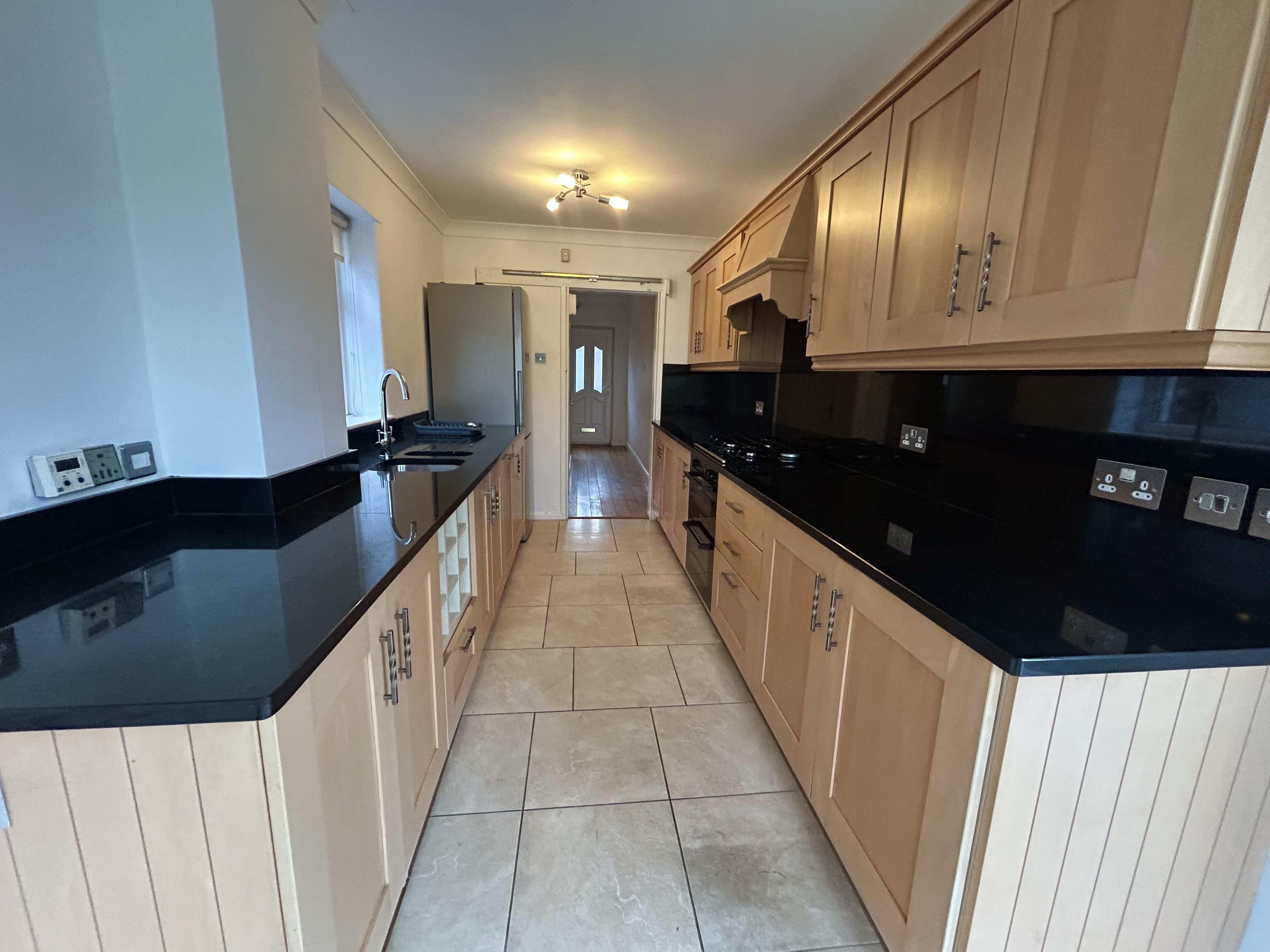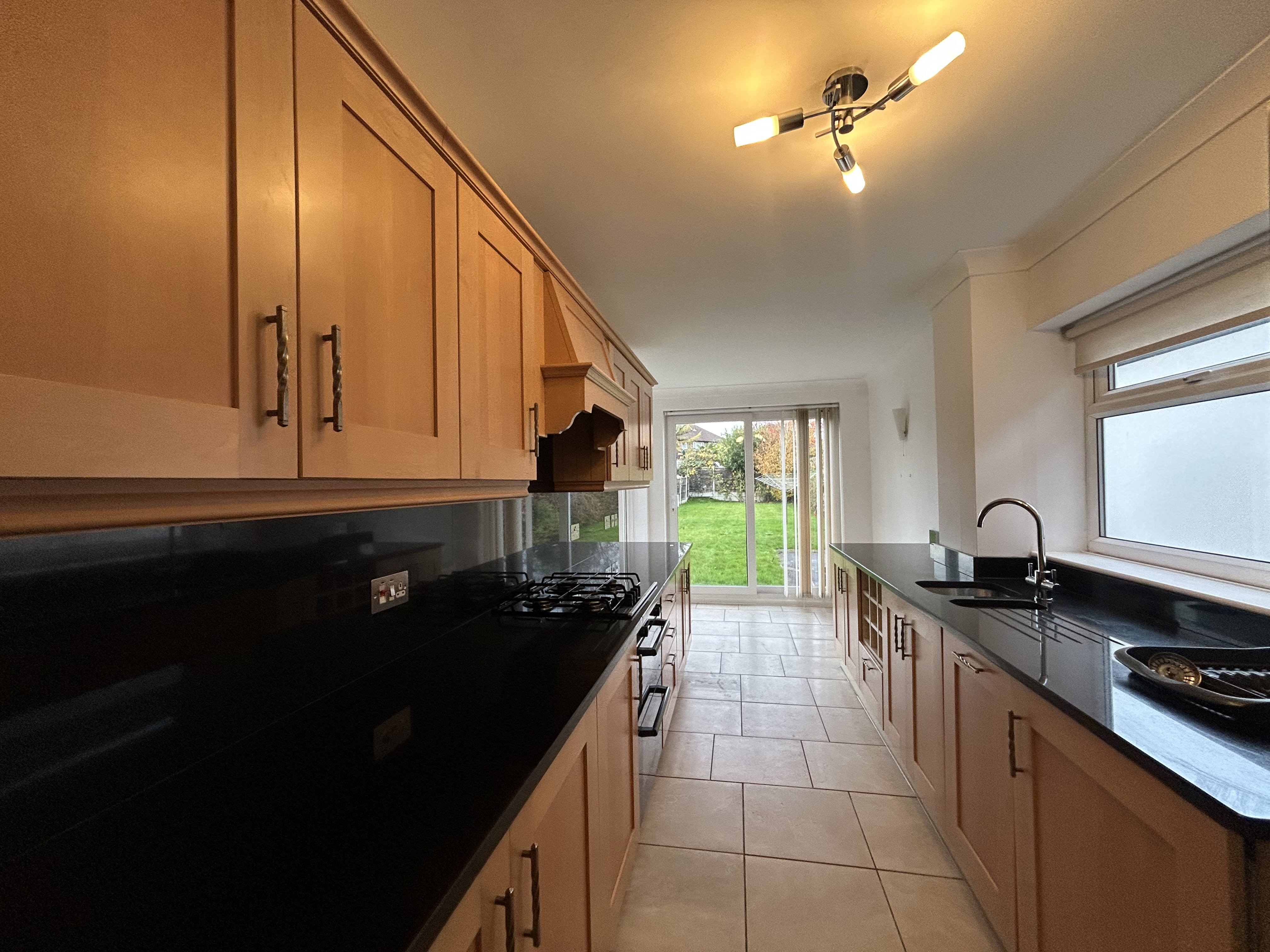 Sliding doors to the rear elevation. Picture window to the side elevation. Tiled floor. Fitted with a range of wall and base units complete with granite work surfaces and splash backs complete with integrated oven gas hob and extractor, dishwasher and washing machine with space for a fridge/freezer.
