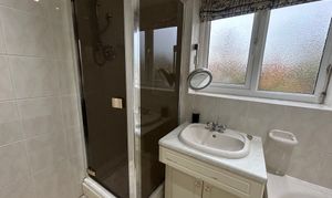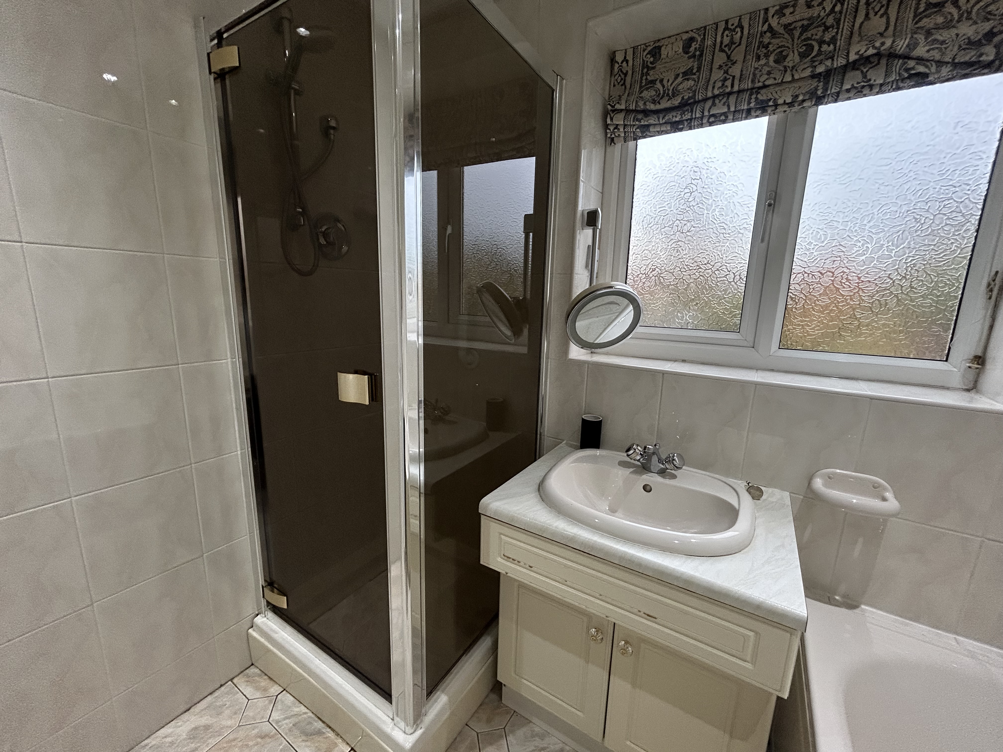 Window to the rear elevation. Fully tiled walls and floor. Fitted with a shower cubicle, bath and vanity hand wash basin.