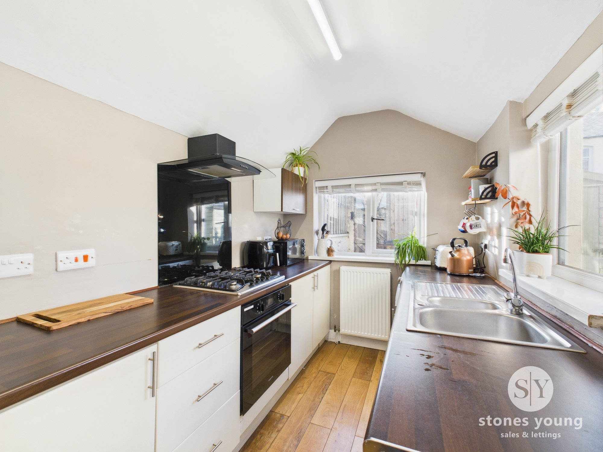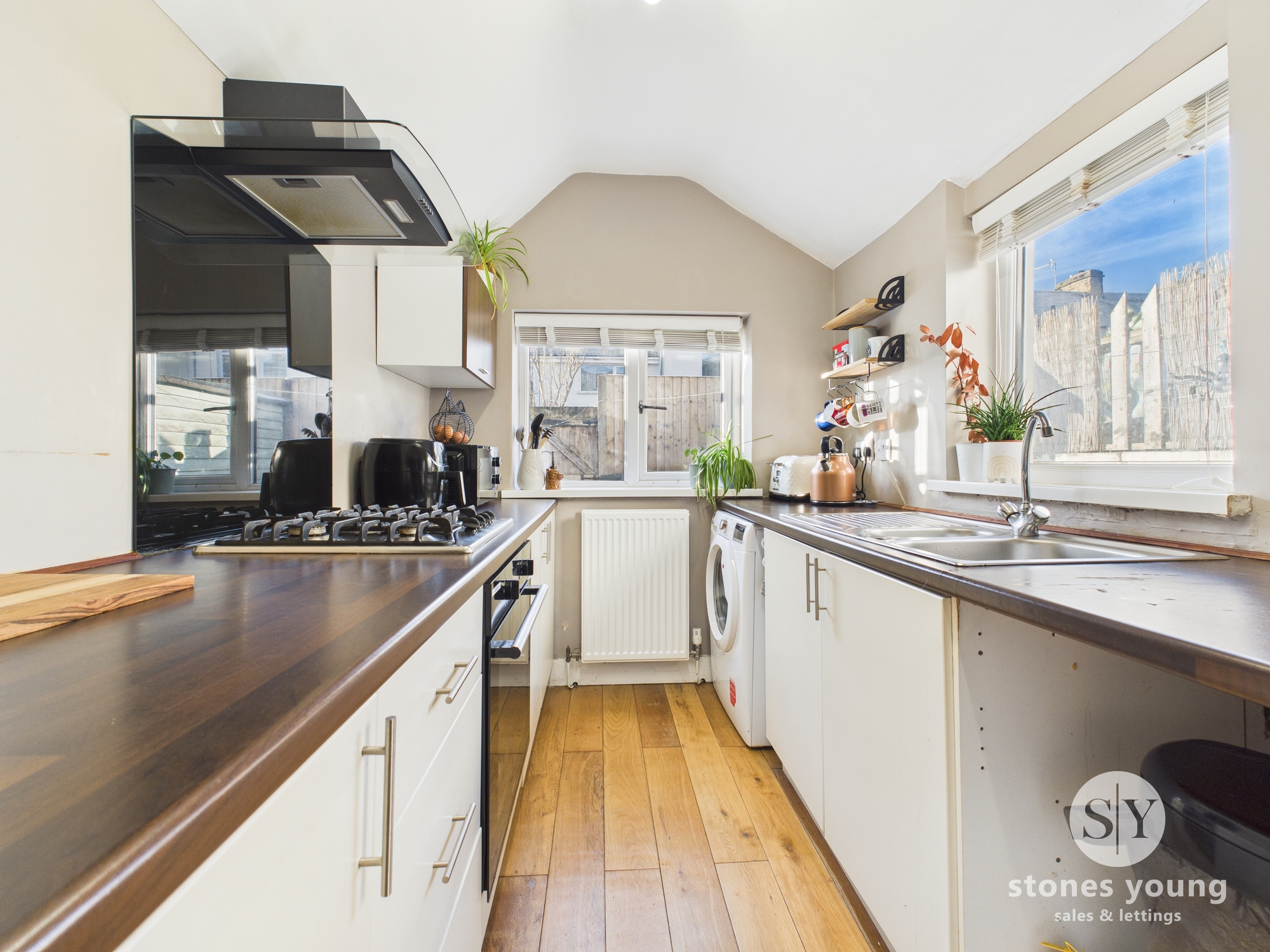 Range of fitted wall and base units with contrasting worksurfaces, stainless steel sink and drainer, gas hob, integral oven, plumbed for washing machine, space for fridge freezer, space for slimline dishwasher, wooden flooring, panel radiator, upvc double glazed windows and door to rear garden