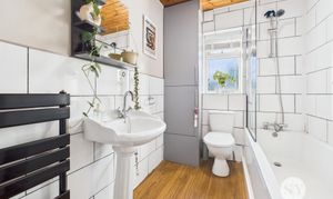 Three piece suite with shower over bath, Wc and sink, heated towel rail, fitted cupboard housing combi boiler, LVT flooring, upvc double glazed frosted window