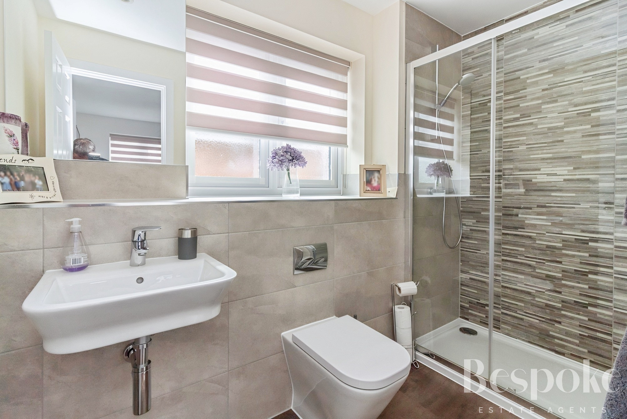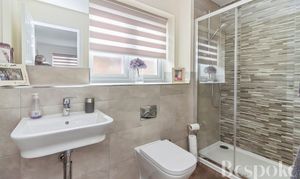 A stylish en-suite serving bedroom two, fitted with a shower, wash hand basin and WC, and enhanced by a rear-facing window bringing in natural light and ventilation.