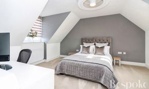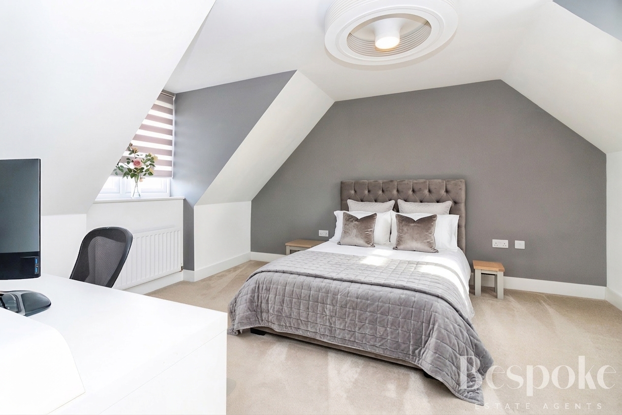 A generous double bedroom with a distinctive shape, creating a sense of space and character. Ideal for older children, guests, or as a secondary principal room.