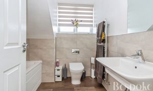 A modern family bathroom fitted with a bath with shower over, wash hand basin and WC, serving the second floor accommodation.