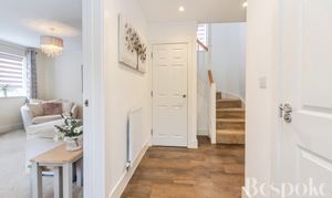 A welcoming entrance hall with a clean, neutral finish, providing access to the principal rooms. The layout immediately feels practical and well thought through, with stairs rising to the upper floors and a useful cloakroom positioned off the hall.