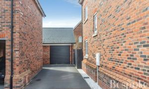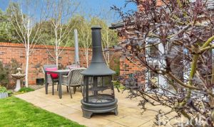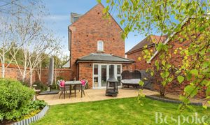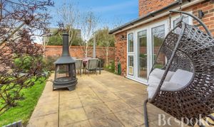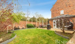 A private and well-kept rear garden, with a generous patio area extending from the house and a lawn beyond, creating a balanced and usable outdoor space. Enclosed by a brick wall with established planting, the garden also benefits from gated side access and a personal door into the garage.