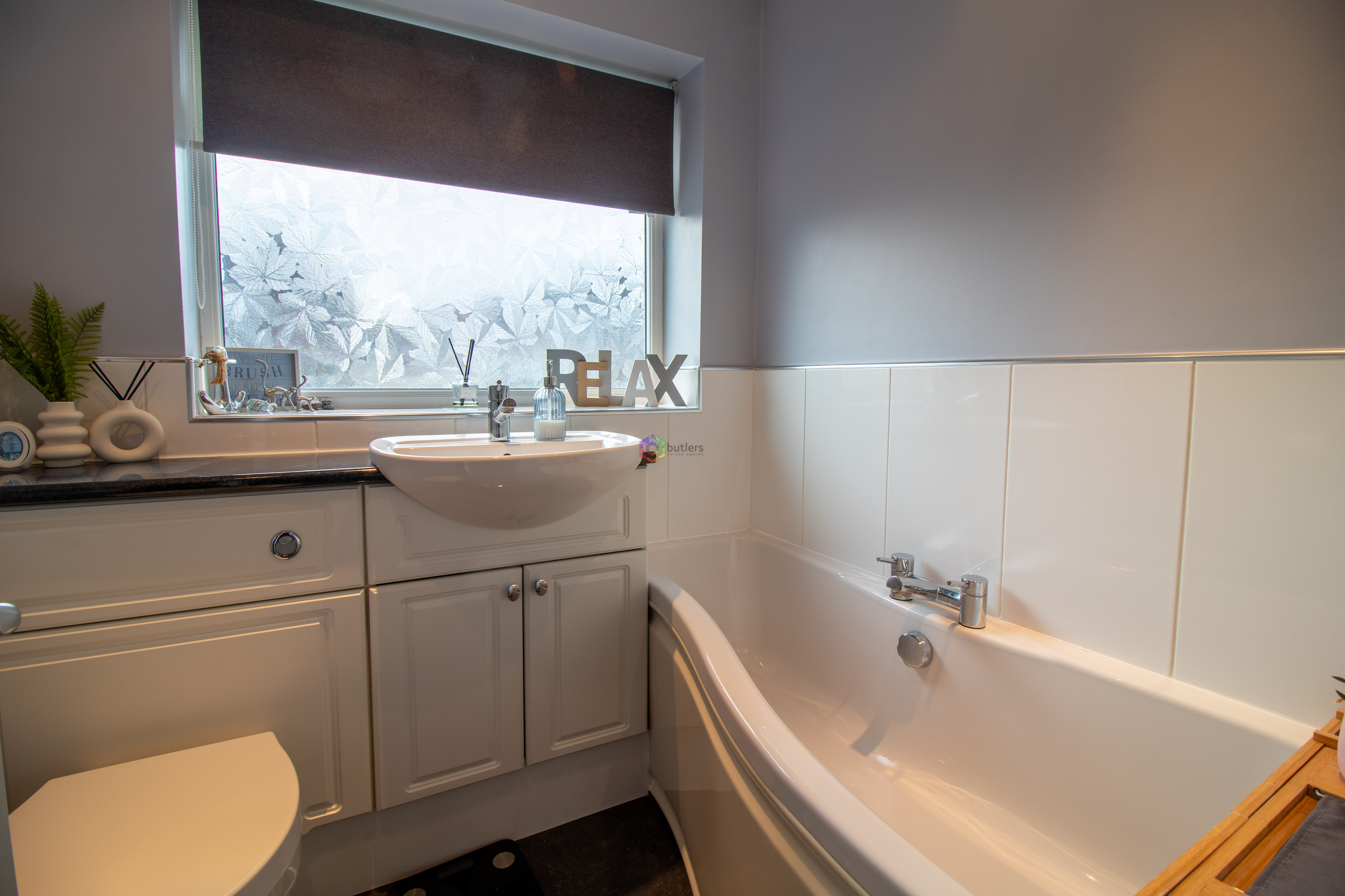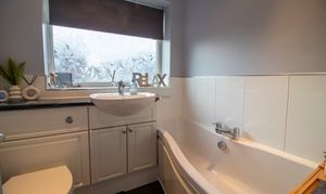 Fitted with a white bath, a vanity unit housing the white wash hand basin and white WC the room invites you to soak away the day.