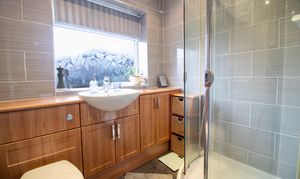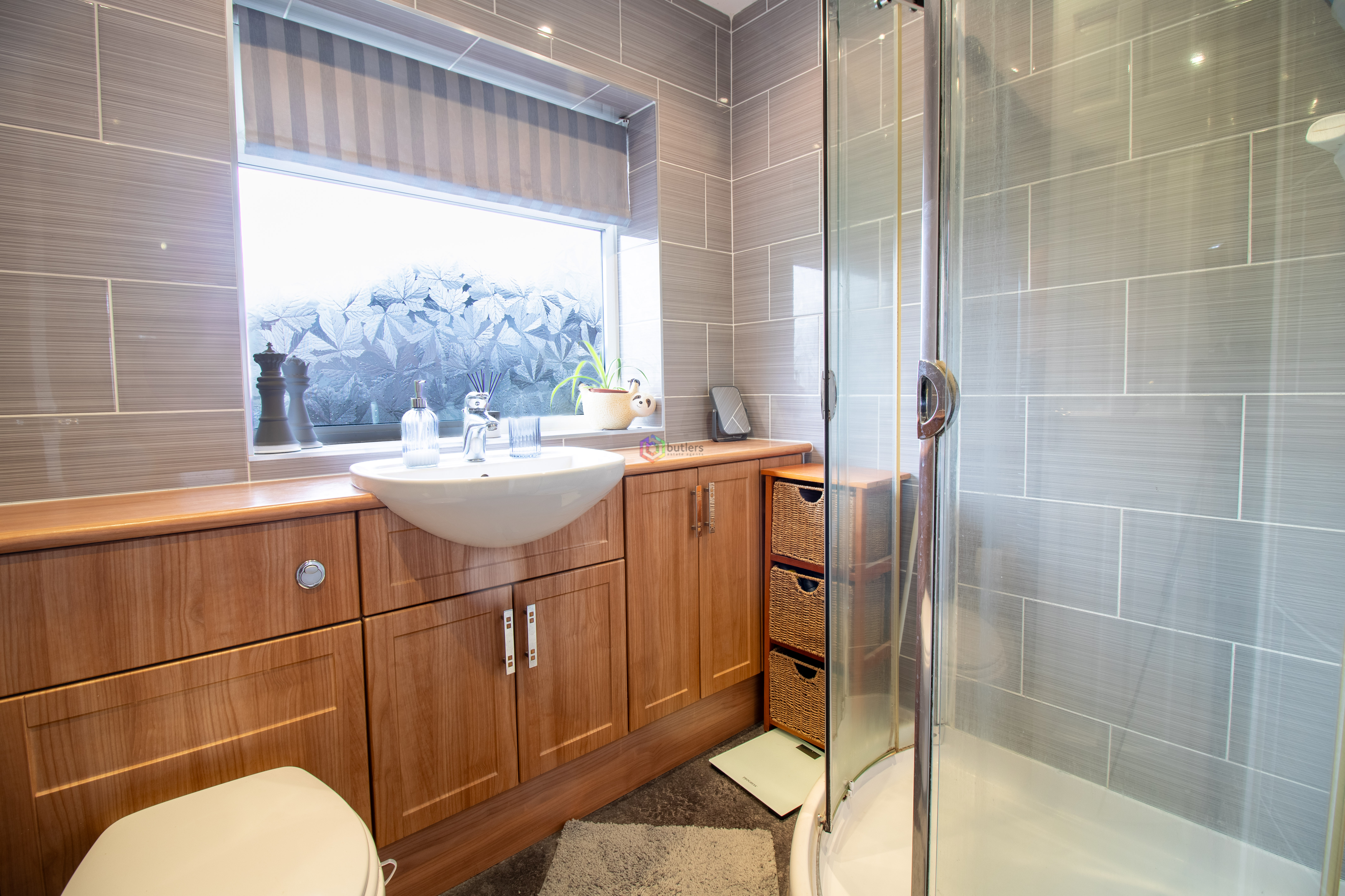 Again enjoying the space created by the extensions to the property this shower room could be an en-suite or simply a second bathroom to a growing family. No more battles in the morning rush hour with this corner shower cubicle, the vanity unit has a white wash hand basin and a white WC below the rear facing window.