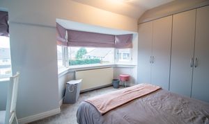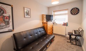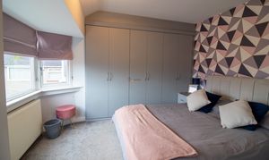 What an amazing space created when the house was redesigned at the time of the extension. Now having fitted wardrobes to one wall of the room, the large bay window provides great light to the room along with the single window next to an area currently used as a dressing table. A super place to unwind on an evening.
