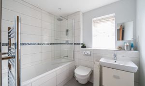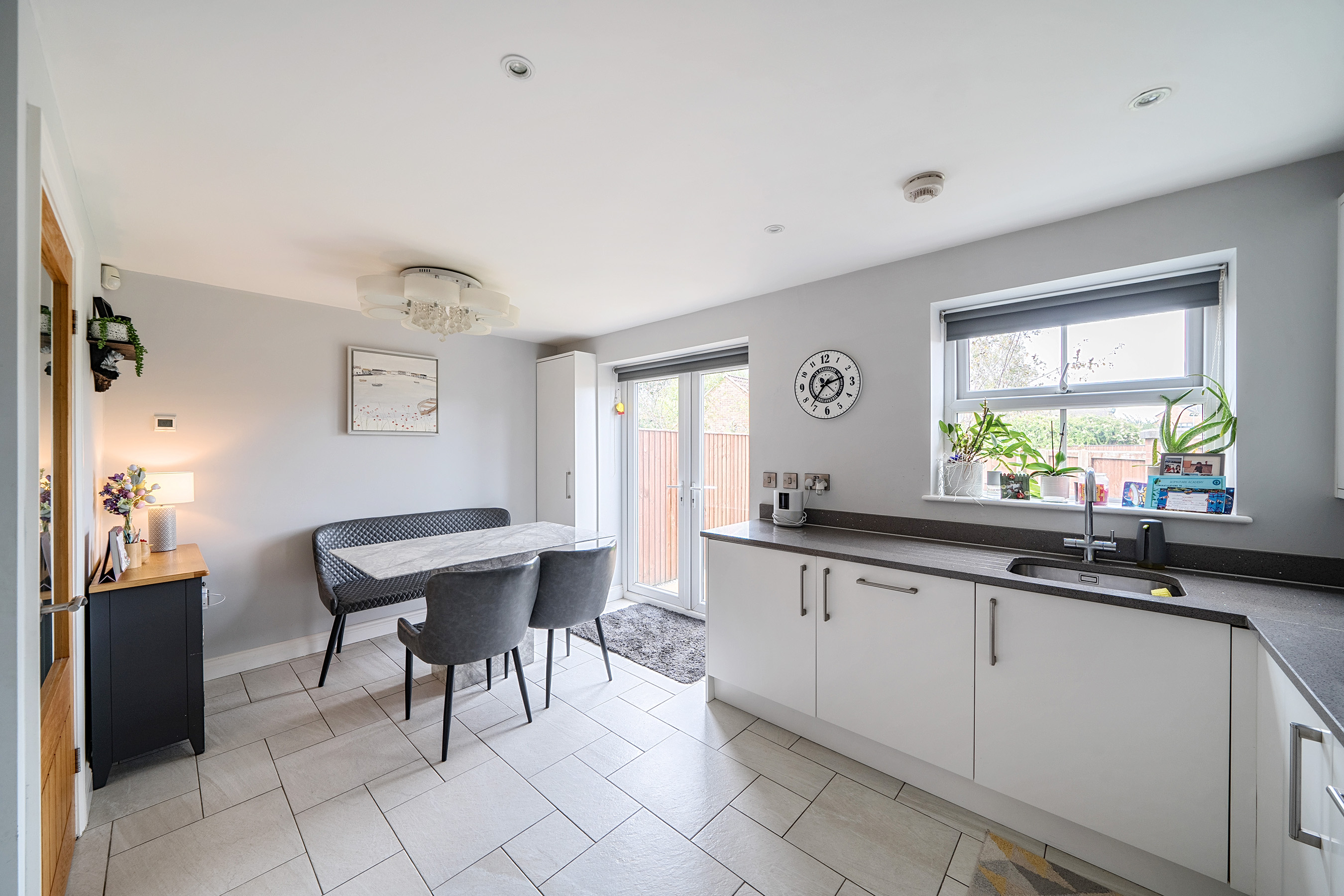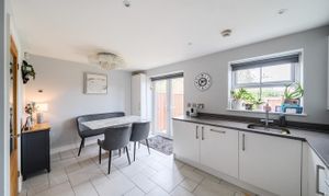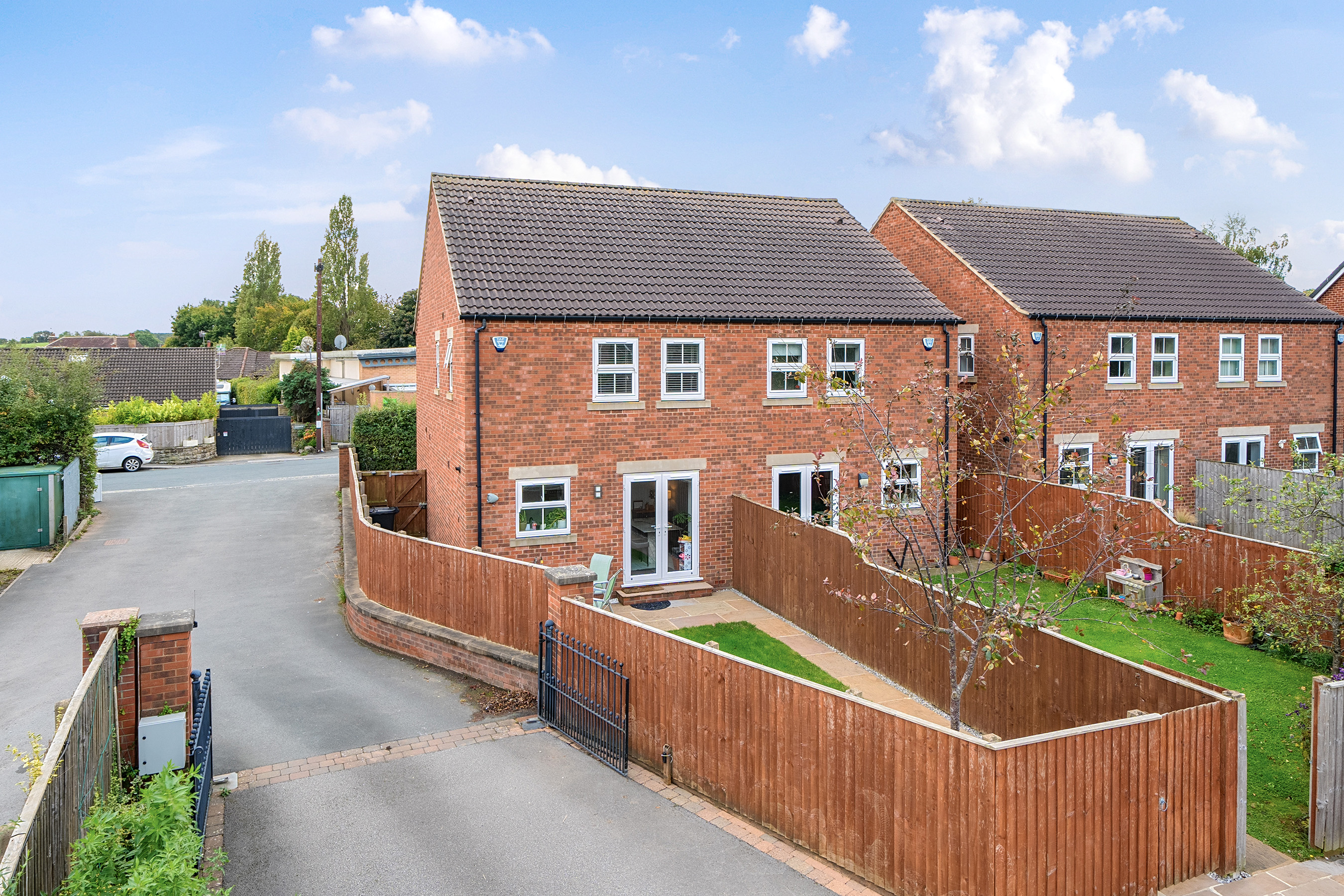 Fronted by an attractive lawn garden with hedged boundary, the accommodation with under floor heating to the entire ground floor opens via a covered entrance to a hall with guest w/c and space for cloak hanging. The spacious sitting room to the front elevation has a feature fireplace and access to the useful under stairs storage. An inner hall leads through to the impressive dining kitchen which boasts modern units with integrated appliances, granite work surfaces and tiled floor. French doors open out to the securely enclosed garden which is mainly laid to lawn, and beyond the garages is an additional outdoor space belonging to the property which presents a flagged patio area with sunken lighting ideal for outdoor entertaining or use as an additional parking space. There is also another piece of garden belonging to the property behind the garage building. The parking area and garage, with storage space above, is secured by remotely operated electric gates. To the first floor, the central landing branches to a stylish house bathroom with over bath shower and under floor heating, and three bedrooms all with built in wardrobes, the main bedroom having an en-suite shower room also with under floor heating.