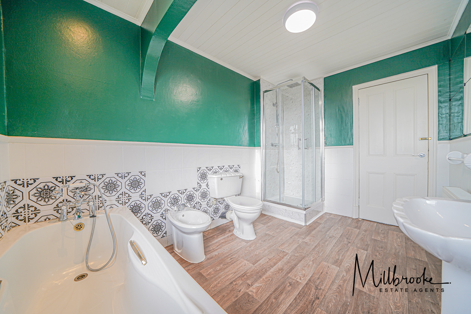 To the first floor is a spacious master bedroom, second double bedroom, third bedroom and a larger than average, five piece bathroom with separate shower.