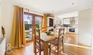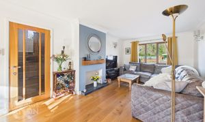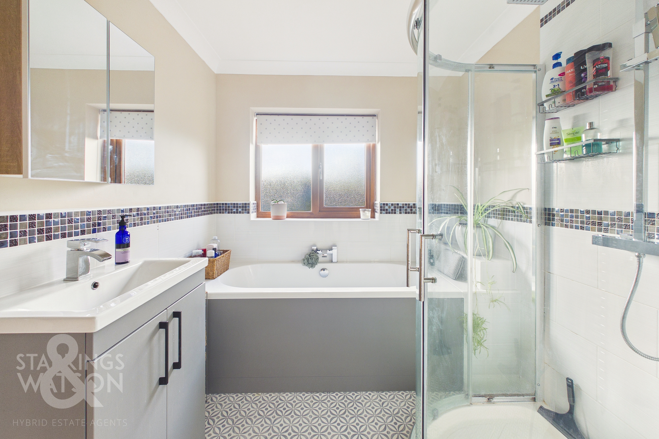 The first floor landing splits in each direction to take you into each of the three double bedrooms as well as the recently renovated four piece family bathroom suite and built in storage cupboard. The first two double bedrooms come towards the front of the home with the slightly smaller bedroom, currently functioning as a home office space. The largest of the bedrooms sits just next door to this, a well proportioned double bedroom laid full carpeted flooring leaving more than enough room for further soft furnishings and storage solutions. A third double bedroom is located at the very rear of the home overlooking the gardens with bespoke fitted wall to wall mirrored wardrobes set upon carpeted flooring with further built in storage cupboard leading towards the landing. The current owners have fully modernized the four piece family bathroom suite creating the ideal space for modern living where a separate shower and bath are on offer with tall wall mounted heated towel rail, vanity storage and a predominantly tiled surround