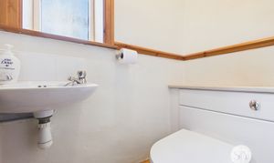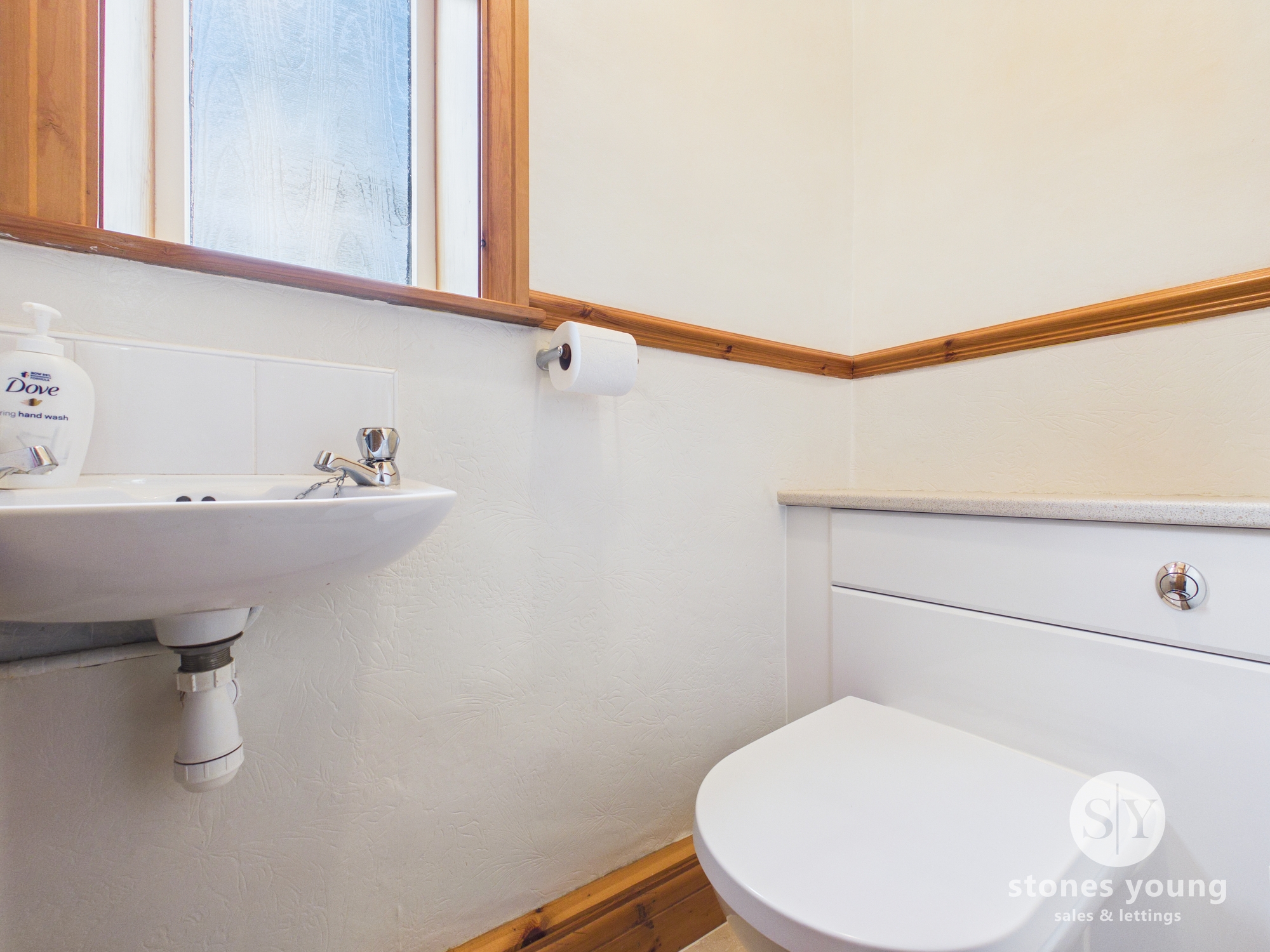 Tiled flooring, two piece in white comprising of wc and basin, tiled splash backs, frosted double glazed uPVC window.