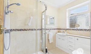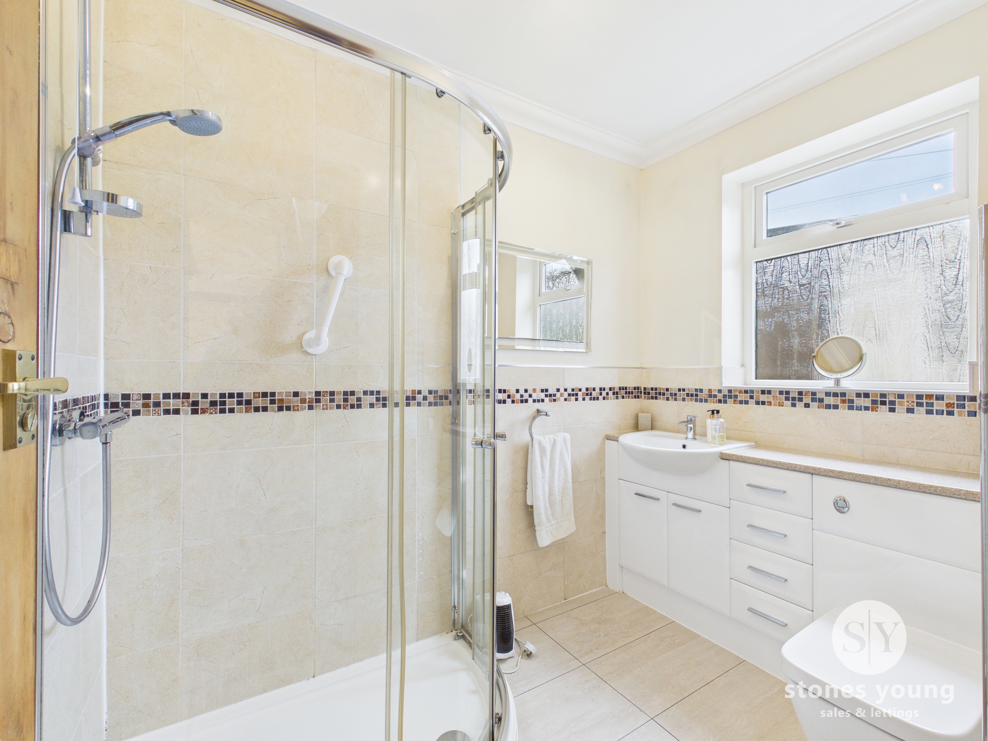 Tiled flooring, three piece in white comprising of mains fed shower enclosure, wc and basin housed in vanity, tiled splash backs, frosted double glazed uPVC window, towel radiator.