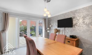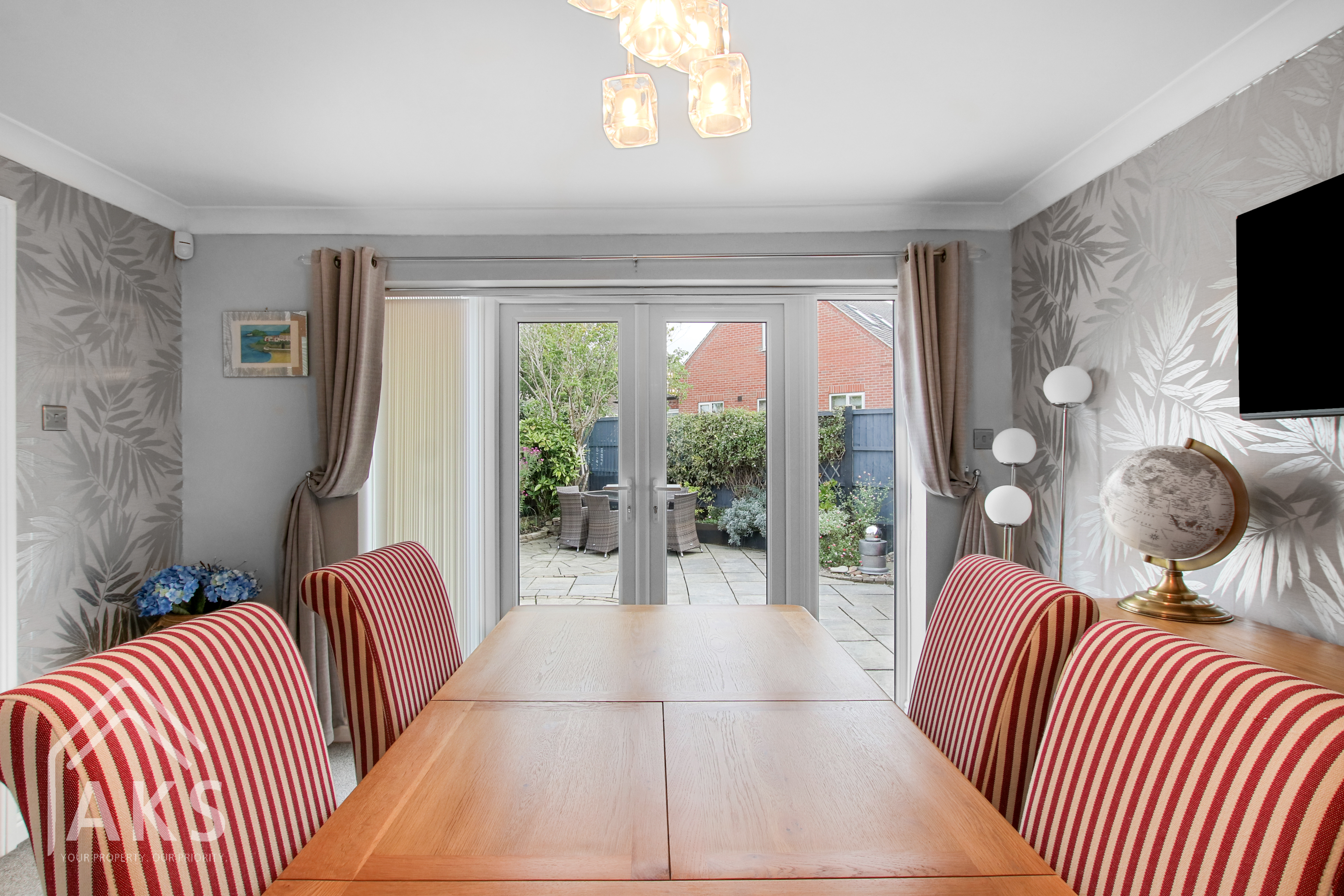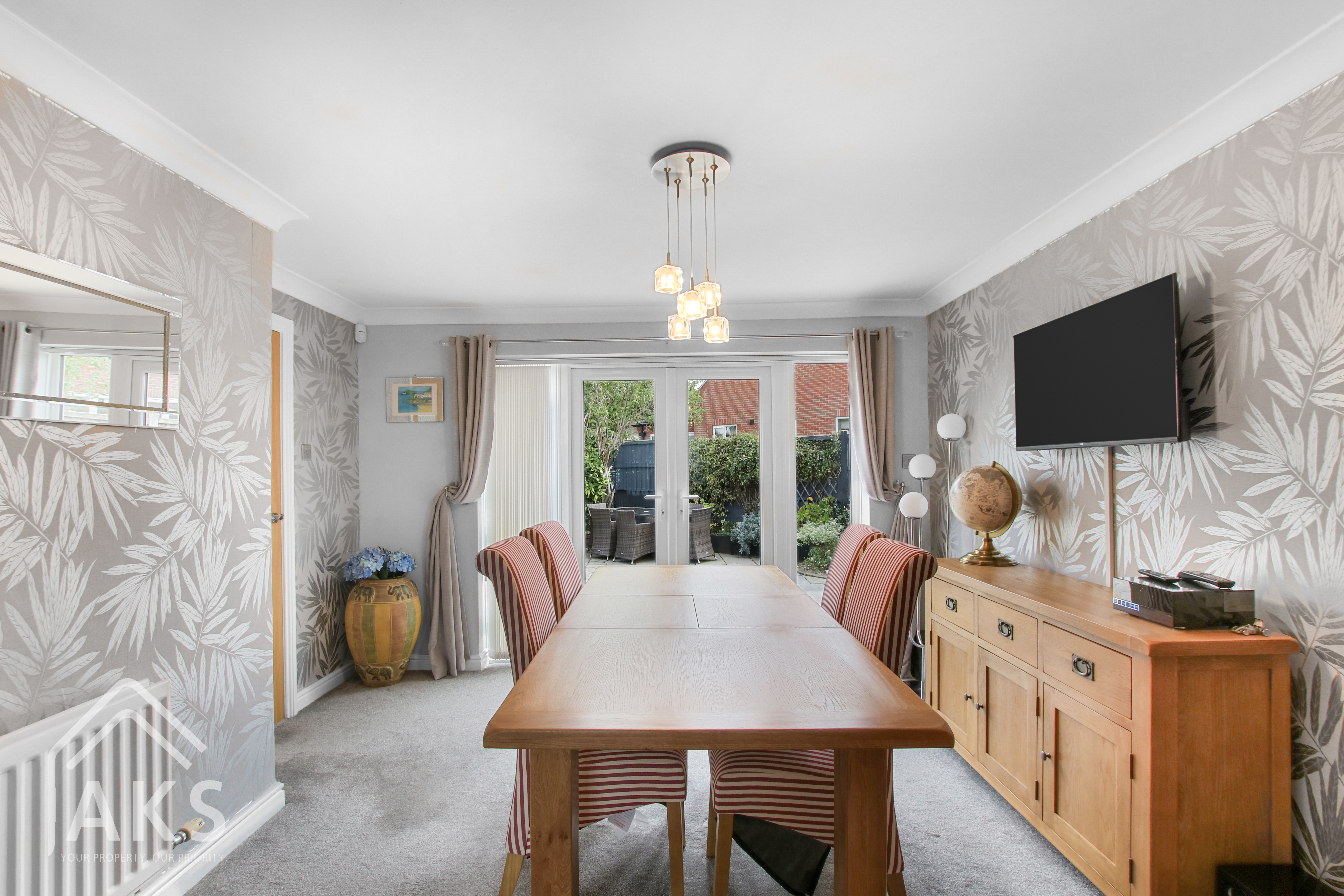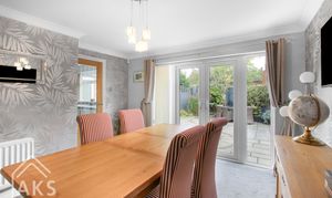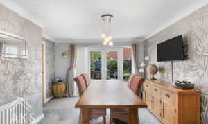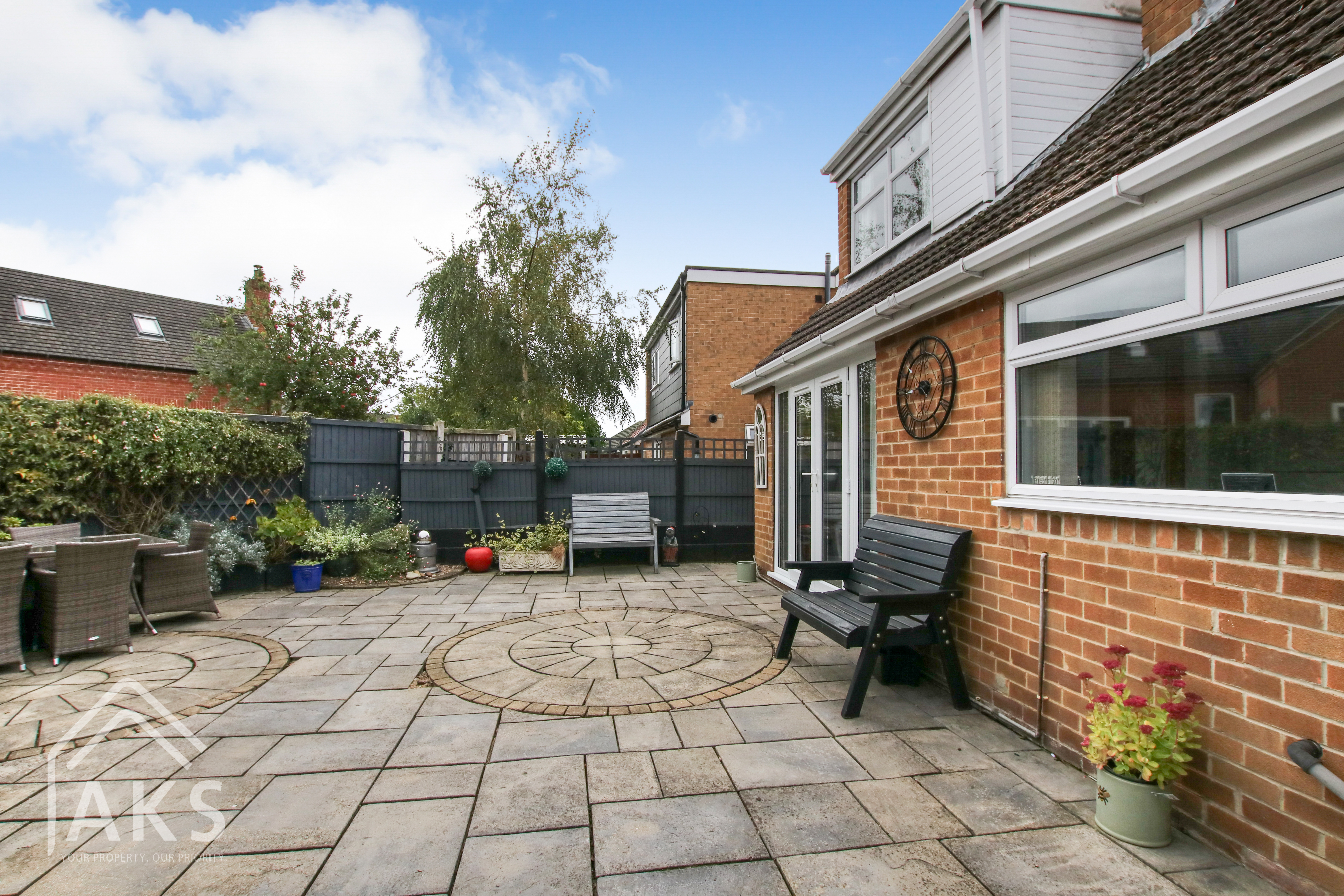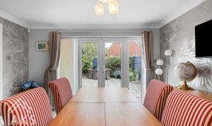 “This home has been modernised throughout, with new windows and doors as well as some beautiful internal fixtures and fittings. As you enter the house, the hallway is filled with natural light from the lovely feature of two skylights. The hallway then continues around the corner leading to all the downstairs rooms and under-stairs storage. The kitchen is a fantastic size with space for a small breakfast table and plenty of worktop space. There are integrated appliances including fridge-freezer, dishwasher, oven and microwave. Access to the large double garage is from a door off the kitchen. Leading to the back door there is a lean-to giving extra storage space or utility area. The lounge is light and spacious having a large bay window to the front and has a feature fireplace and surround. With newly fitted oak/glass doors through to the dining area which has space for a large table and sliding doors onto the patio of the rear garden. There is also a door giving access to the kitchen.