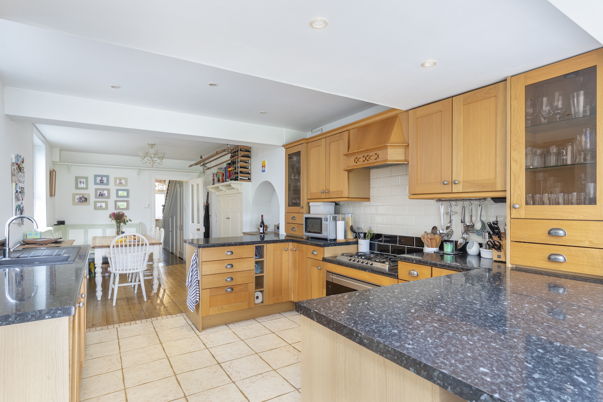 At the centre, the bespoke oak kitchen combines timeless craftsmanship with practicality. Solid wood cabinetry offers abundant storage, while the dark worktops provide generous preparation space. Integrated appliances include a hot water tap and a 5-ring gas hob to name a few, and tiled flooring give the space a durable and functional feel, perfectly suited to busy family life.