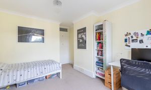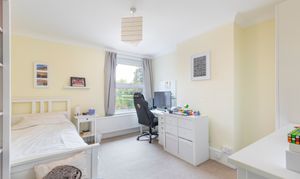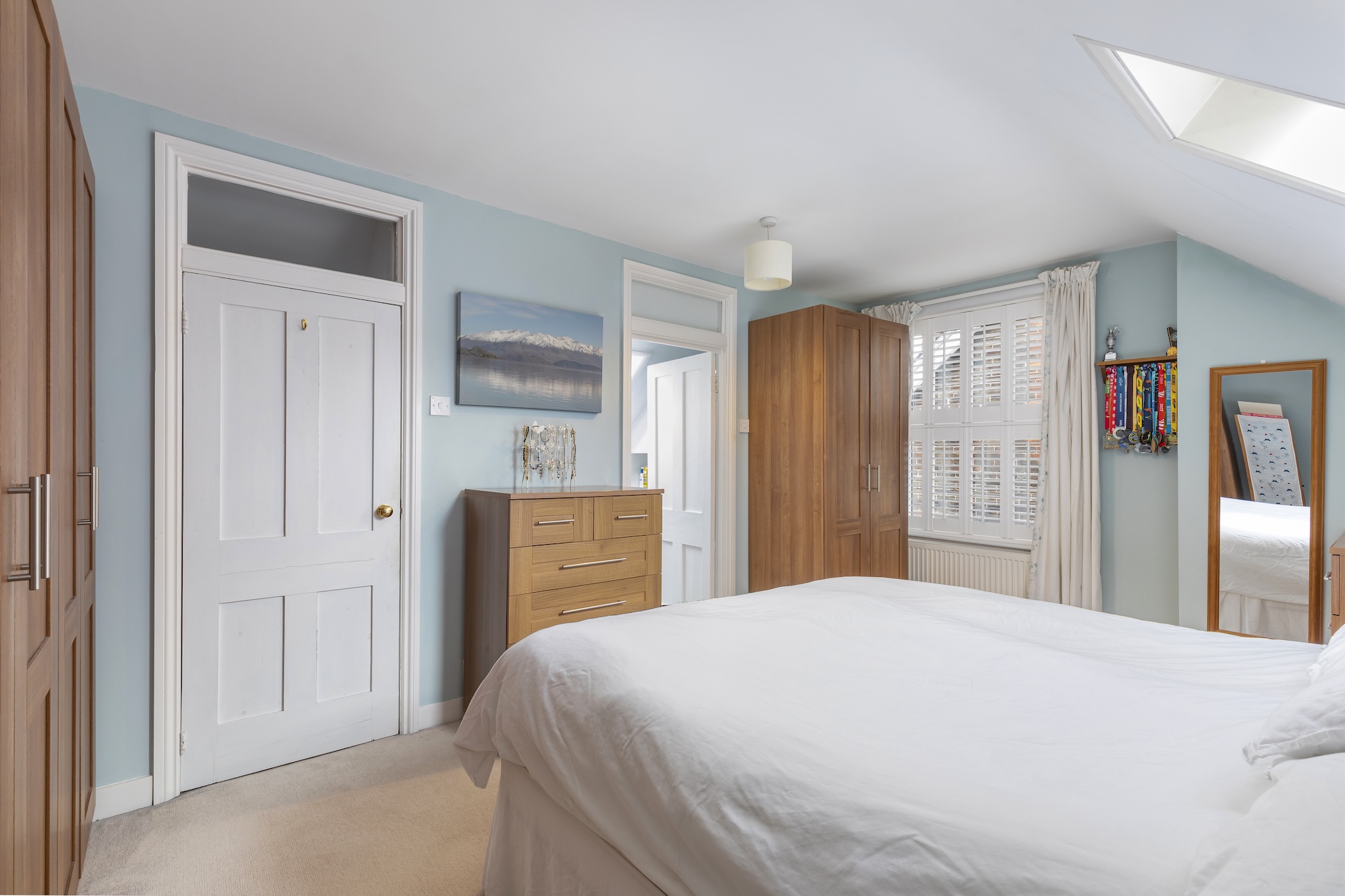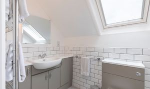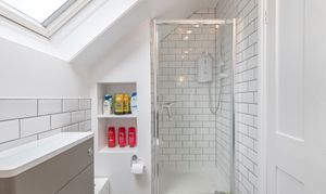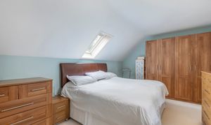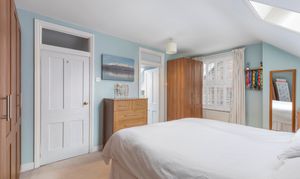 The top floor hosts a peaceful principal suite, offering privacy and a wonderful sense of calm. This bright and airy double bedroom features dormer and skylight windows, generous storage, and soft tones that create a restful retreat. The en suite shower room is sleek and modern, finished with stylish tiling and a large rooflight that bathes the room in daylight. A large dressing room can be found off the half landing which conveniently leads to eaves storage.