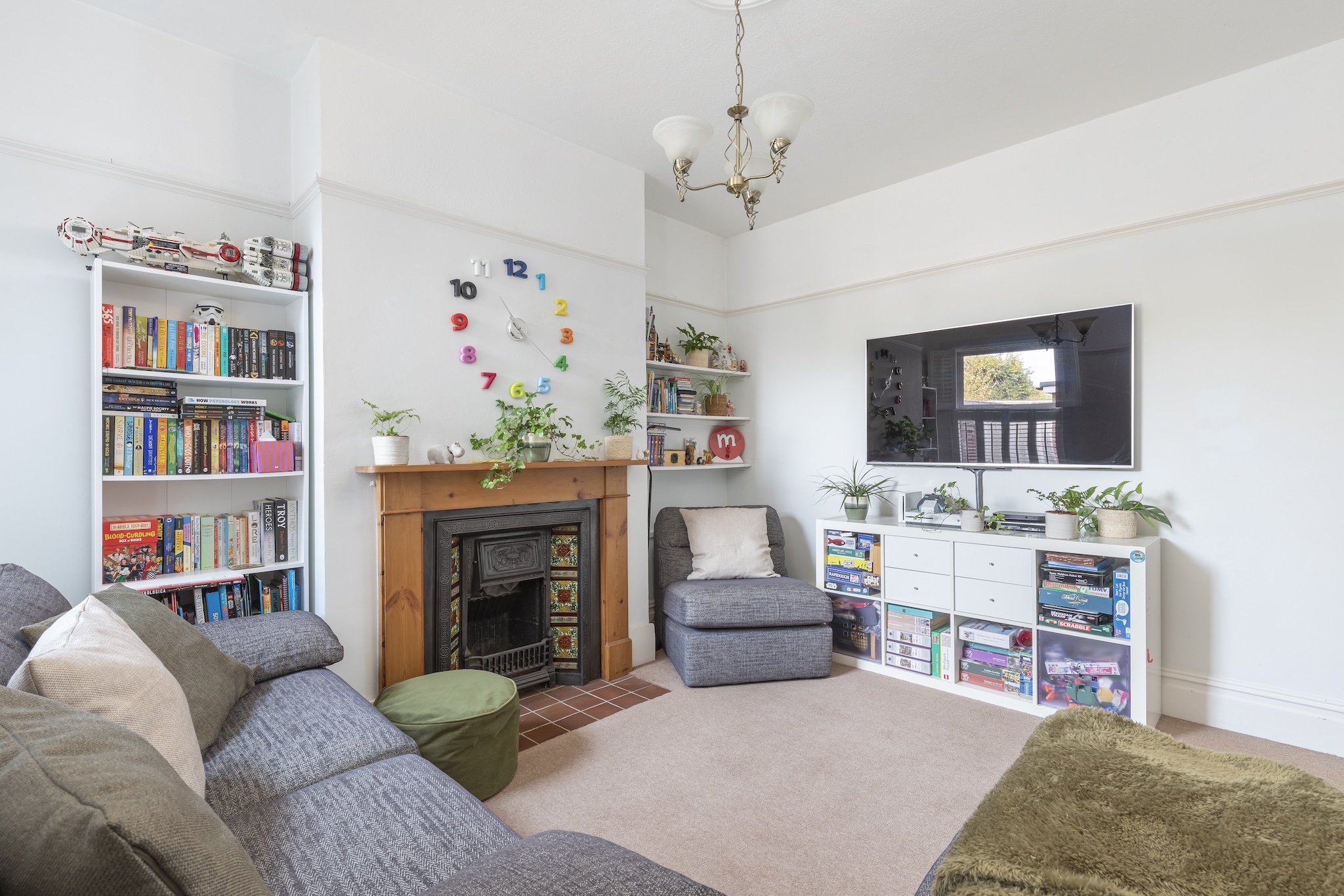 The second reception room offers a cosy retreat, ideal as a family snug or study, complete with another original working fireplace, bespoke floating shelving and contemporary plantation shutters.