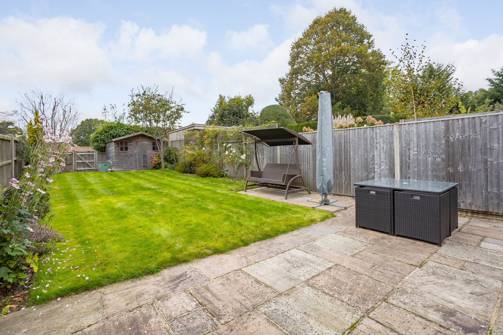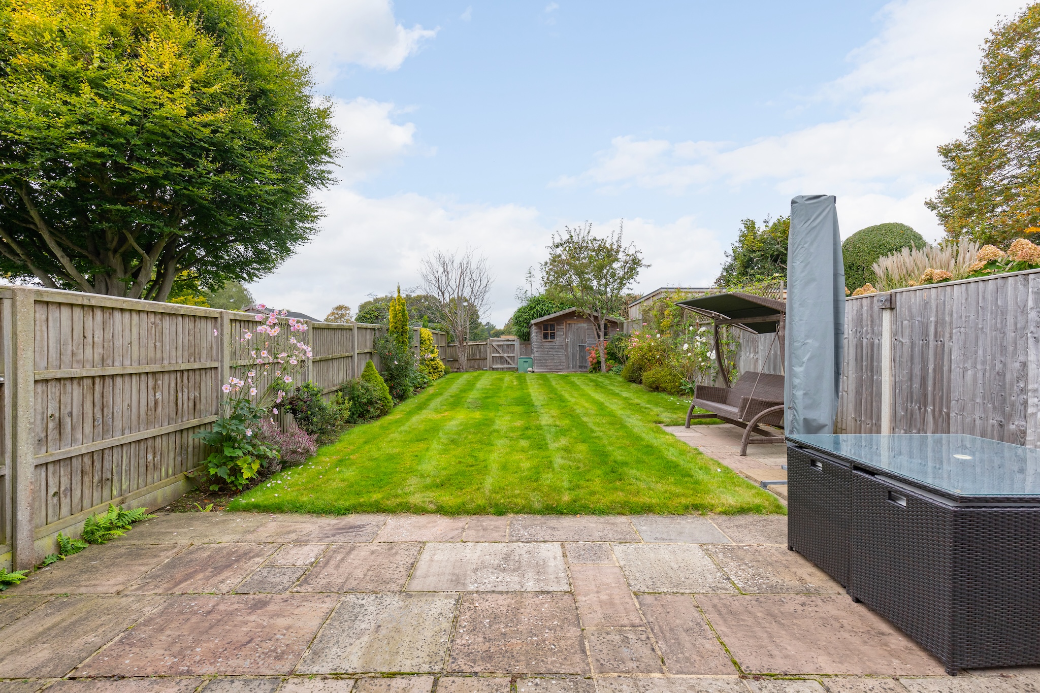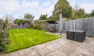 Large rear garden mainly laid to lawn with established planting around the outside, a garden shed to the rear and patio off the garden room. There is a gate taking you directly on to Hickmans Lane Recreation Ground.