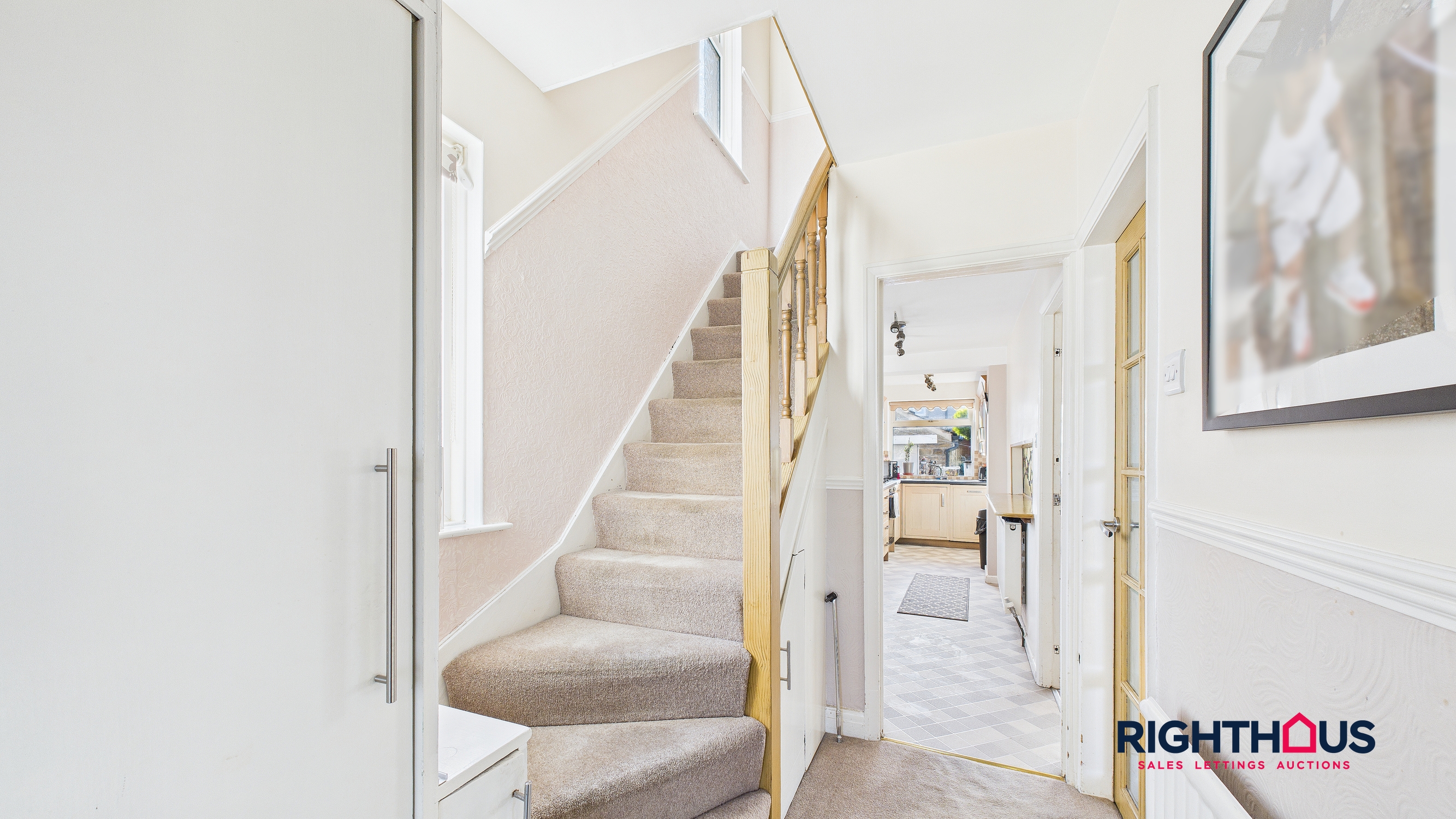 With part glazed inner uPVC door, useful storage cupboard and staircase rising to first floor level.