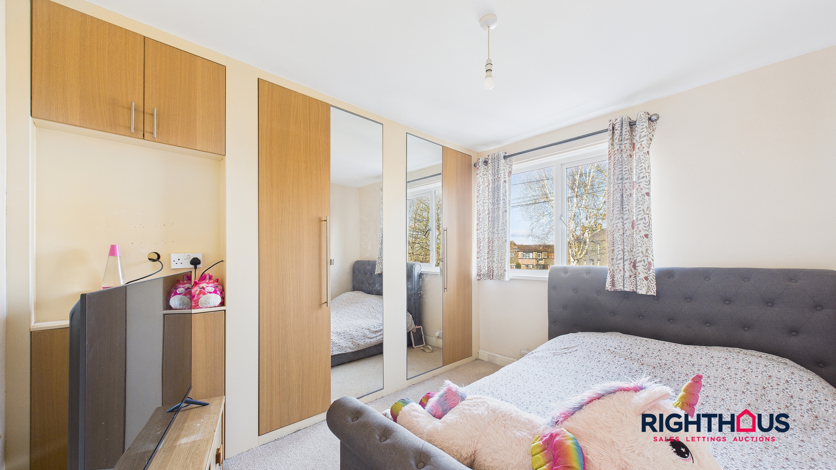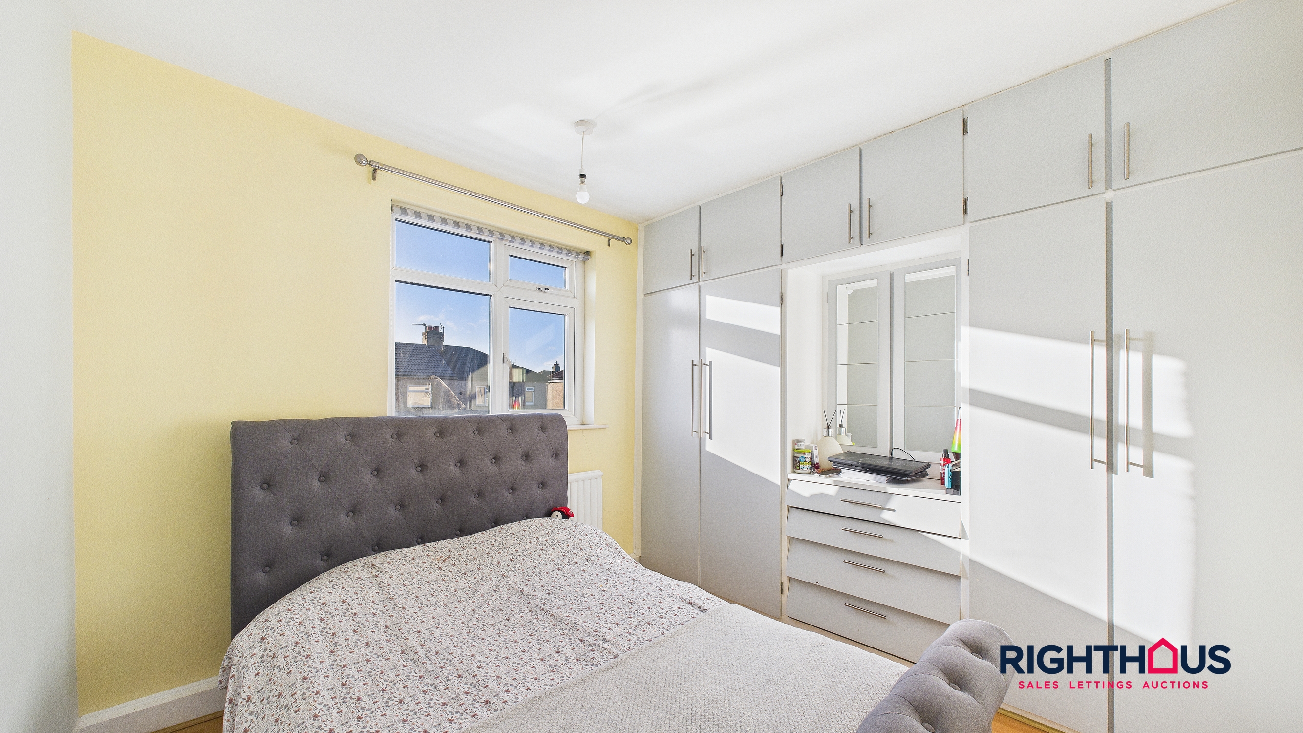 Double bedroom having a front facing aspect having fitted wardrobes and in built storage.