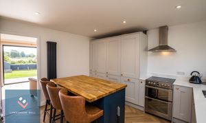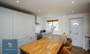 This modern and recently fitted kitchen boasts a range of wall and base units with quartz work surface over and an island unit with solid wood butcher's block work surface/breakfast bar. Integrated appliances including fridge/freezer and washing machine. Provision for freestanding cooker with extractor hood over. Wood effect herringbone Luxury Vinyl Tile (LVT) flooring. Double glazed window and door to front. Contemporary vertical radiator.