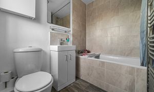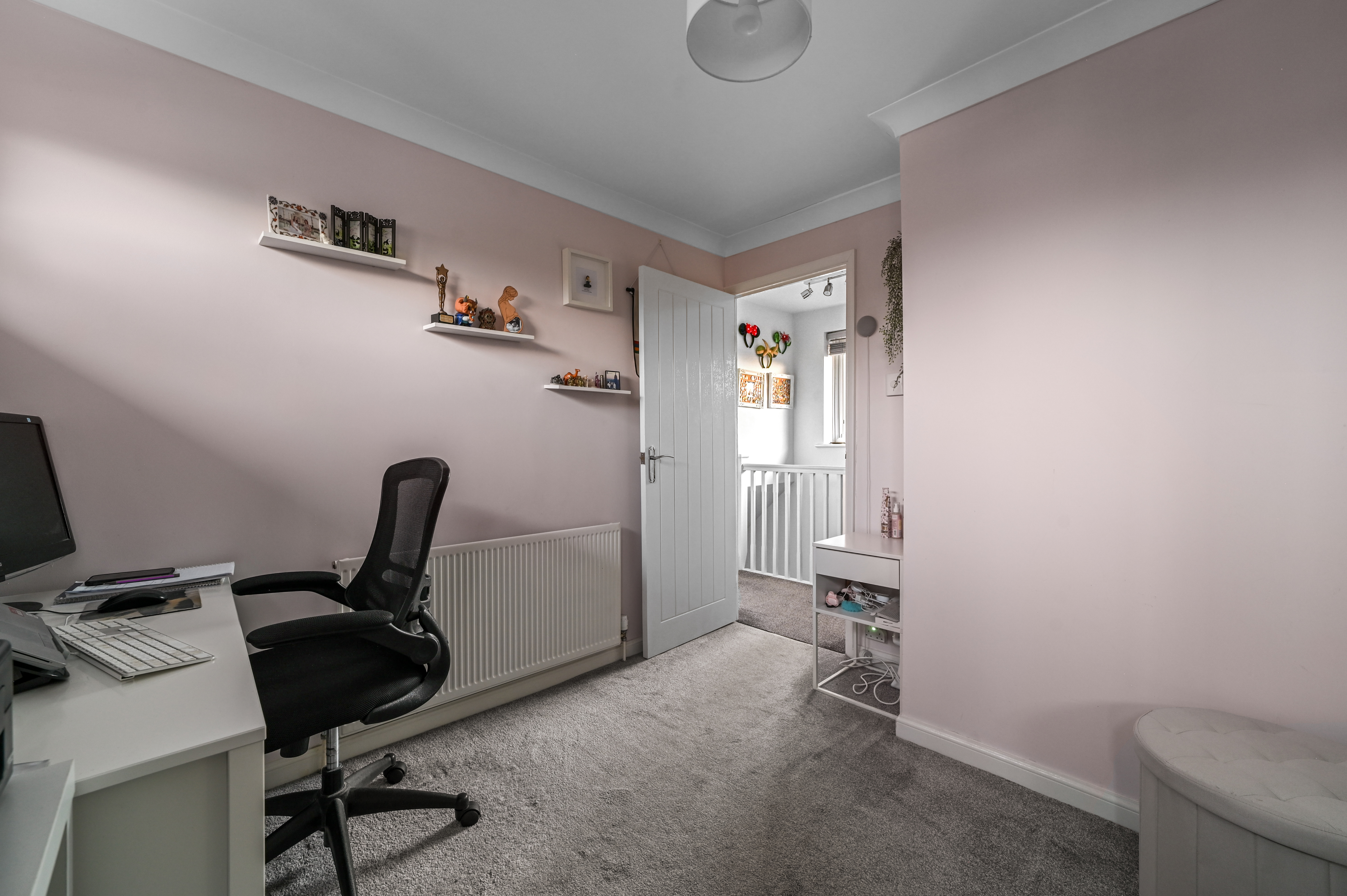 The first floor provides three bedrooms (bedroom two of which has a built-in wardrobe) all positioned off the landing (including airing cupboard and boiler). The contemporary family bathroom offers a three-piece white suite including panel enclosed bath with wall mounted shower attachment, low level WC, vanity wash hand basin and ladder style heated chrome towel rail.